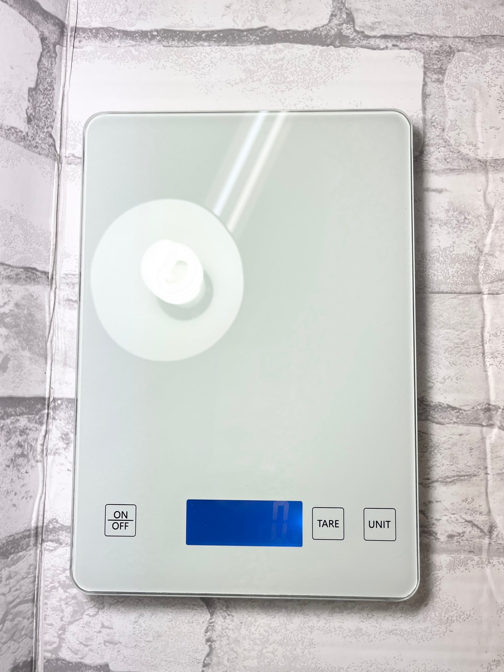 It has a glass top, can be used with either AAA batteries or a cord, unfortunately we don’t have the cord but the port is a very common charger, it works, a kitchen essential! It’s 9” long, 6” wide