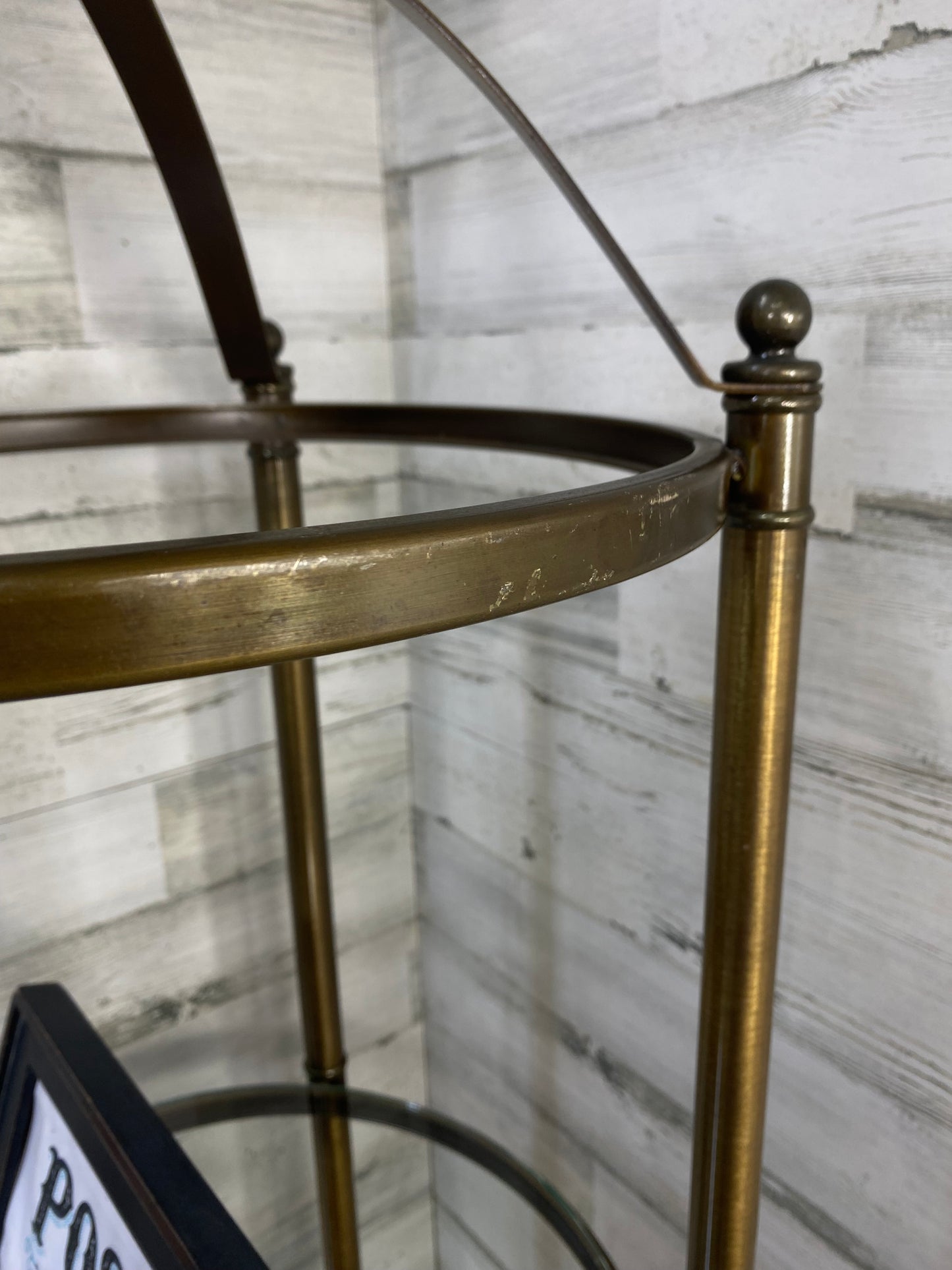 Tall glass and bronze color metal shelf. Great for plants! Some scratches on the metal. Glass is in excellent condition. Very durable and thick.