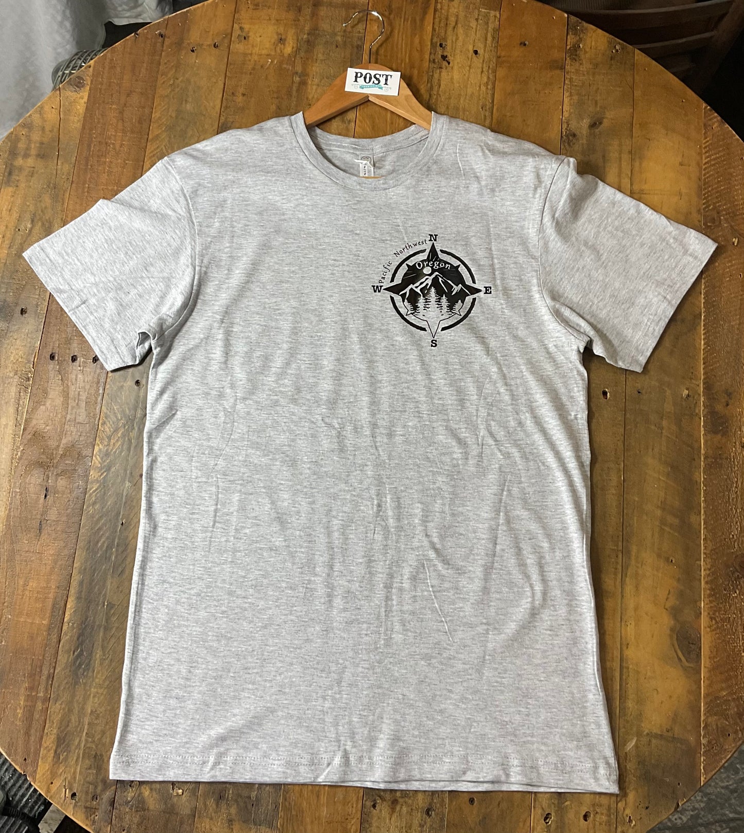 Custom graphic tee. Pacific NW compass Oregon logo in upper corner. Light heathered gray color. 93% soft cotton 7% polyester. High quality comfortable material. Sizes are unisex.