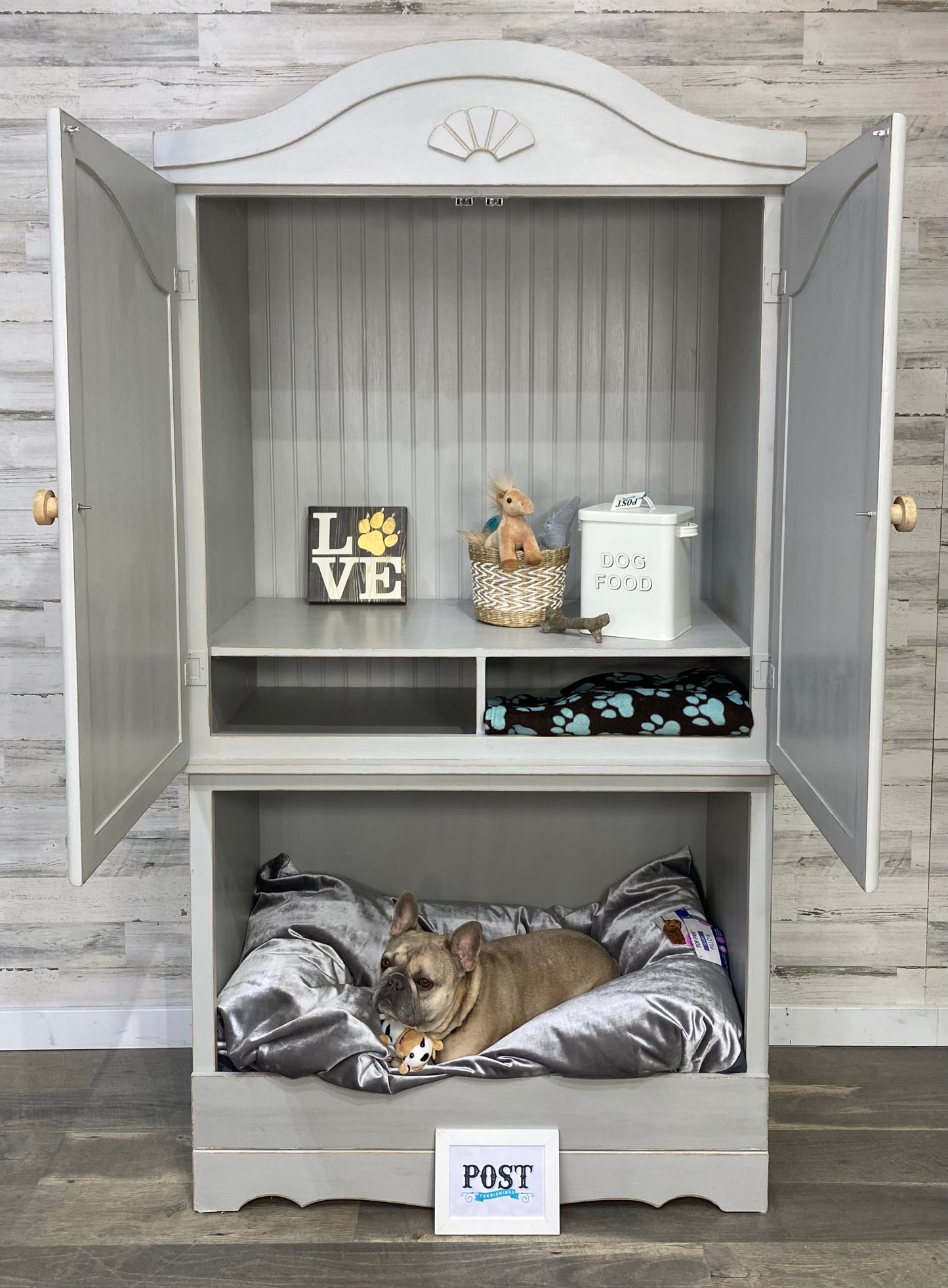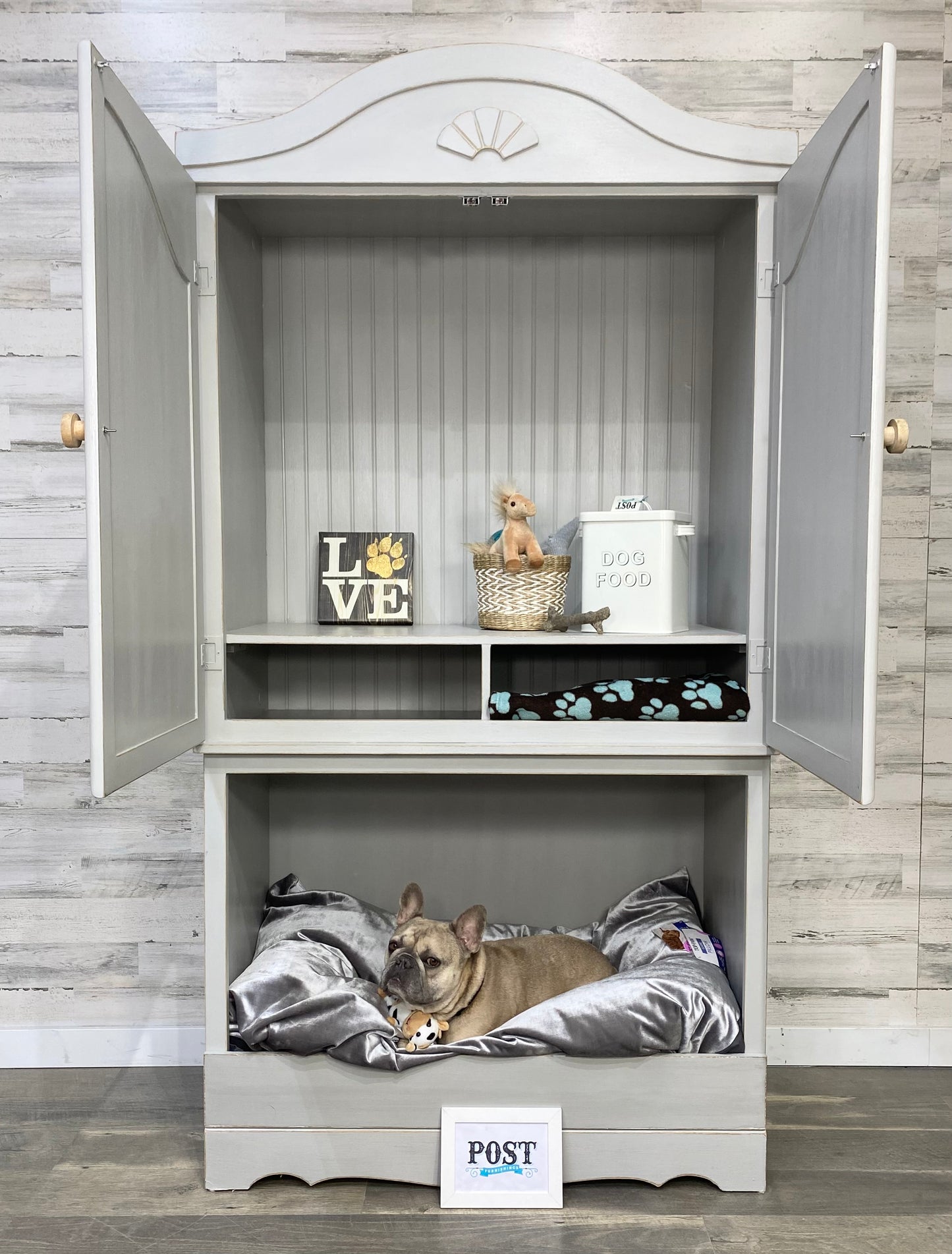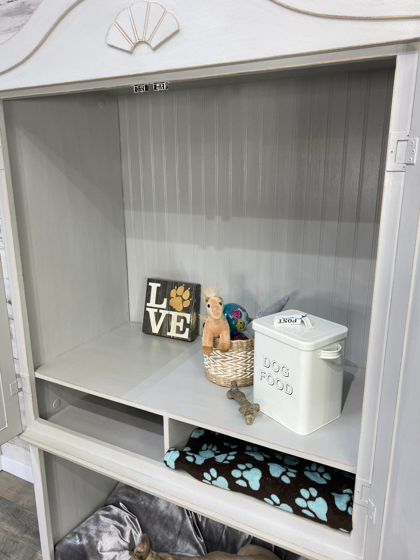 Repurposed this sturdy armoire into a multi functional storage space! Large lower space has a cozy nook for your pet. Above storage area has plenty of space of pet supplies or use as a pantry. Light gray, and lightly distressed. Dog bed not included