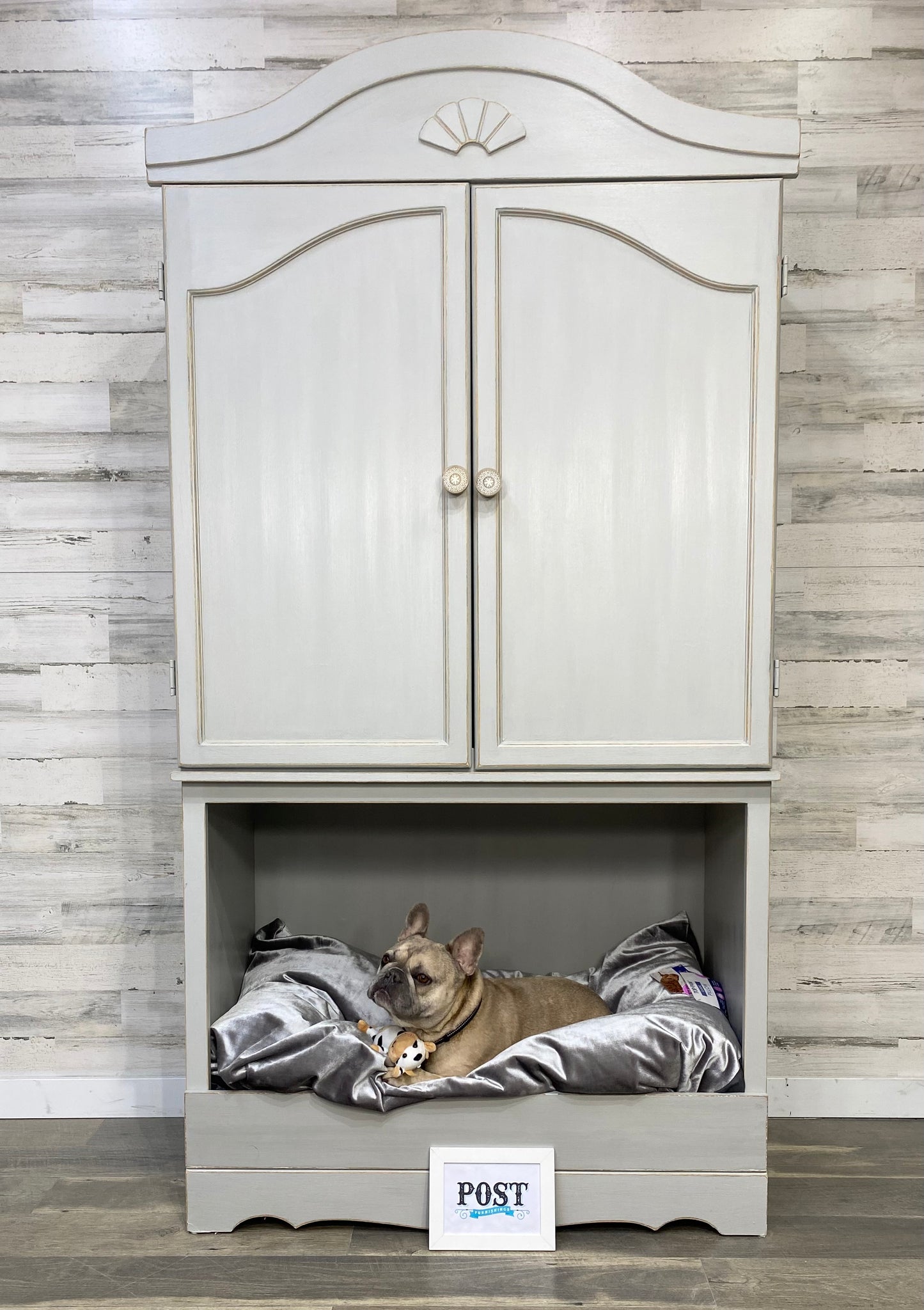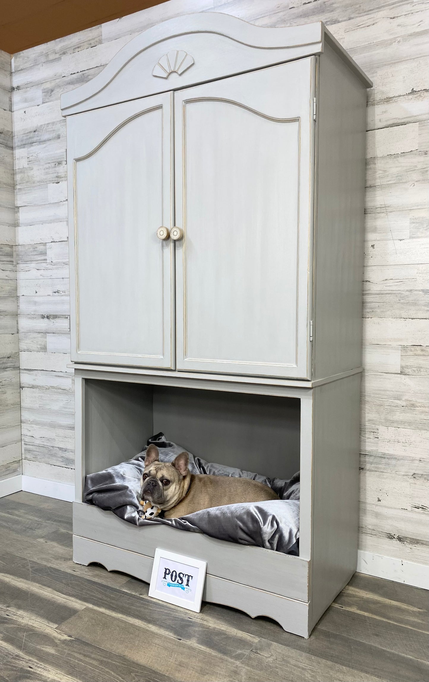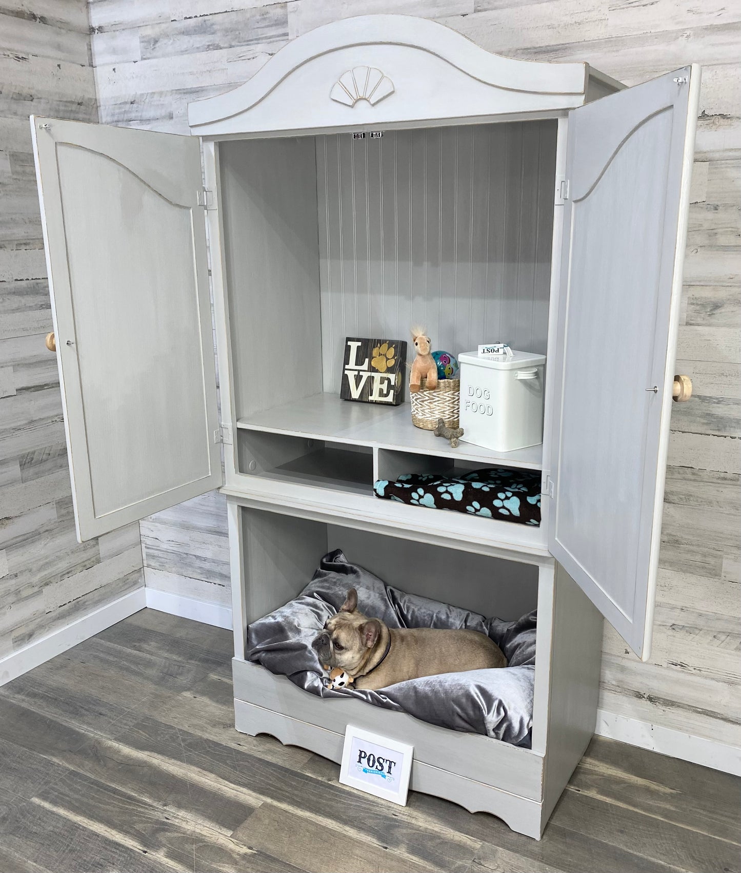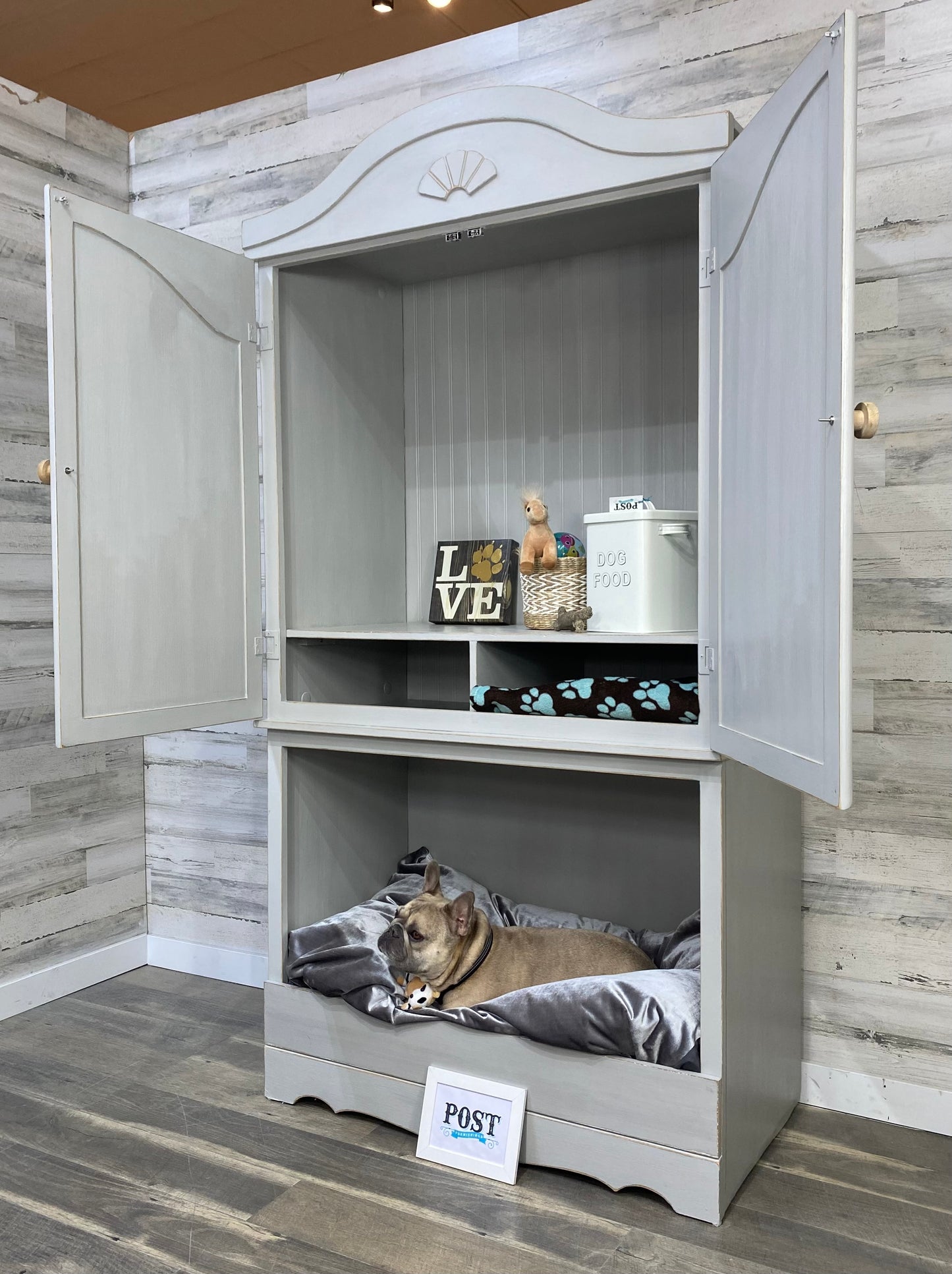 Repurposed this sturdy armoire into a multi functional storage space! Large lower space has a cozy nook for your pet. Above storage area has plenty of space of pet supplies or use as a pantry. Light gray, and lightly distressed. Dog bed not included