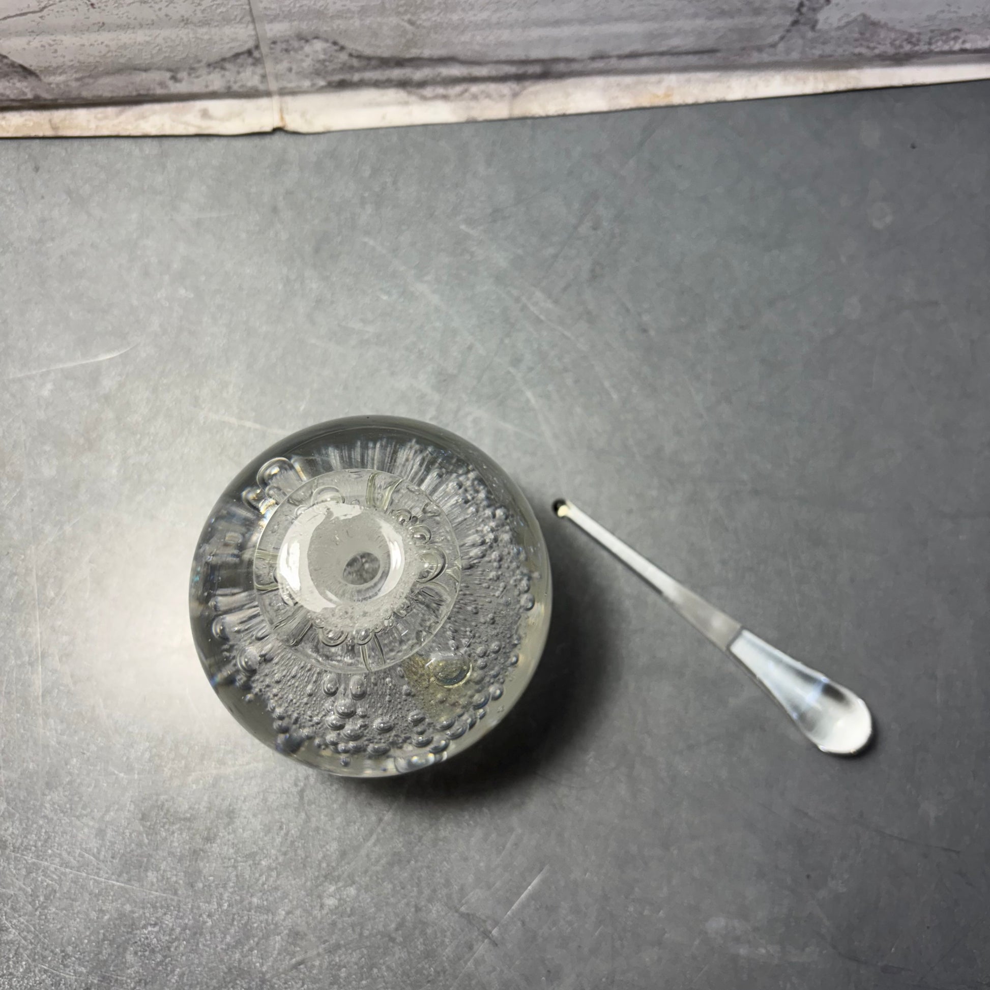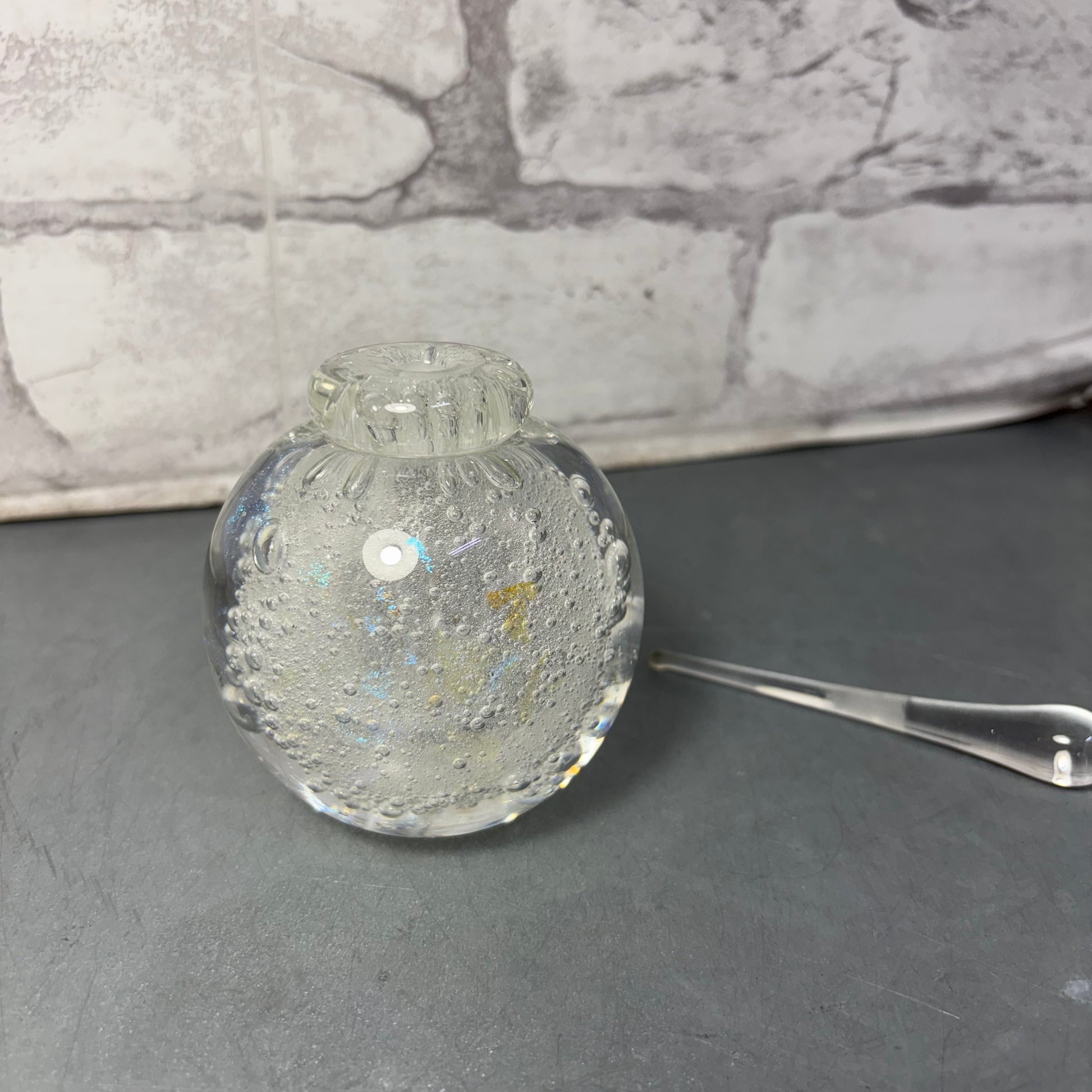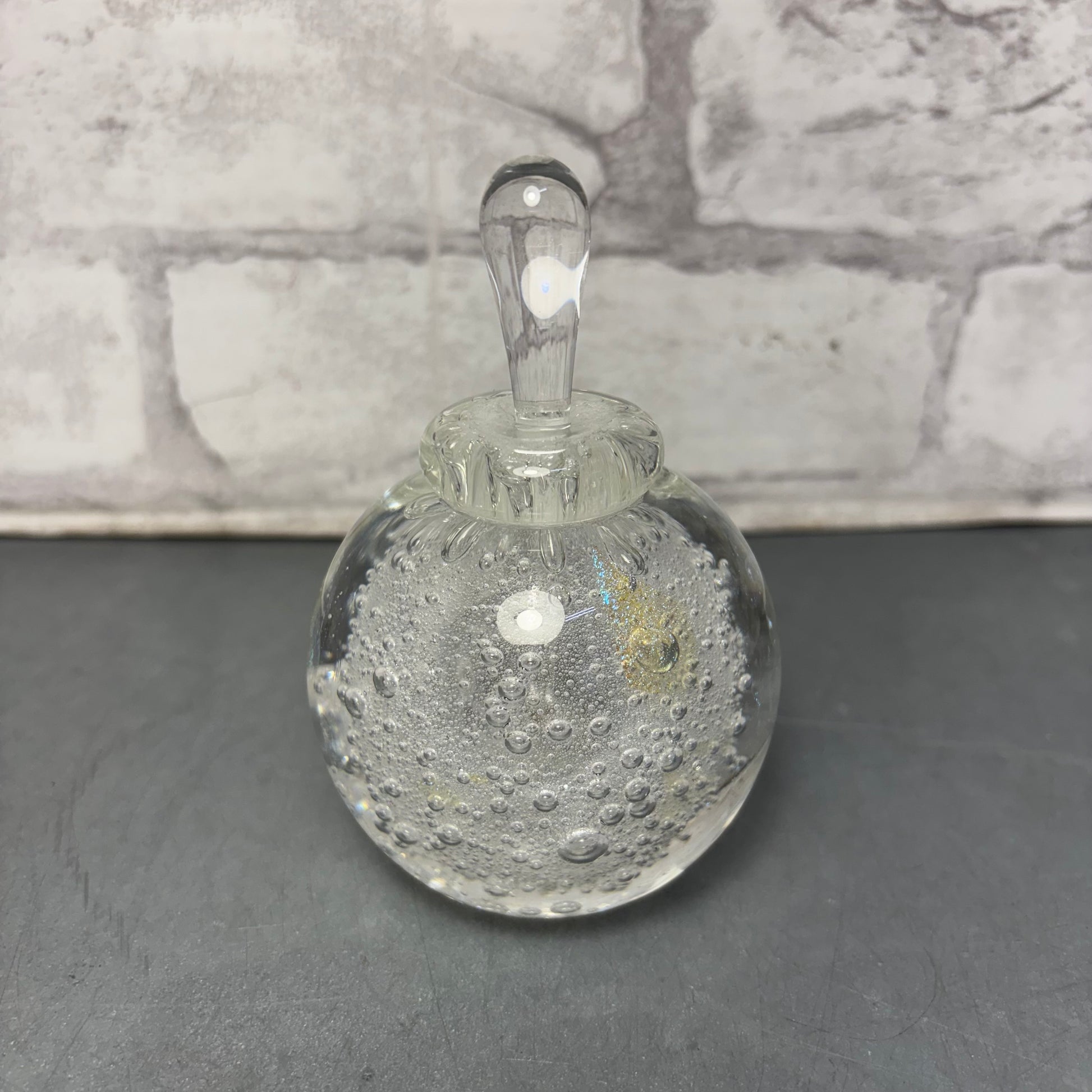 Glass bottle made by Karg Art, clear iridescent with bubble detailing, glass dauber included, bottle is 3” tall, 4.5” tall w/ dauber