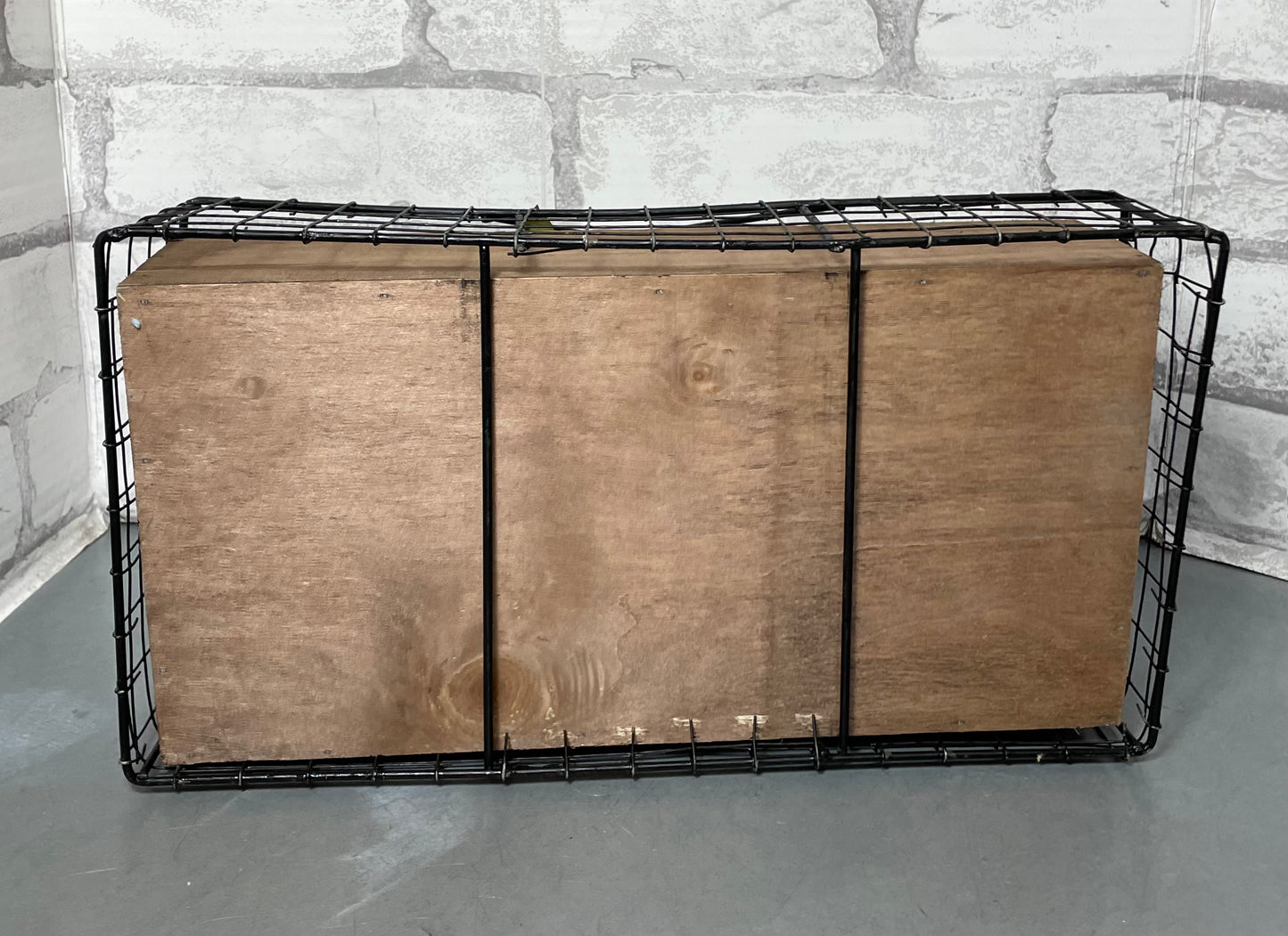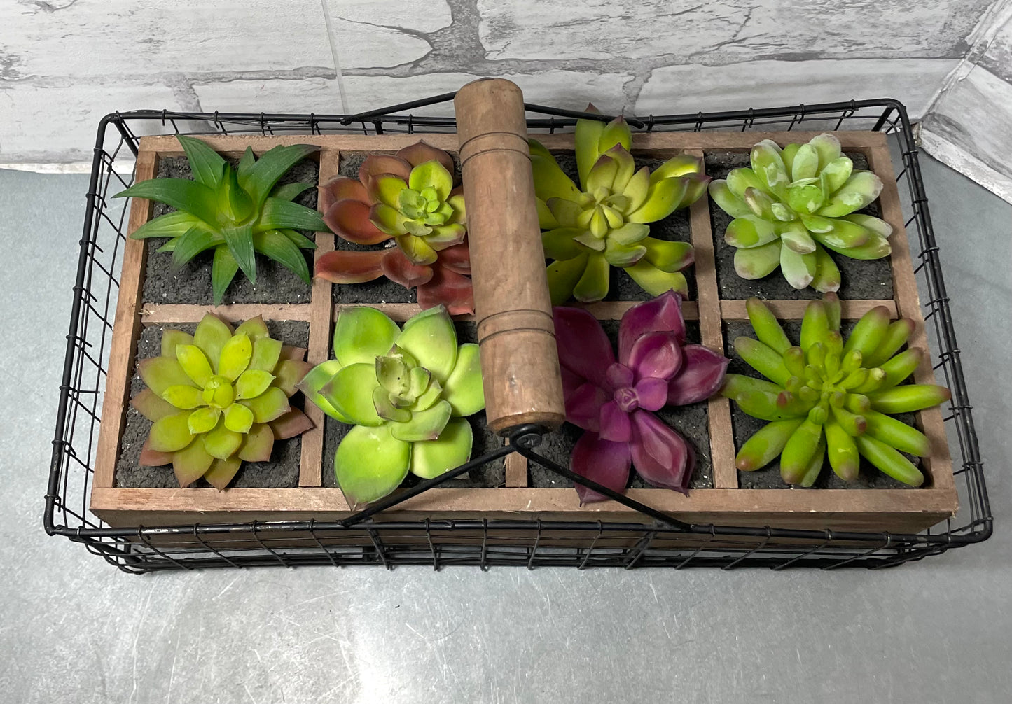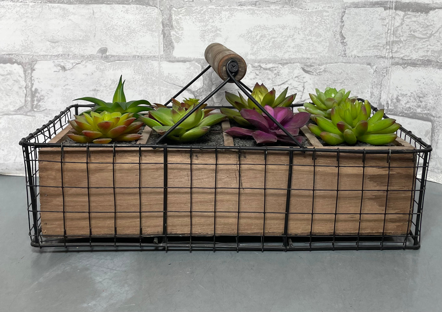 This metal basket with a wooden planter and artificial succulents is an elegant piece of decor