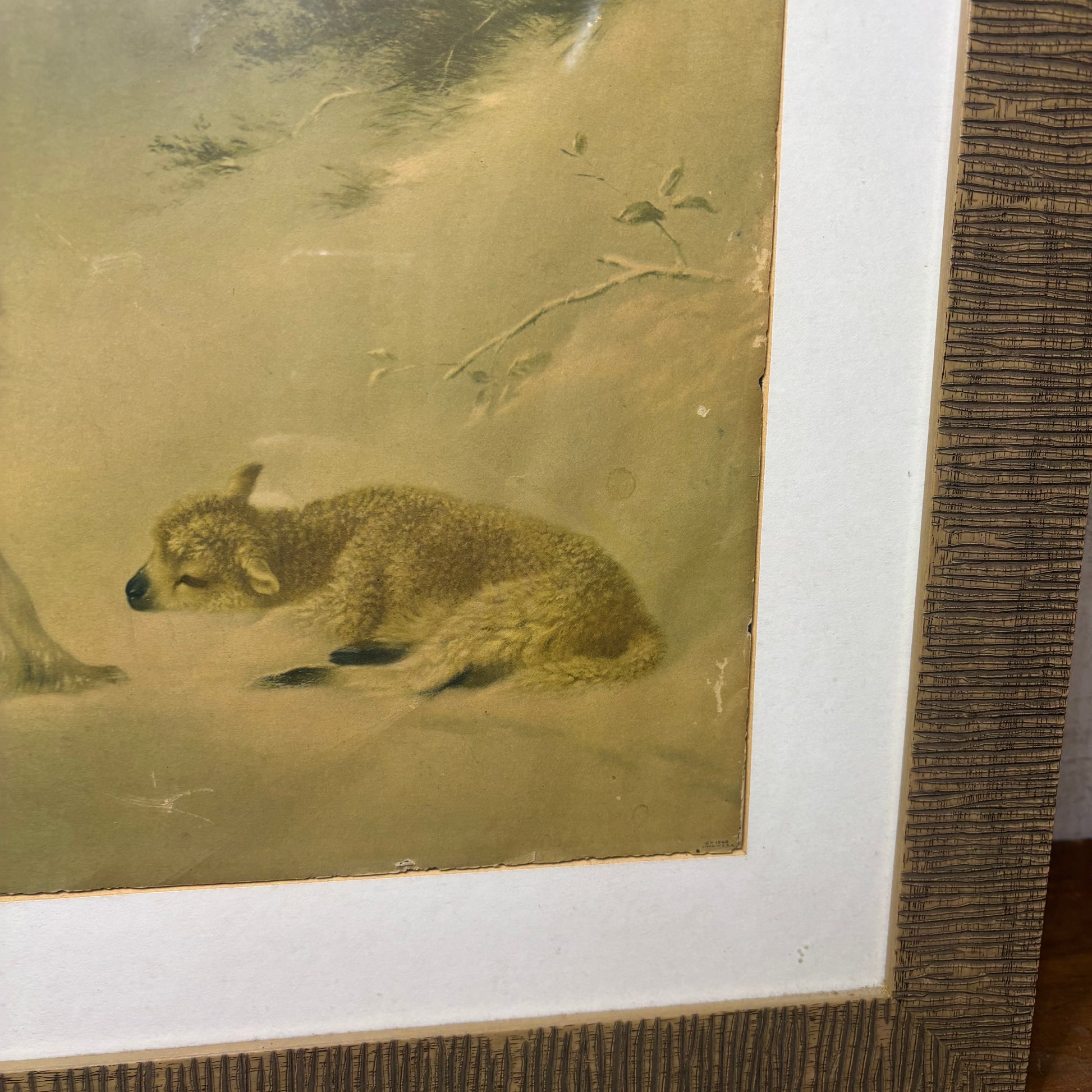 Unique Mid Century Modern lassie collie giving the “Shepherd's Call” to save a baby Lamb framed Art, 19” by 23”