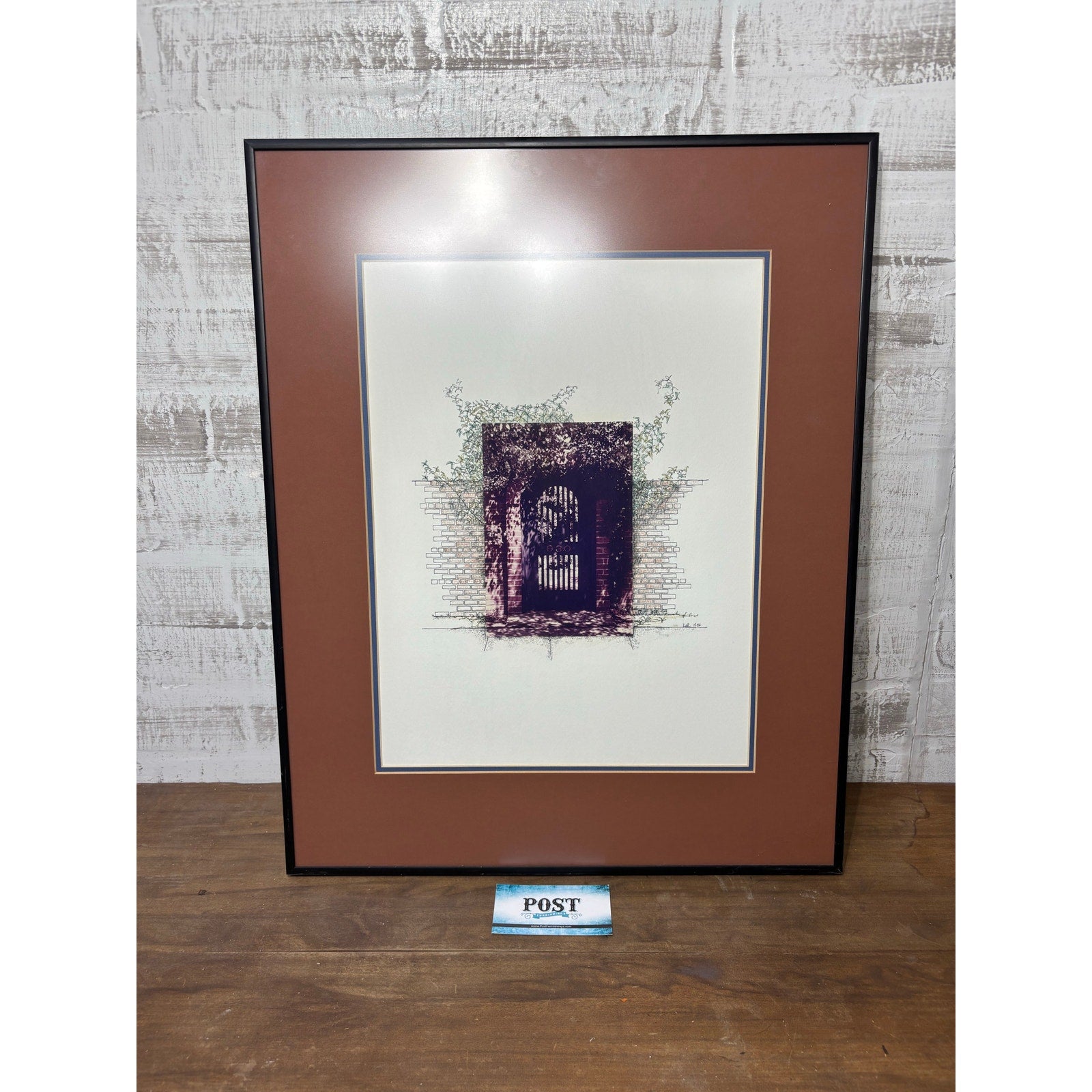 Original artwork by Kak featuring a gate numbered “903” with added pencil details around the image. Presented in a matted metal frame for a clean, modern finish.