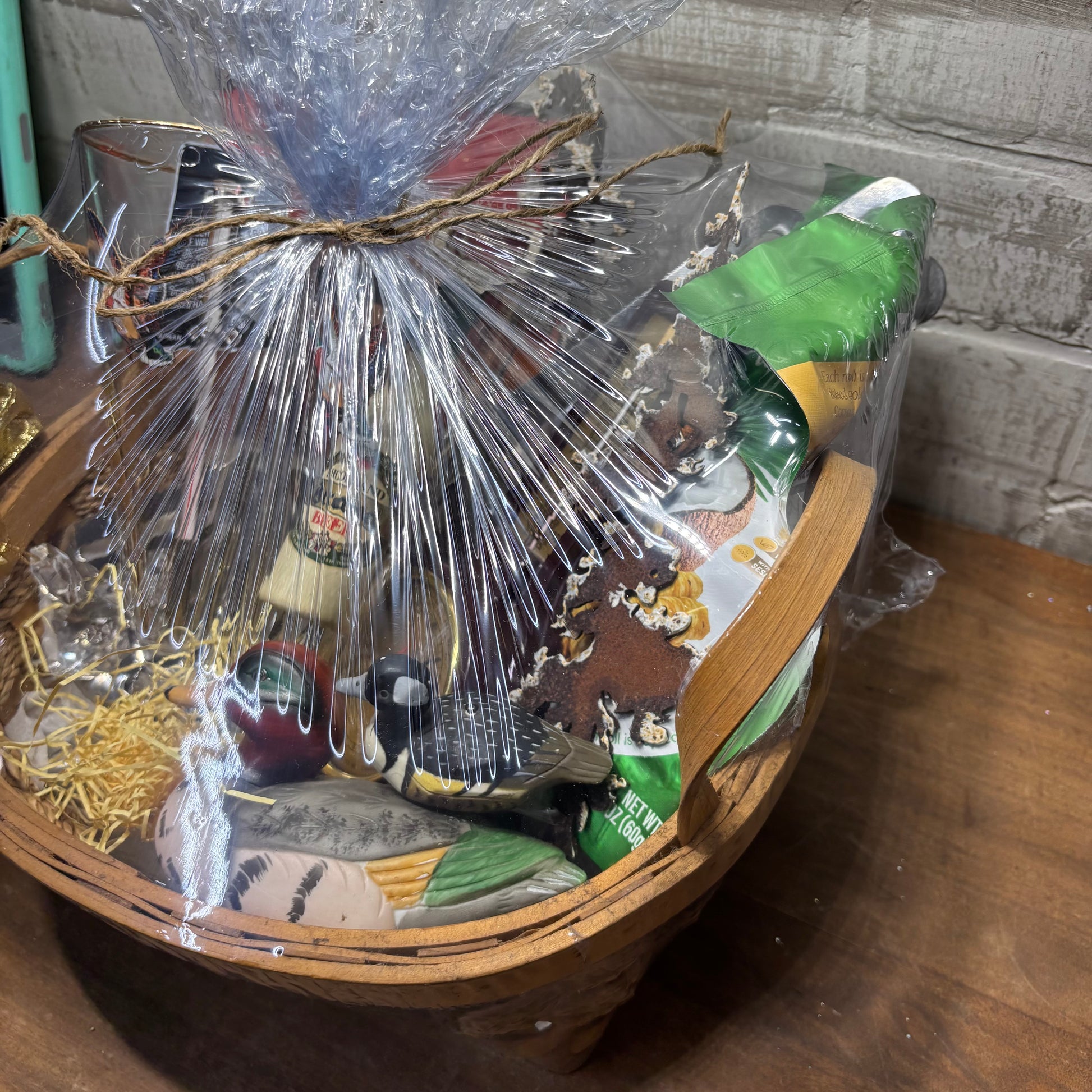 Outdoor theme gift basket full of pre owned and new goodies and some vintage items, meat thermometer, BBQ utensils, movie, barometer, duck cups and decor etc, great gift perfect for Christmas, 11” long, 8” wide, 4.5’ deep basket