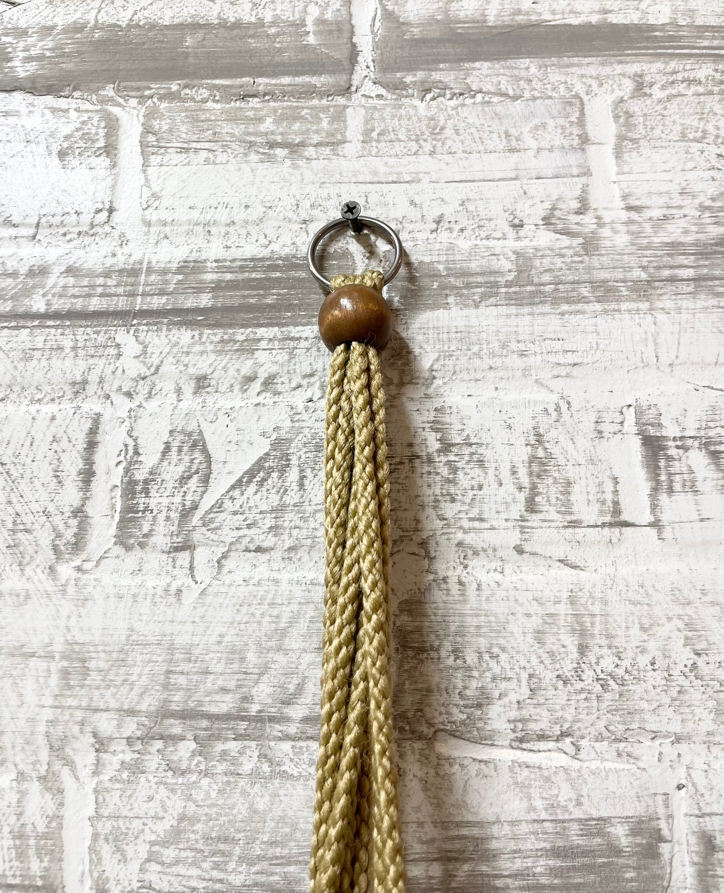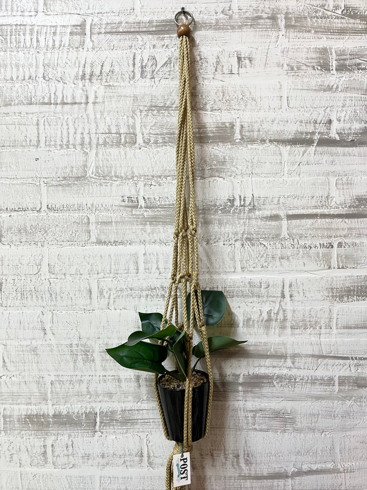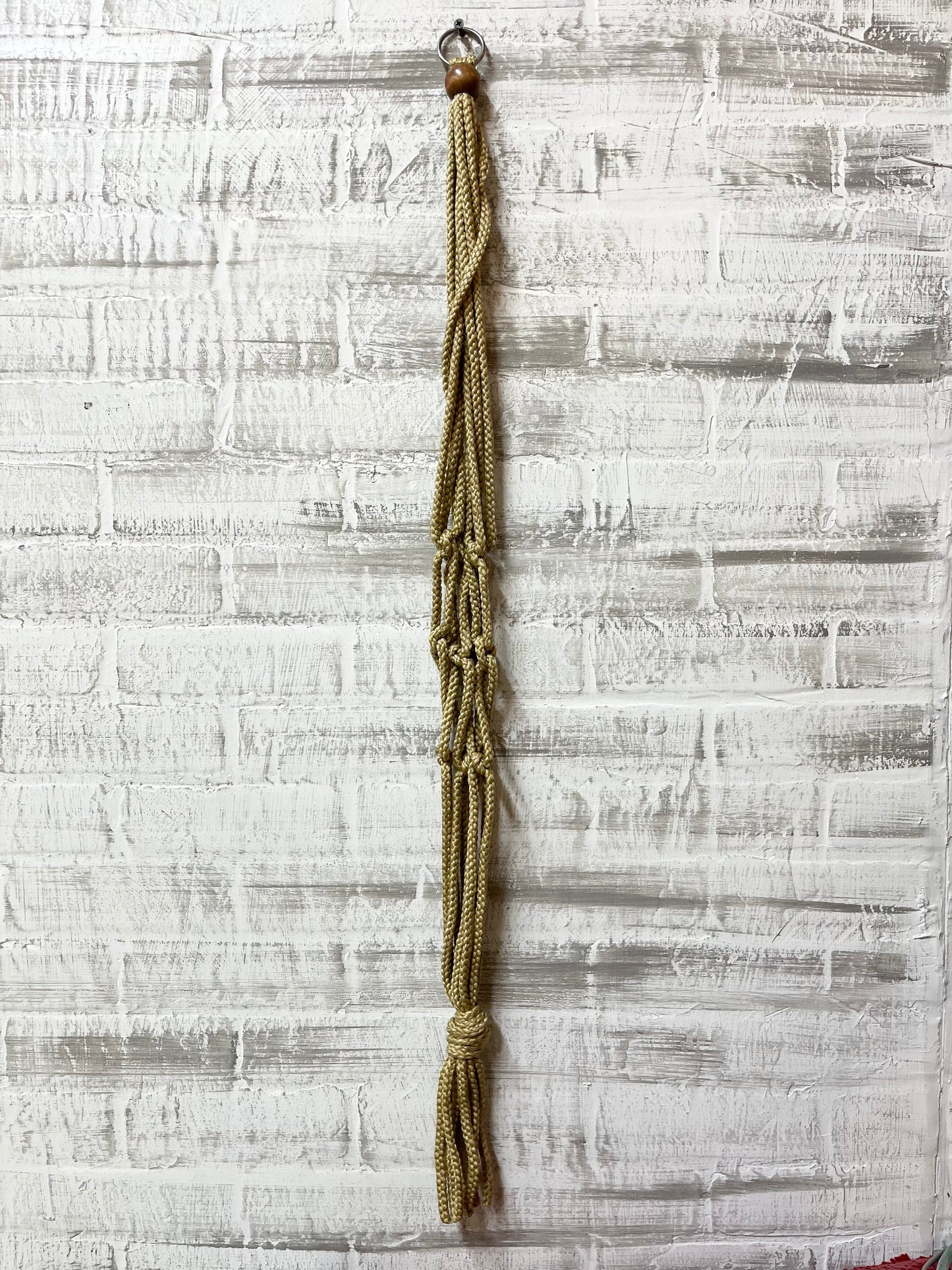 This braided macrame plant holder is a tan color, can hold many pot sizes, is 36” long