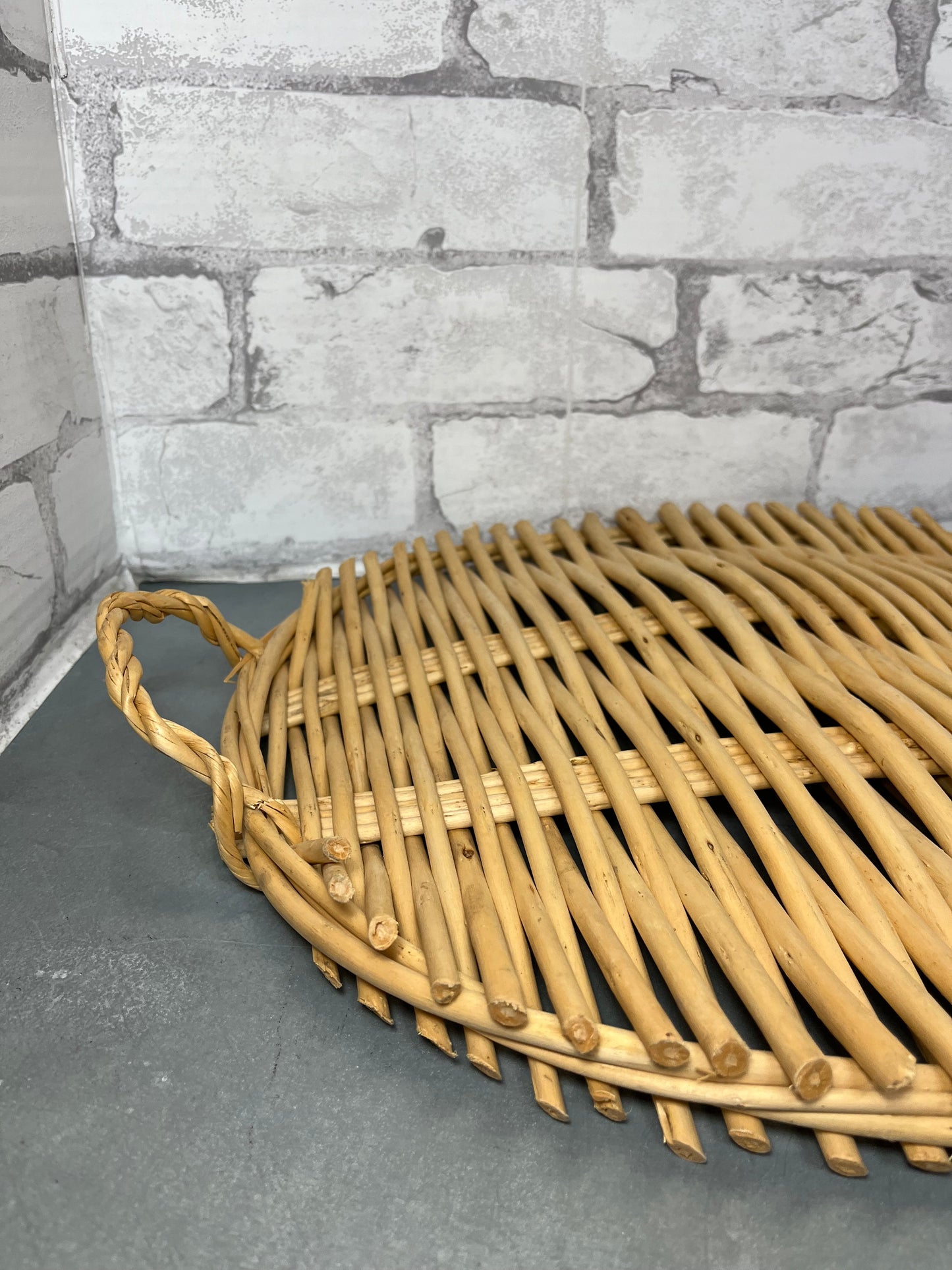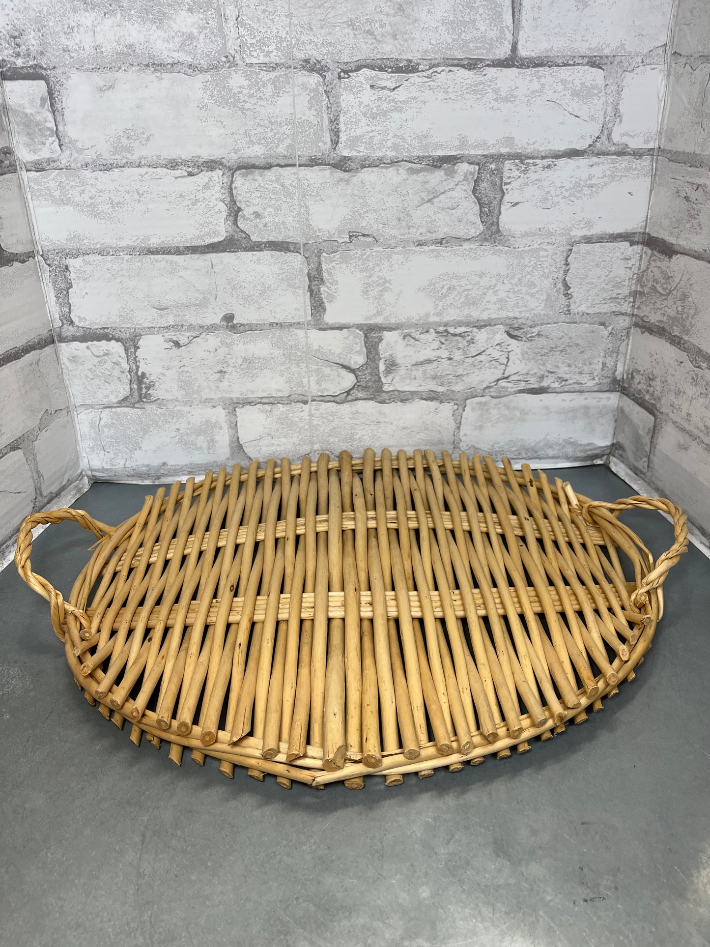 Made of wicker wood, twined together, has two handles, great for indoor or outdoor use, it is 16” long, 14” wide