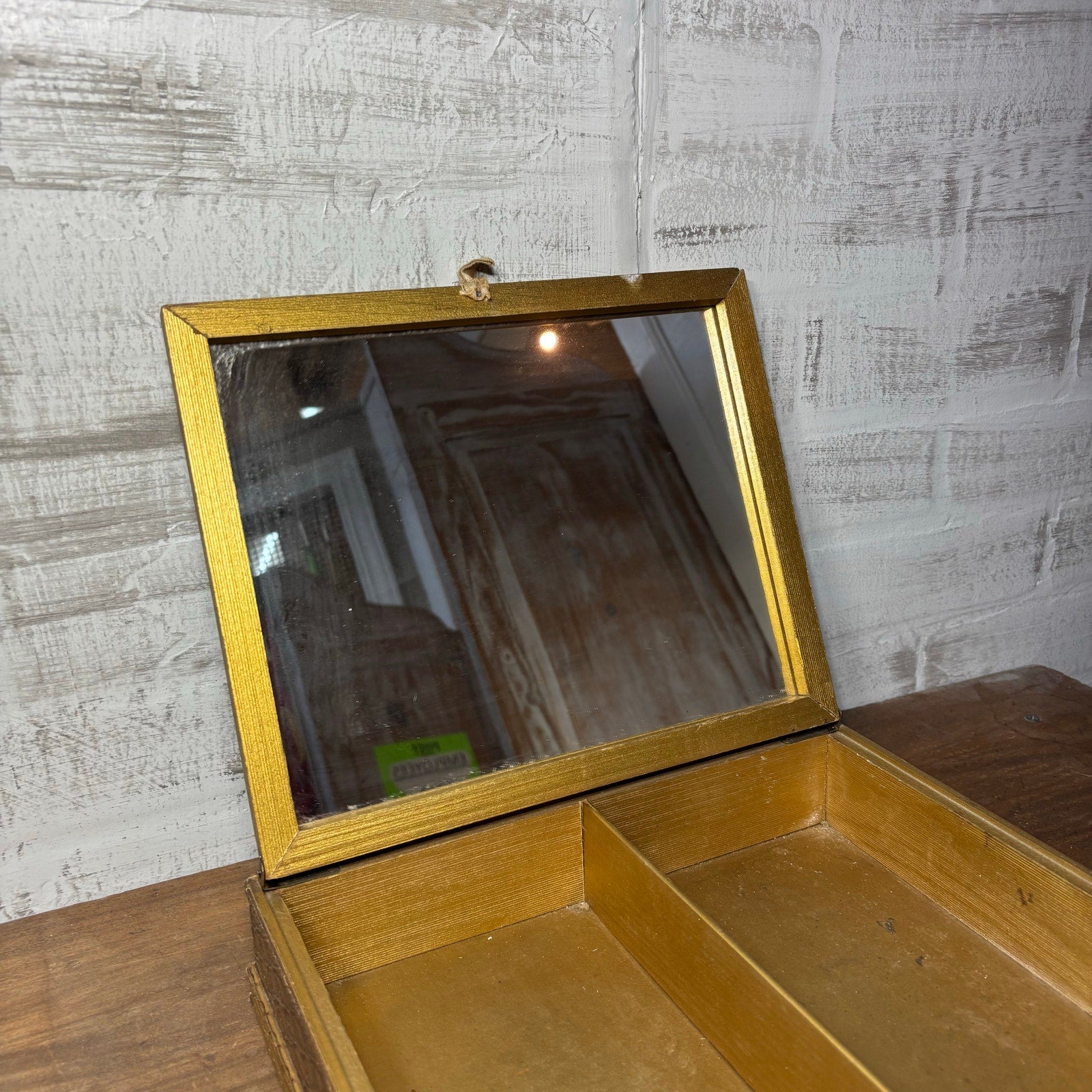 Vintage solid wood, floral bouquet in a vase design on the top, two separate spots for jewelry, has a mirror, some marks due to old age, 11.5” long, 9.5” wide, 2” deep
