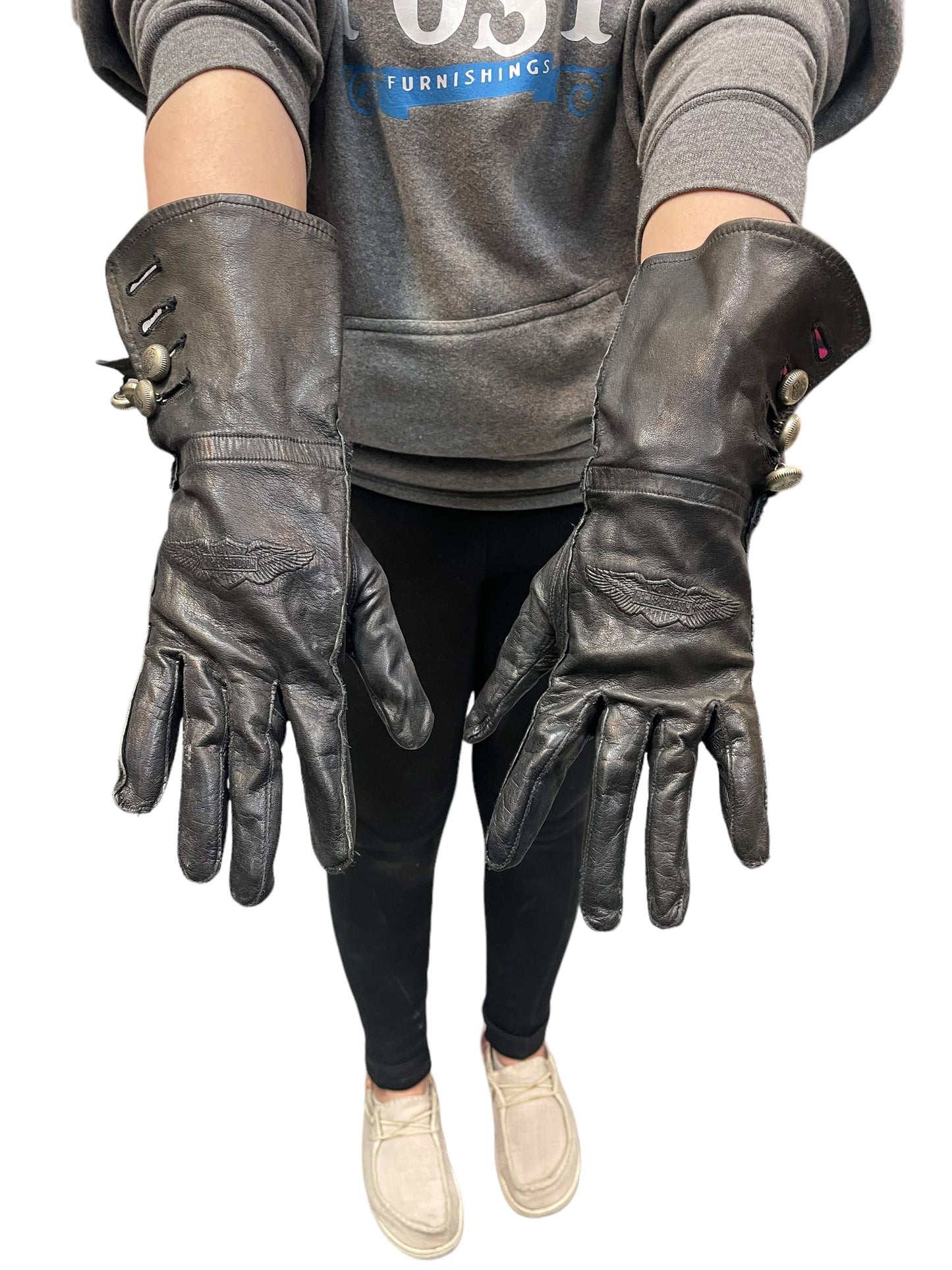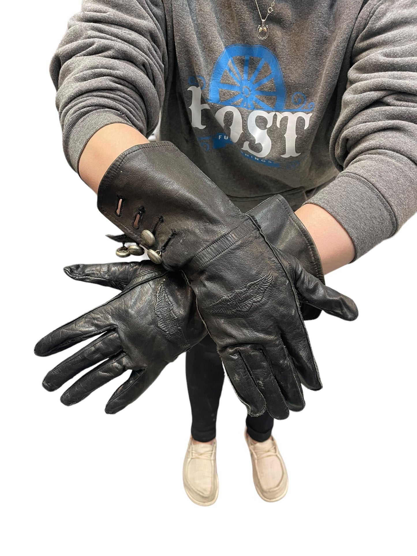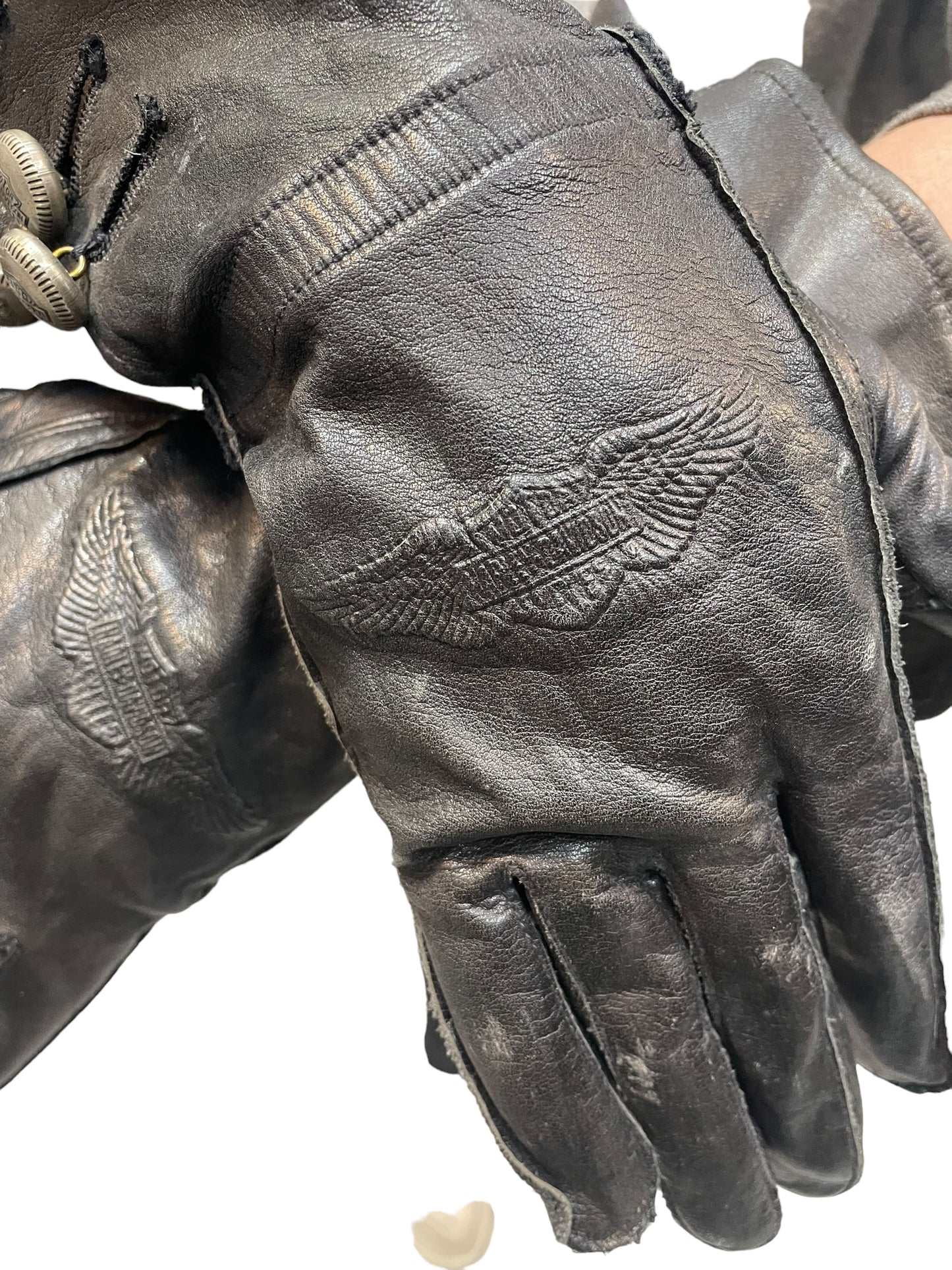 Vintage Harley Davidson black leather gloves. Womens size small. Only slight wear with no rips or holes. Missing 1 button on the left wrist.