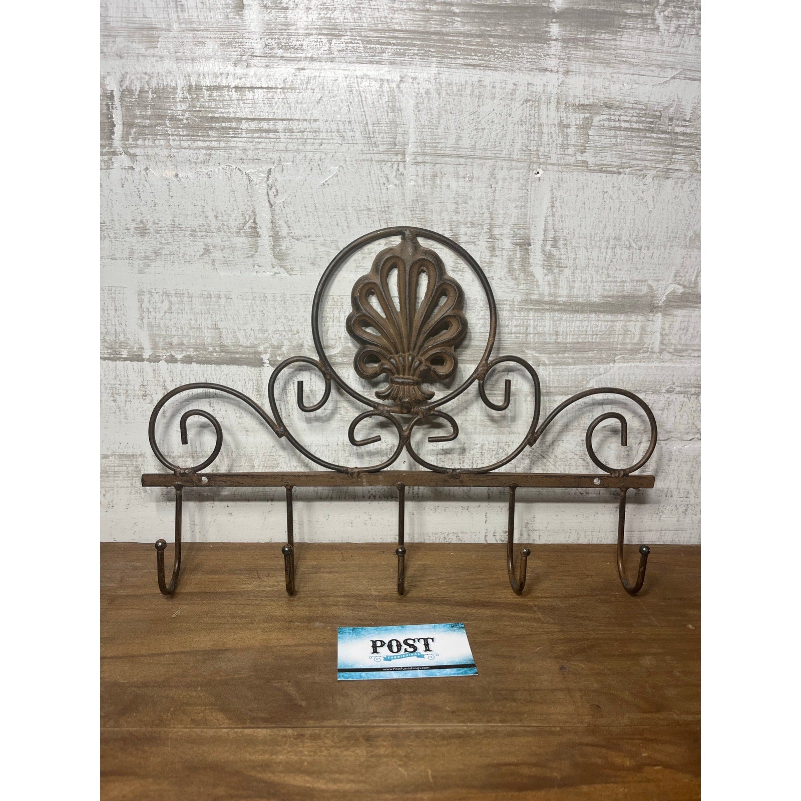 Made out of iron metal, it has five hooks, for leashes, towels, coats, hats etc., it has 16” wide, 11” long, 4” spacing in between hooks