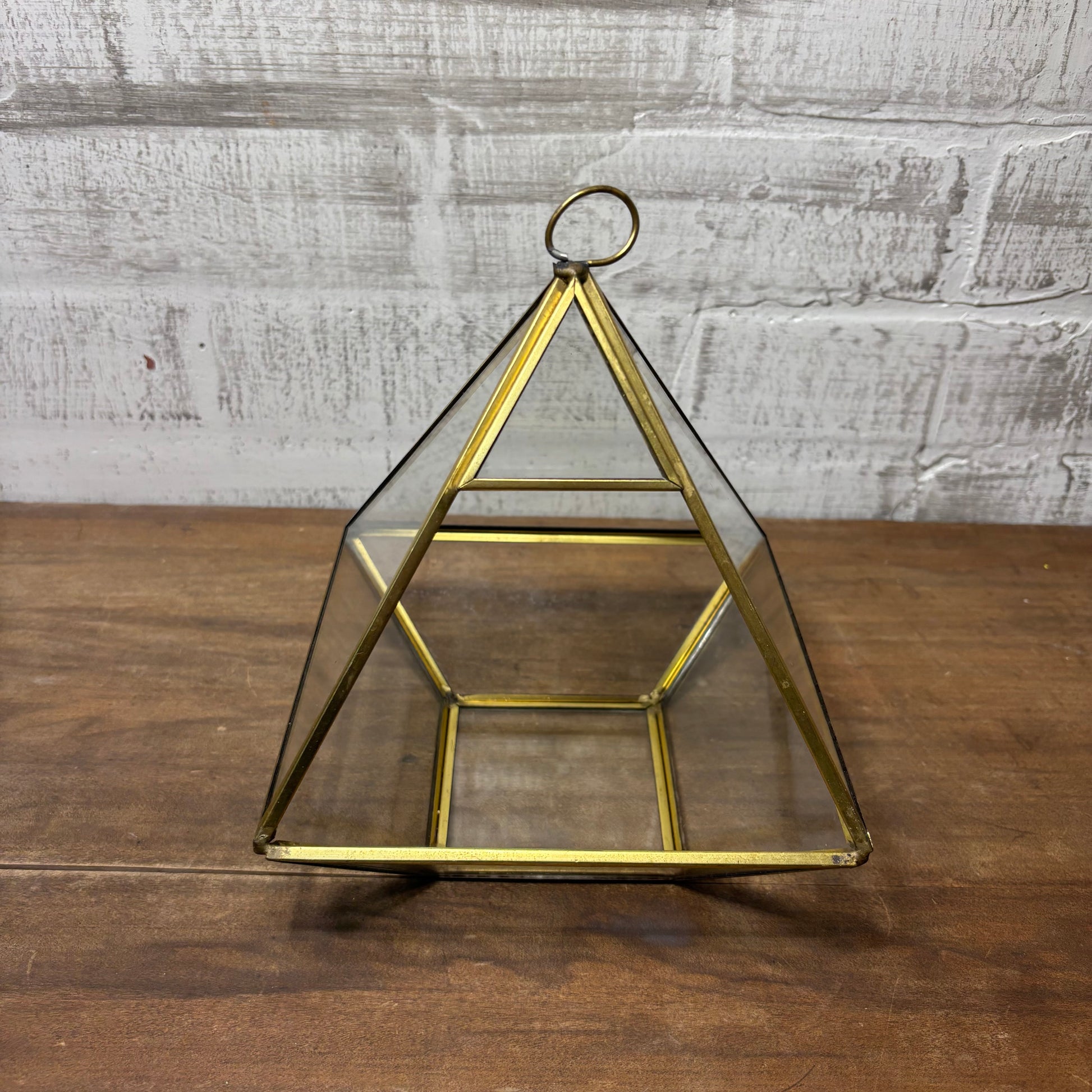 Geometric open air design glass and brass terrarium, 7.5” tall, 6” by 6” base