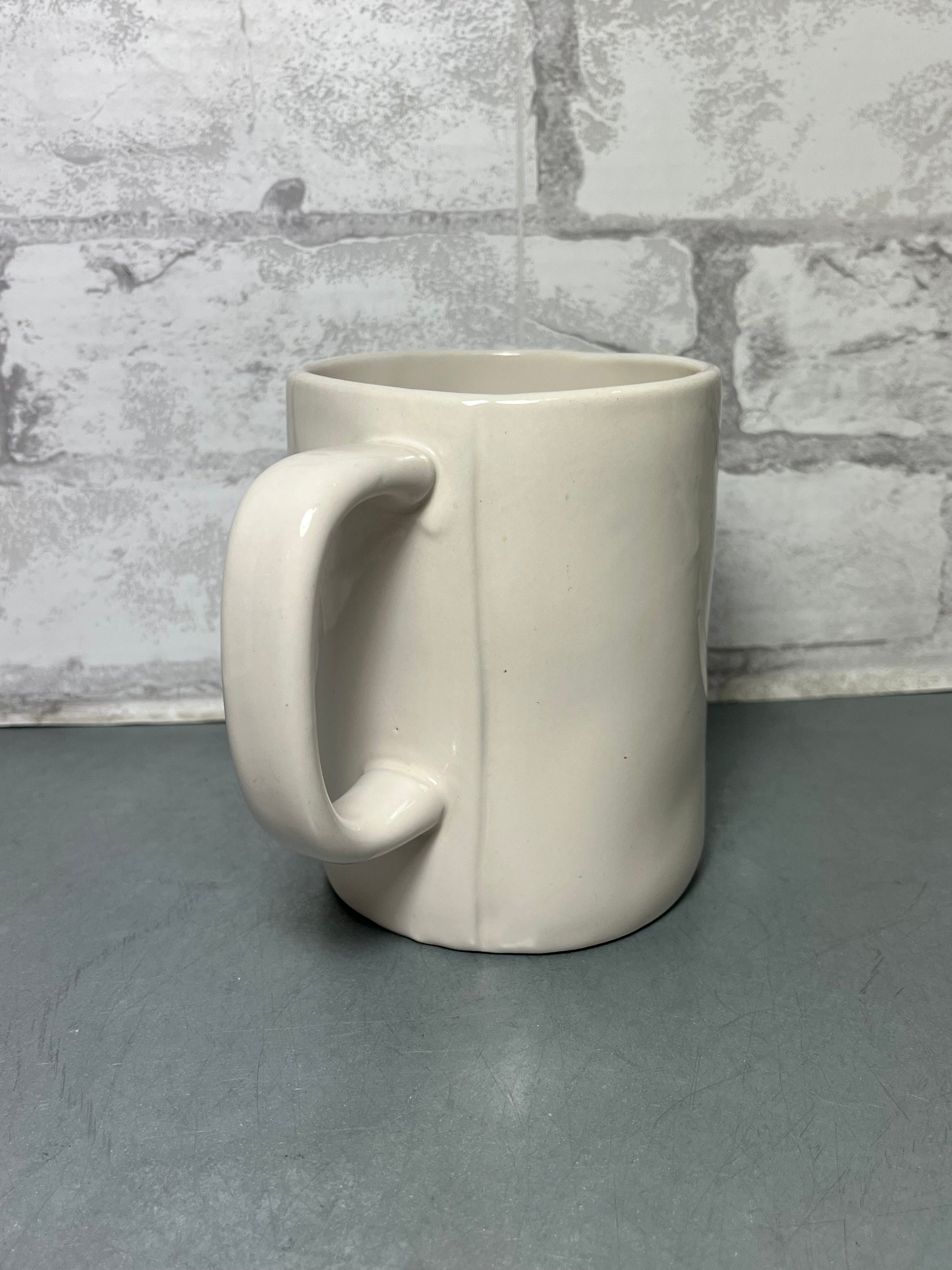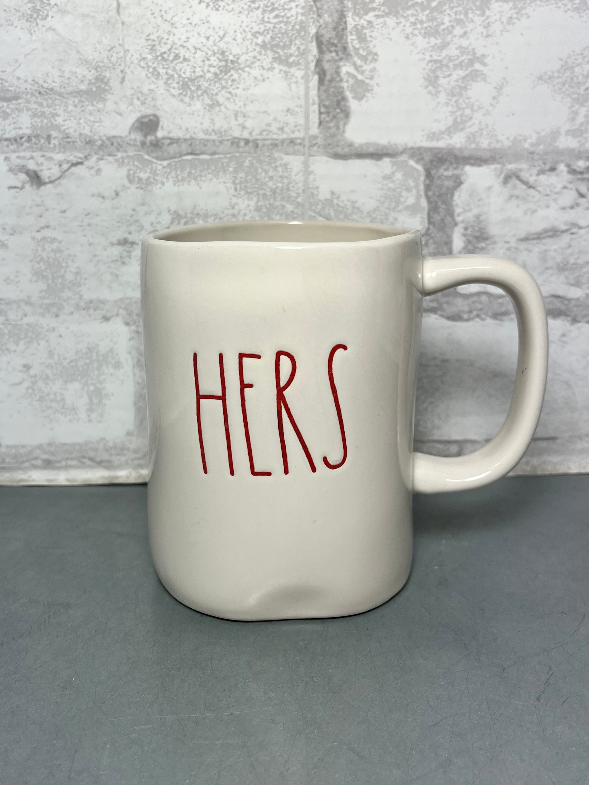 The hers is in a red lettering, the mug is all white, made of ceramic by the brand Rae Dunn, it is 5” tall, 3.5” wide