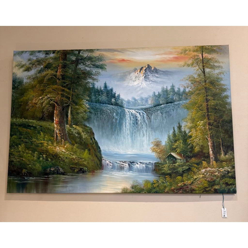 Original landscape oil painting by artist “king” 67” x 44” on canvas with hanging wire. Beautiful waterfalls and trees with intricate detail.