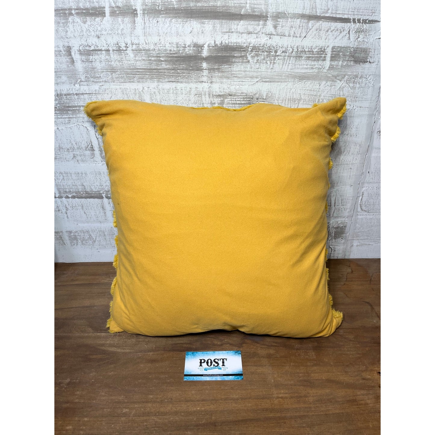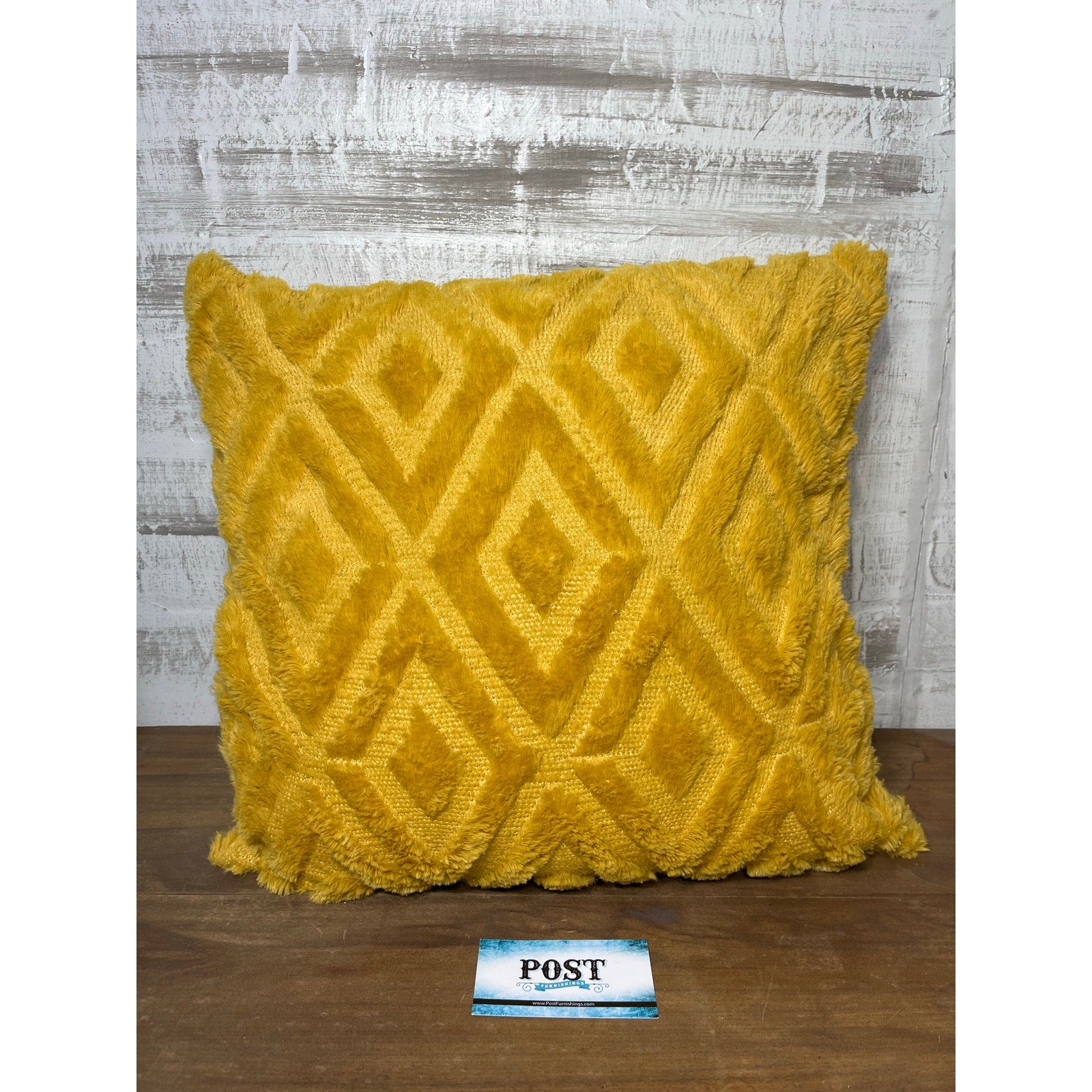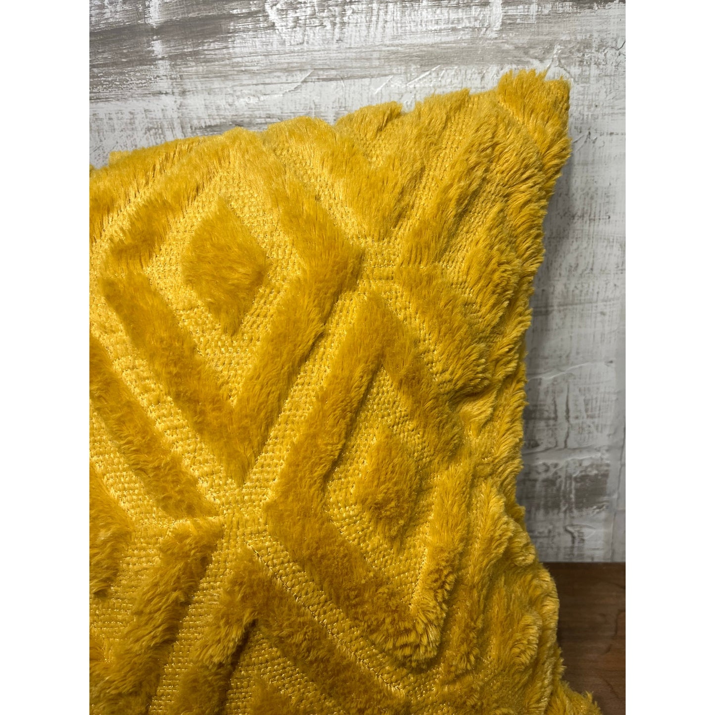 mustard yellow throw throw pillow cushion cover featuring a plush, faux fur texture with a prominent 3D diamond geometric pattern, it is 15” by 15”
