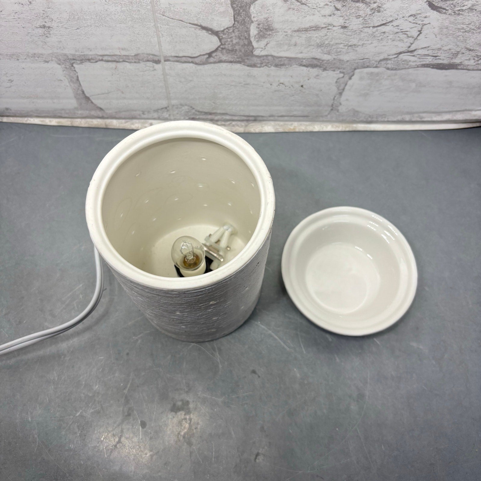 Porcelain uniquely textured, glowing white wax warmer, made by the brand Scentsy, some stains can be seen in photos, 6” tall 4” diameter
