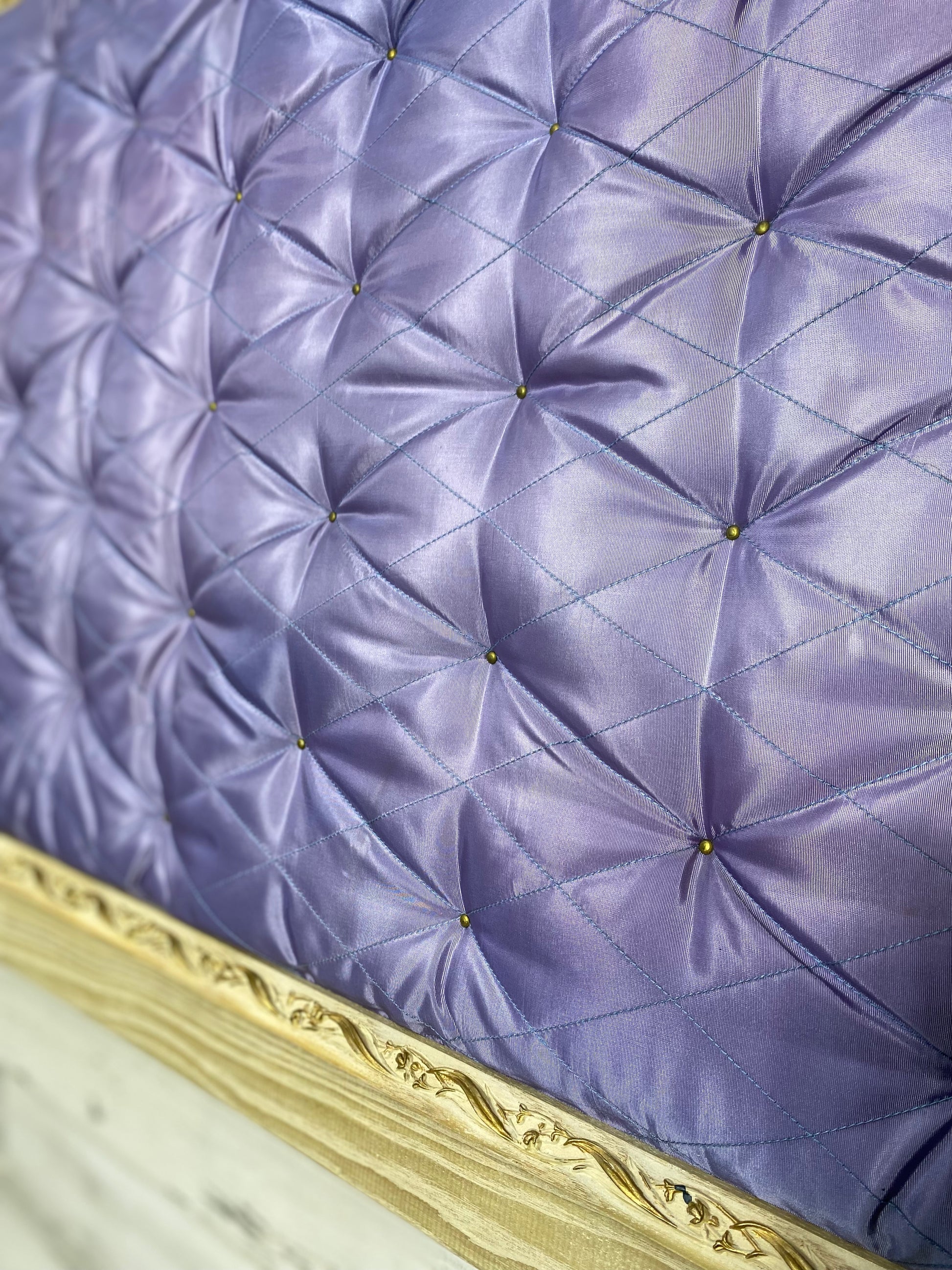 Set of 2 antique twin size headboards. Silk purple tufted upholstery. Sturdy wood frame.