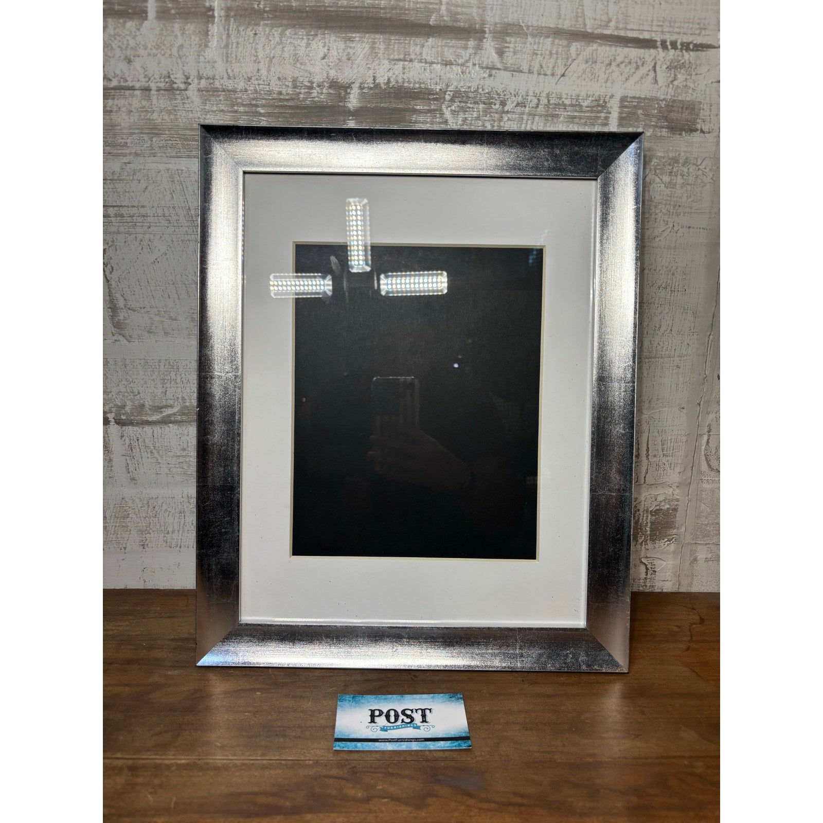 silver-colored picture frame with a wide, textured border and a white mat, frame can be hung on the wall horizontal or vertical, it can hold a 13” by 10” picture or 7.5” by 9.5 the frame is 16” by 13”
