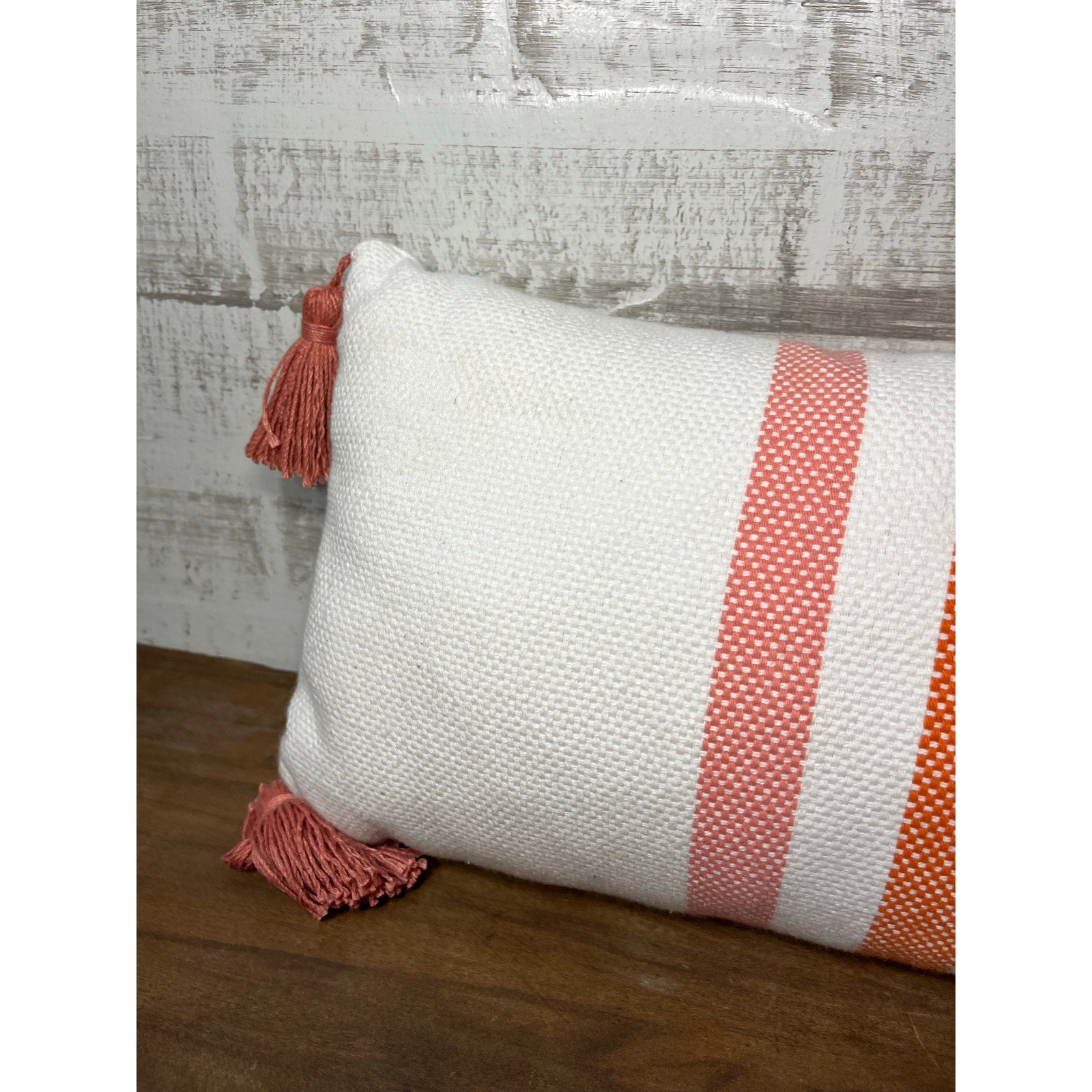 rectangular lumbar throw pillow with a striped design, pinks, orange and white coloring, Tassels on each corner, it is 17” long, 8” wide