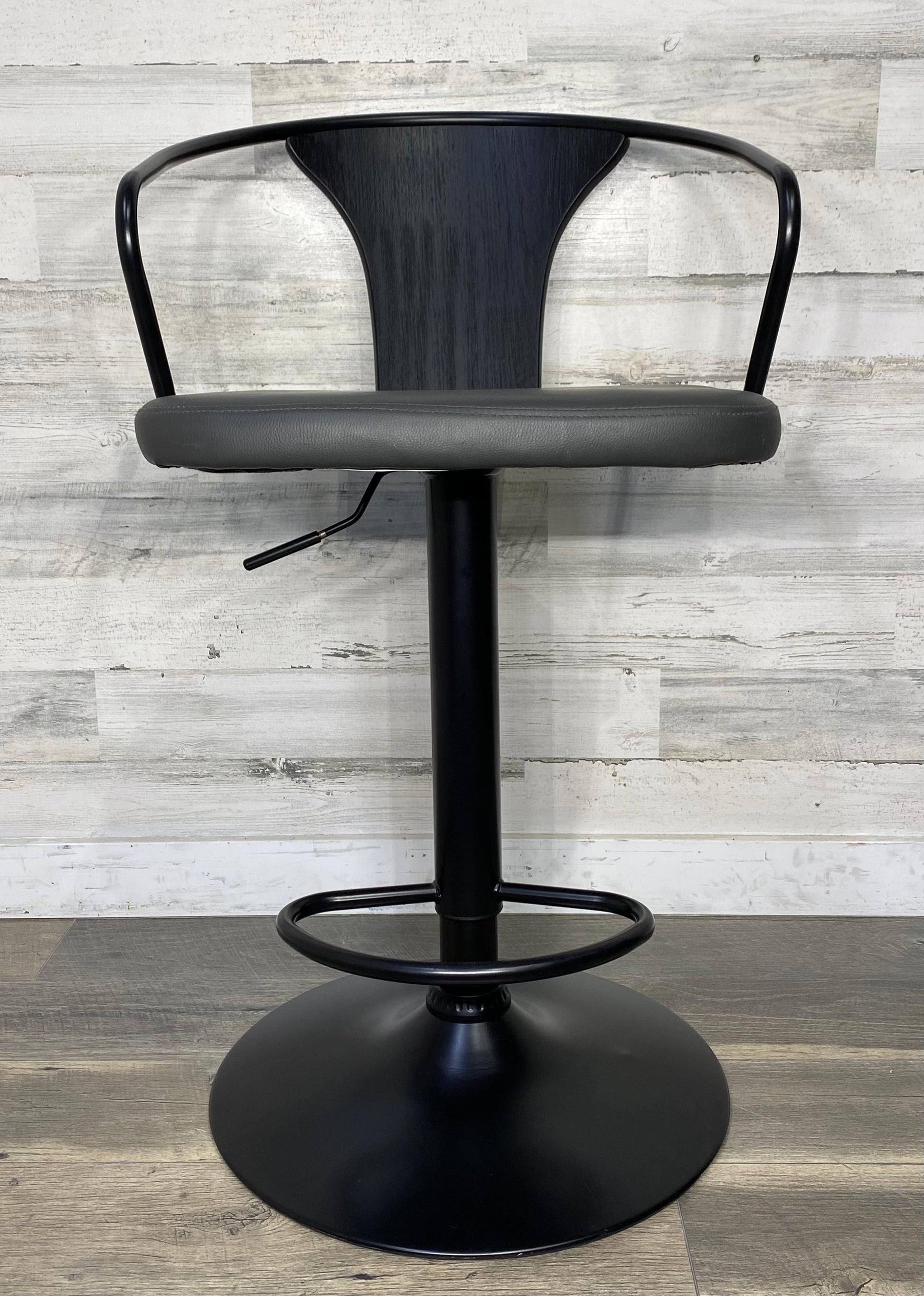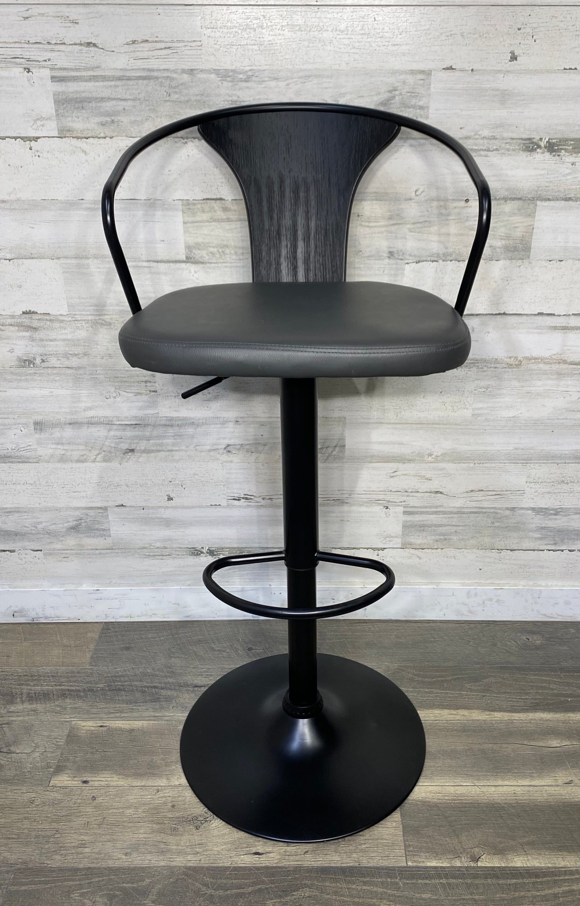 Adjustable height swivel bar stool. Black metal frame and faux leather seat. Great condition. Can be counter height or bar height.