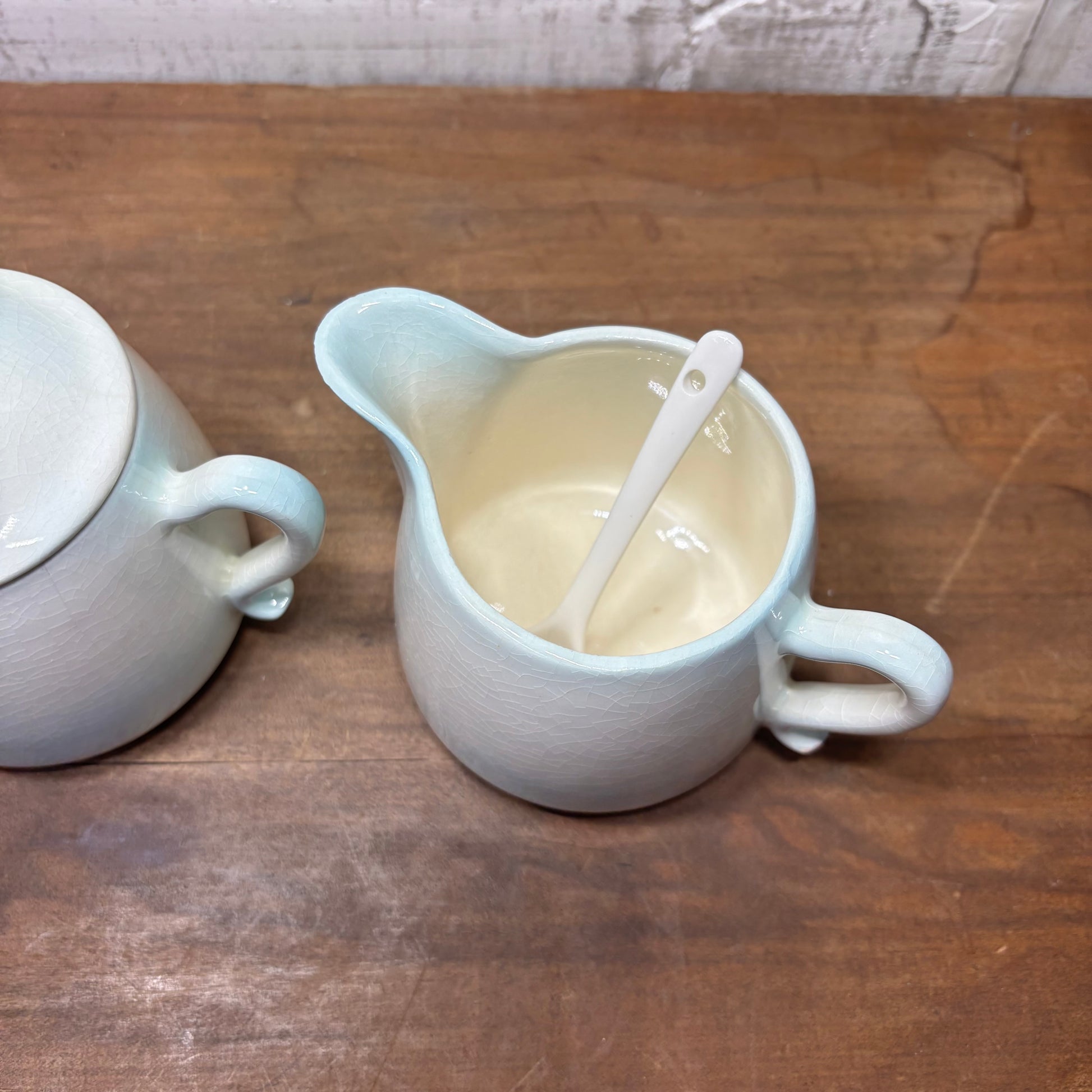 white and light blue ceramic creamer and sugar bowl set with a crackle glaze, both are 3” tall 3” wide