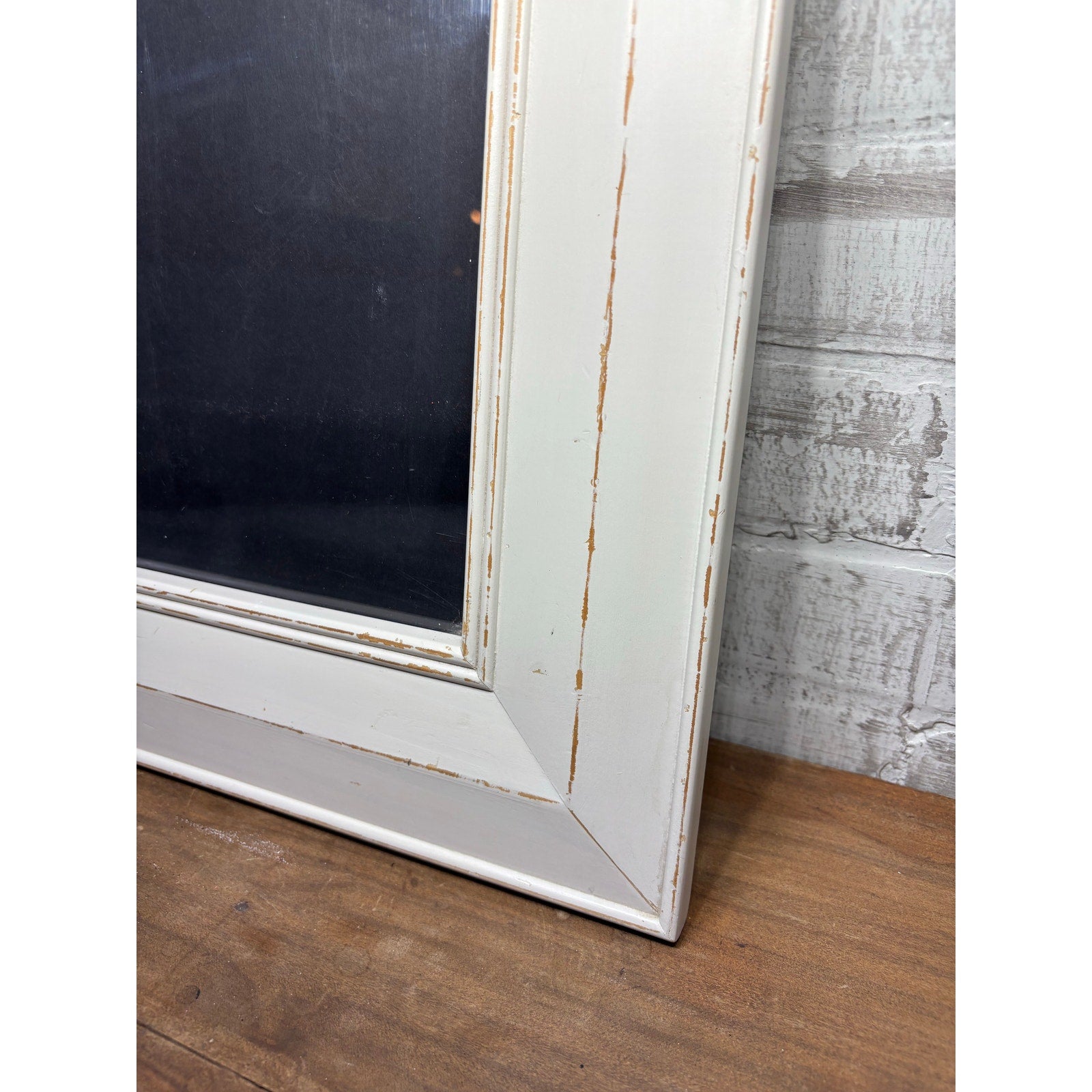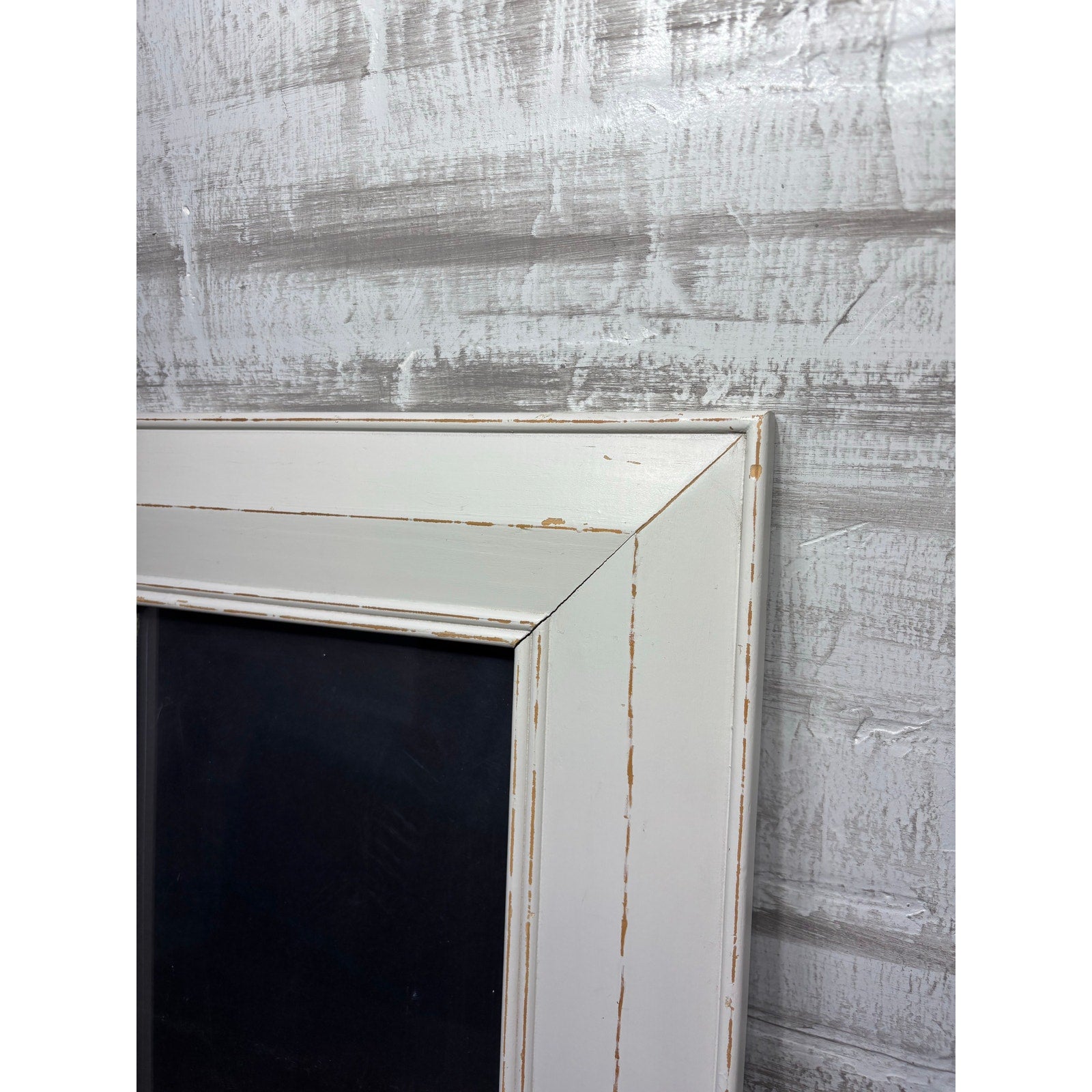 White distressed, solid wooden picture frame, can fit 8.5”, 11” pictures, some marks can be seen in photos, nail holes to hang horizontal or vertical, 14” by 17”