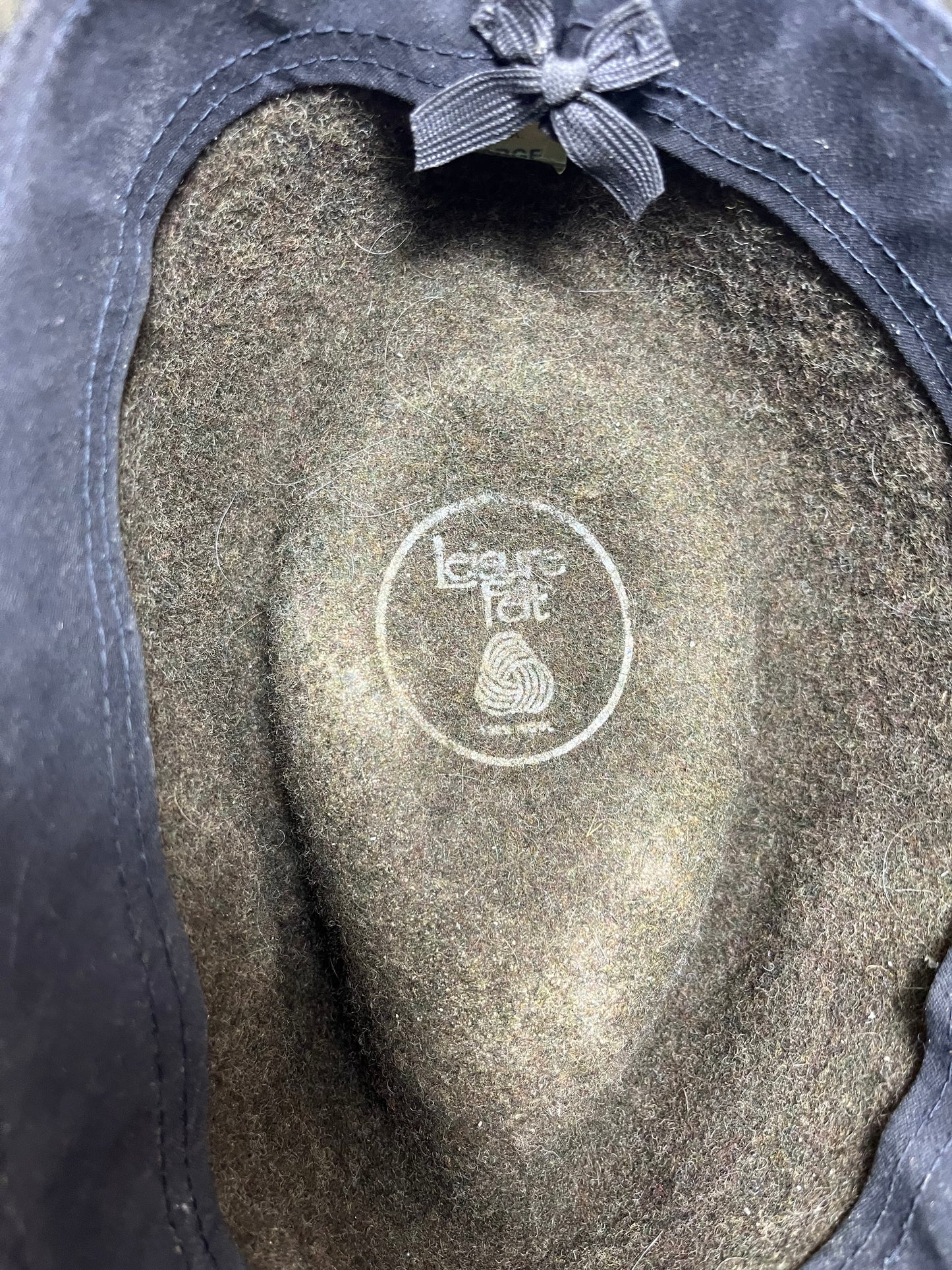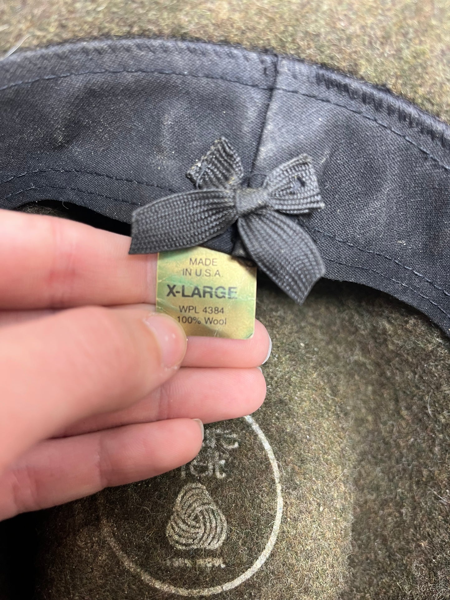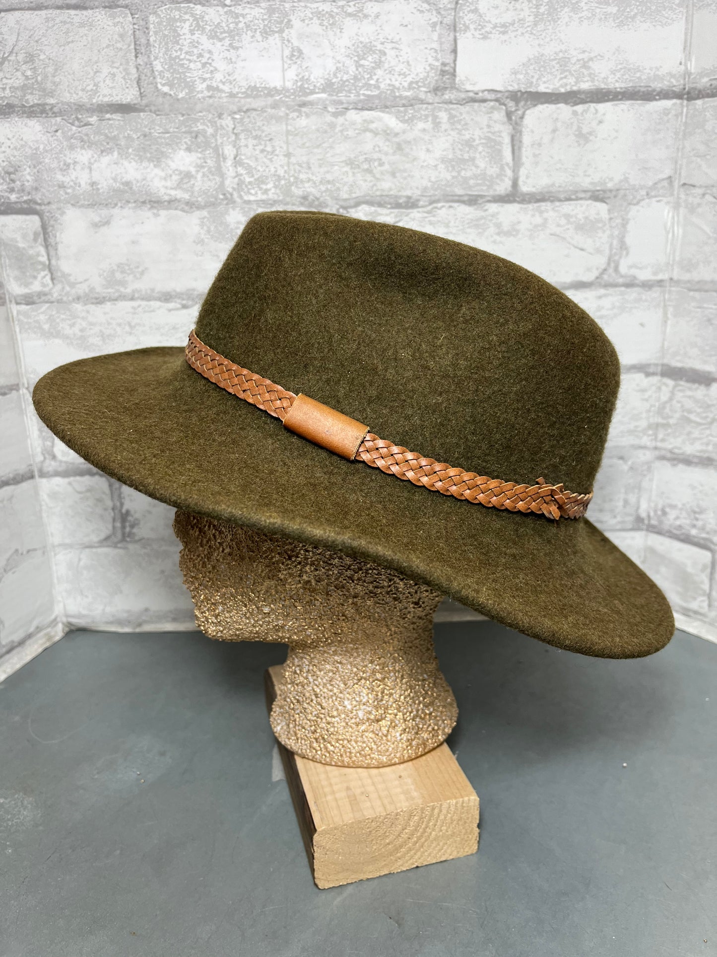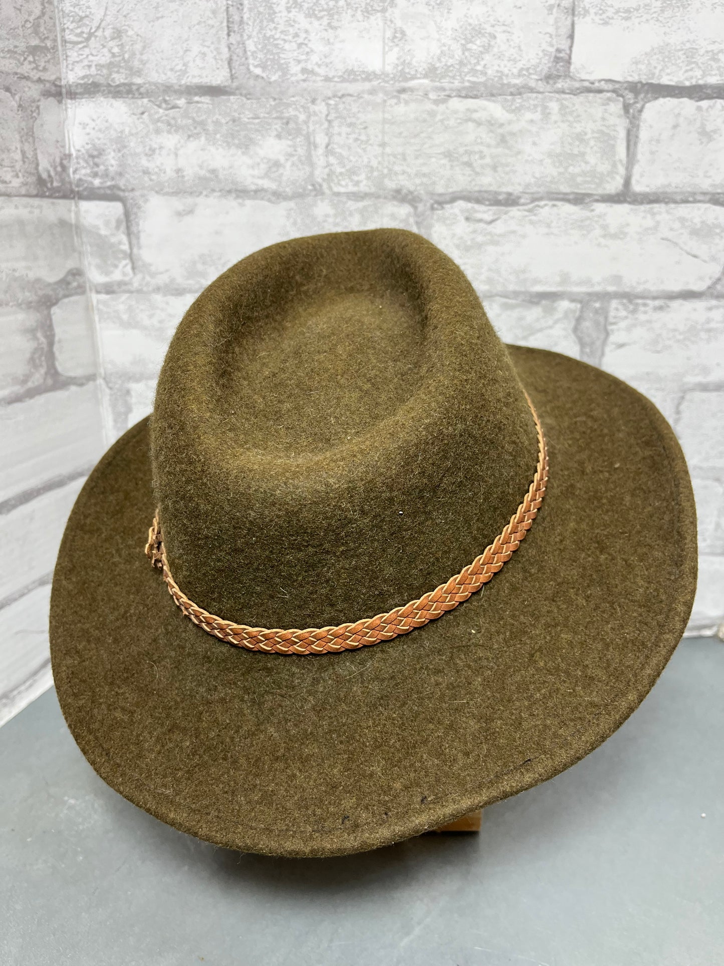 Made of 100% wool this is a fedora style hat, forest green color with brown accents strap, made by the brand Leisure Felt, it is size X-Large, made in the USA