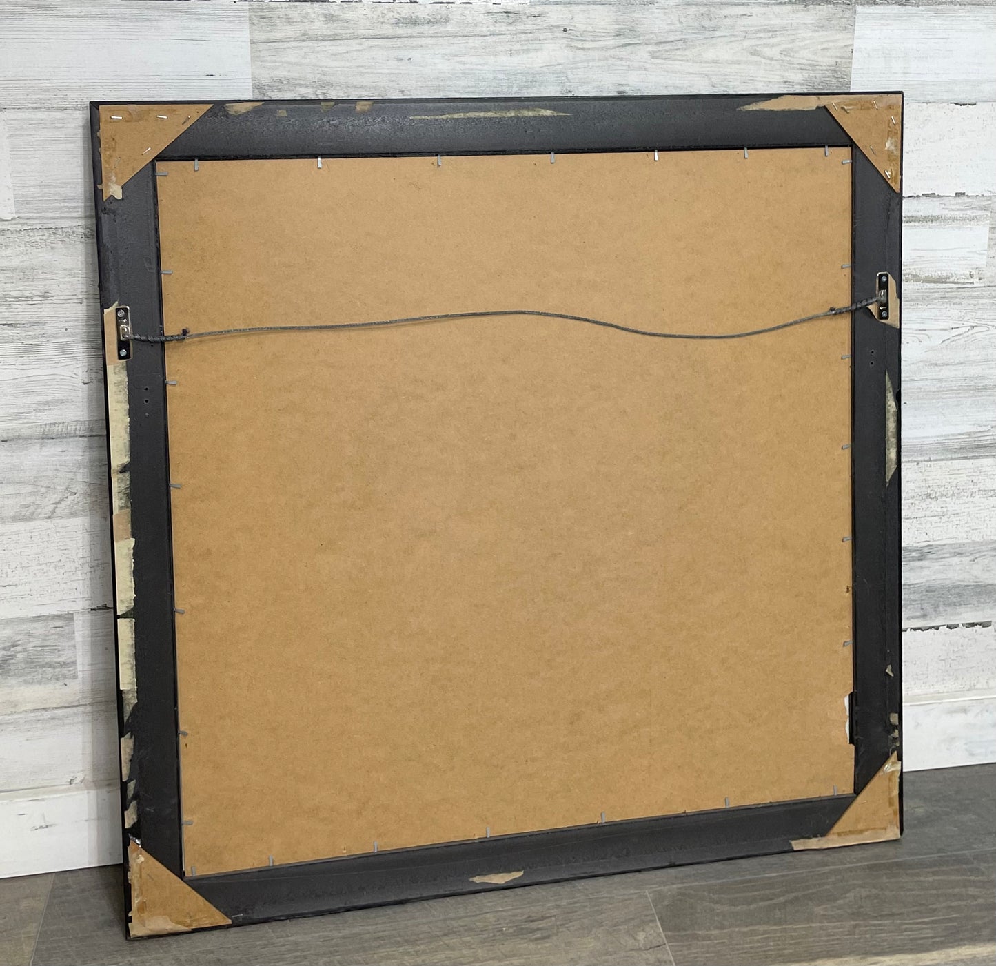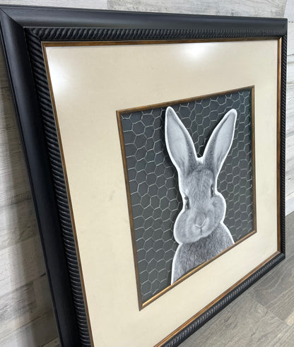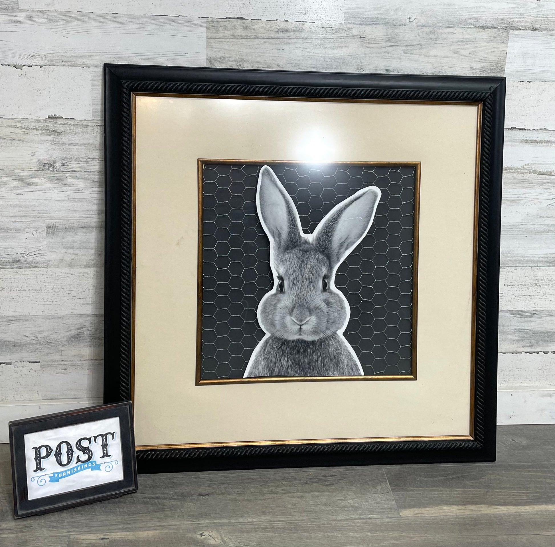 Large black framed wall art. Bunny rabbit with chicken wire behind it. Farmhouse modern vibes.