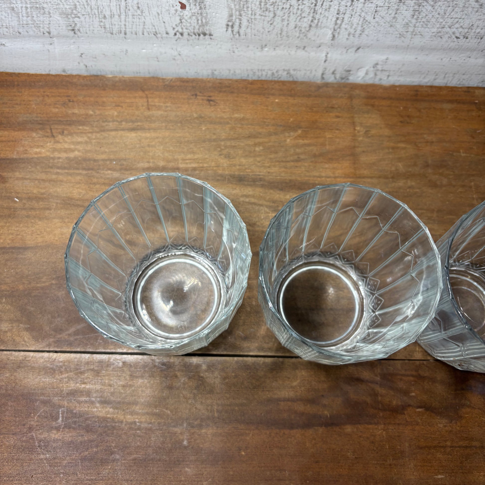 Etched Crown Royal Von Pok made in Italy whiskey glasses, three have some ware and one is in good condition, 3.5” by 3.5” diameter