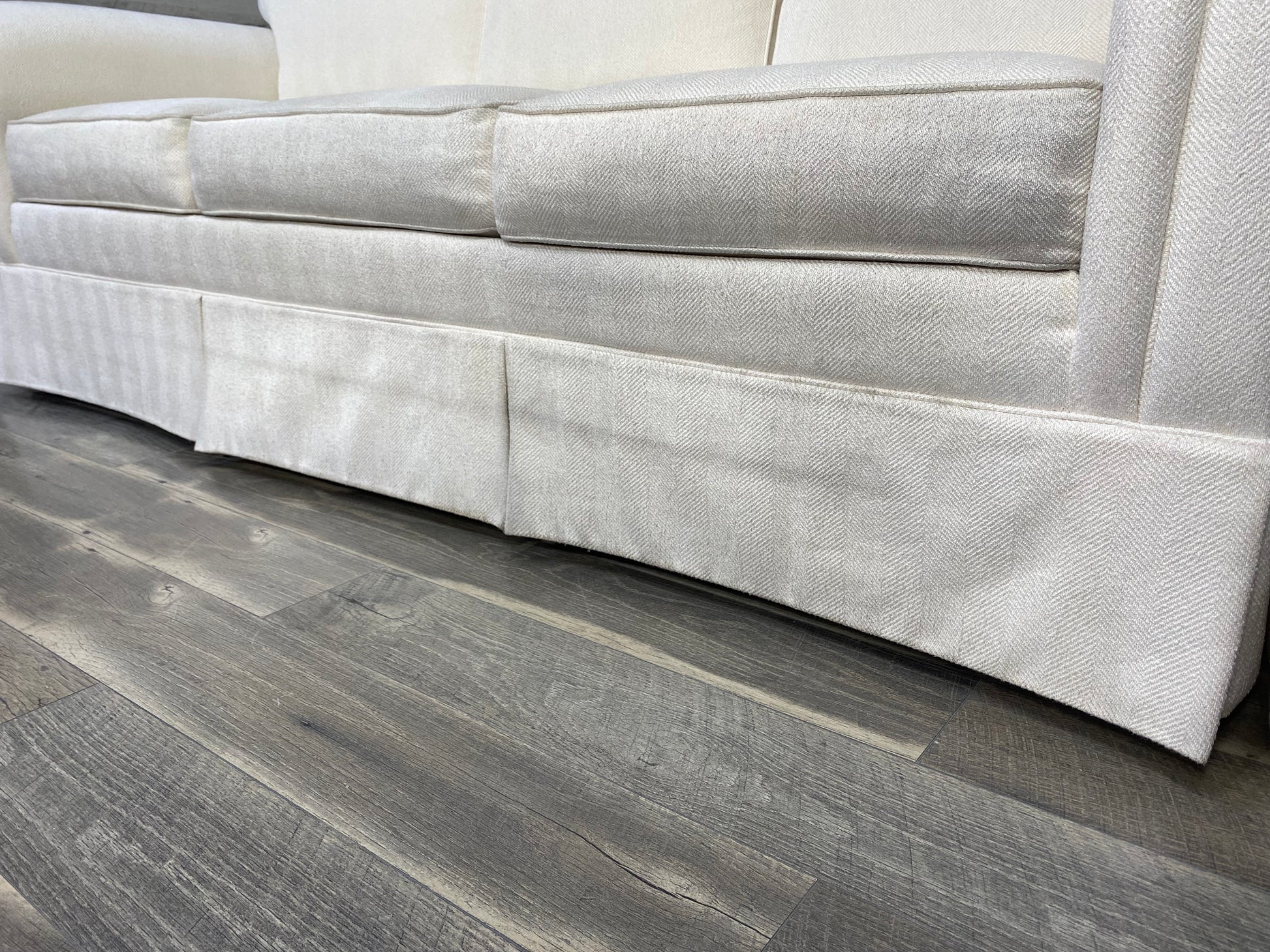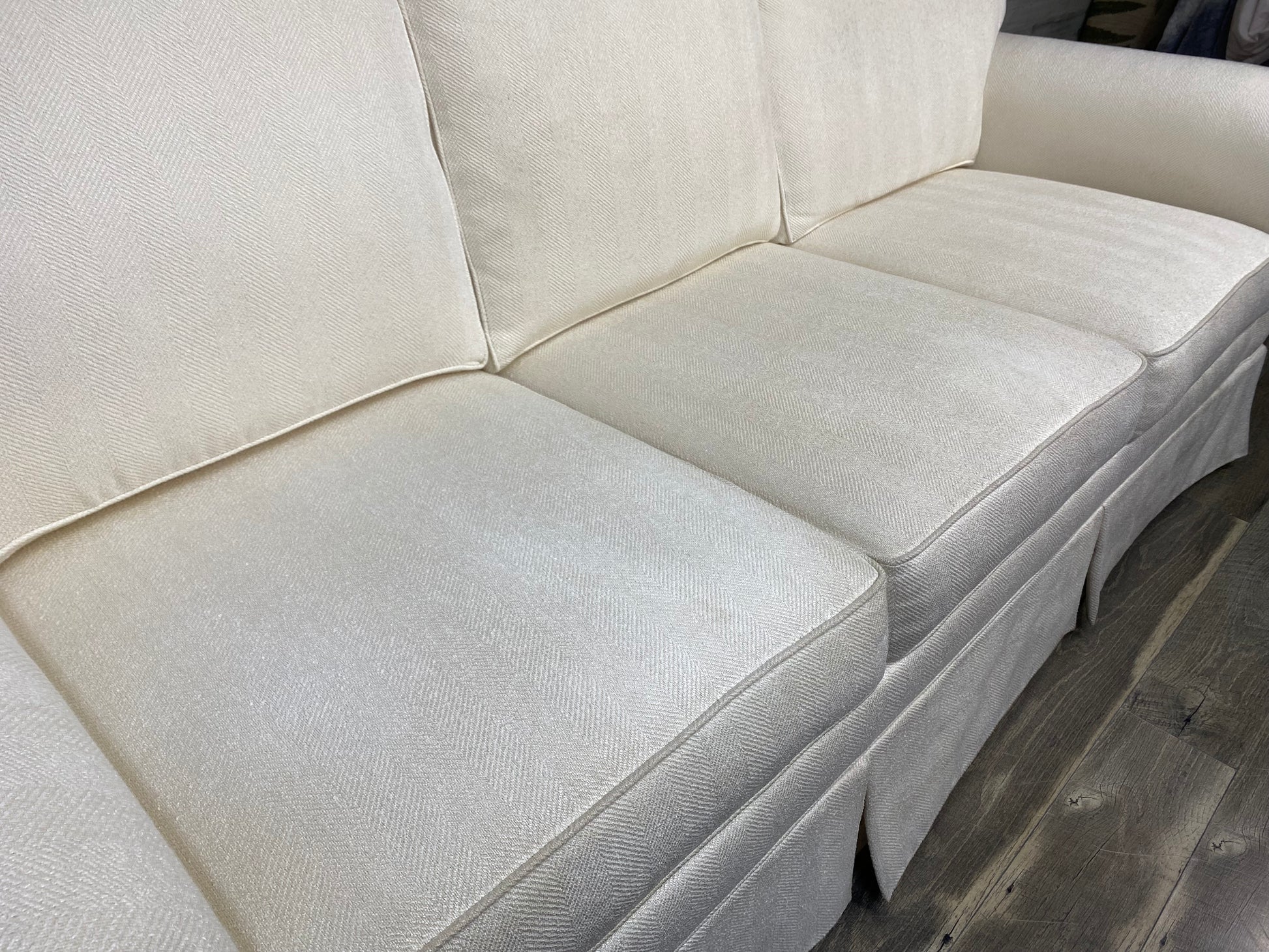 Very high end Ethan Allen couch. Color is an off white ivory. Pre owned condition and does have a few marks around the front skirt that could use a cleaning by hand. Very pretty and comfy!