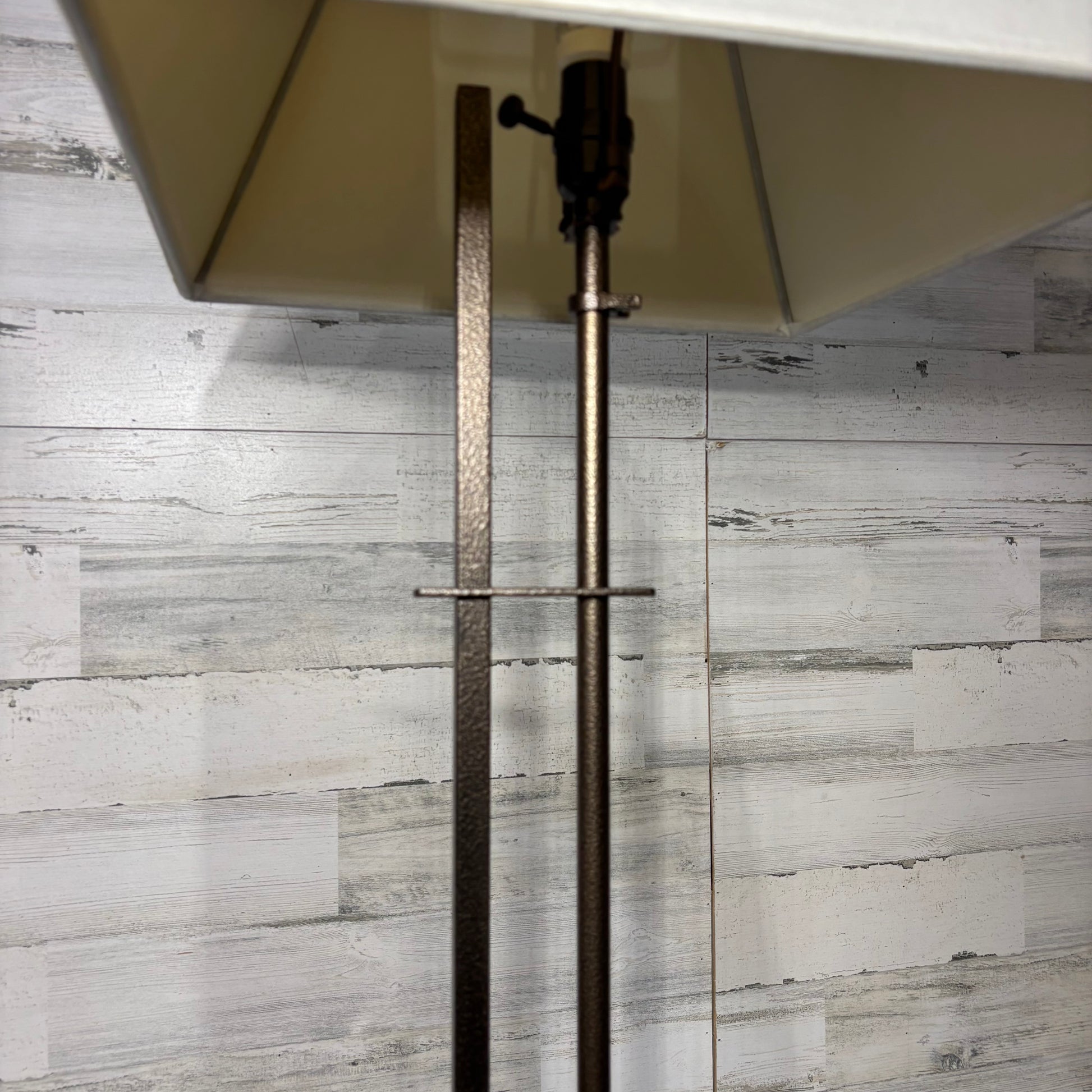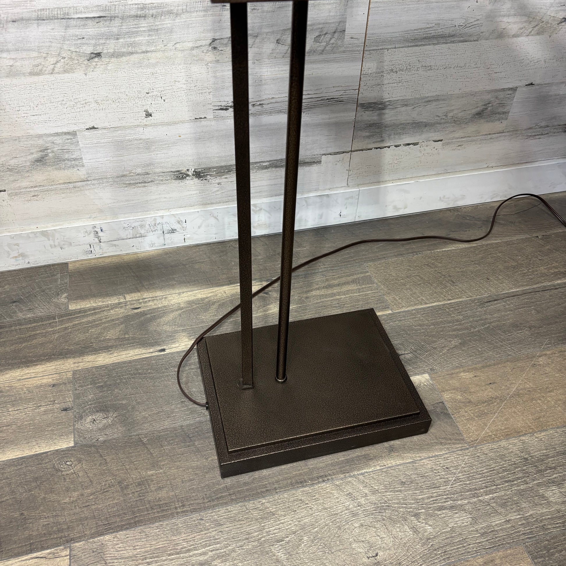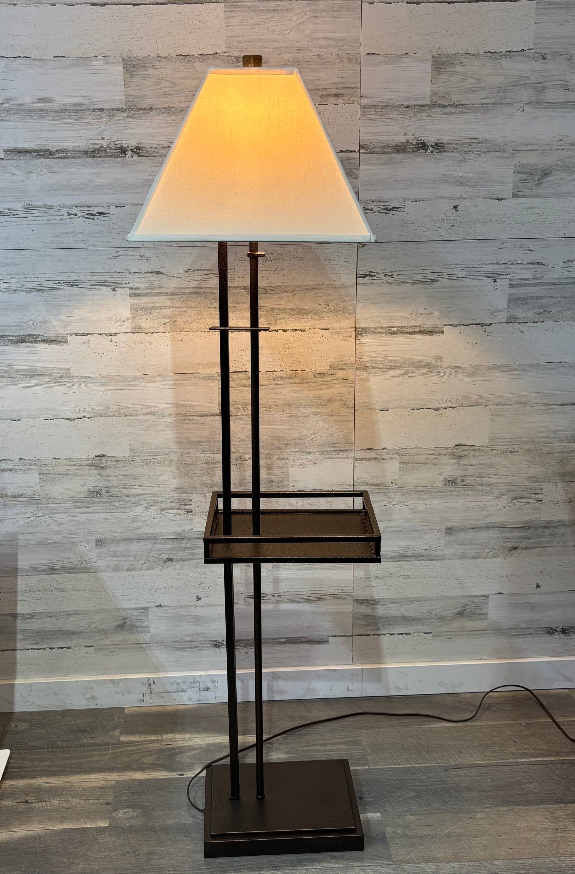 Solid metal dark brown standing floor lamp with a build end table, 62” tall, end table 10” wide 13” long 2” deep