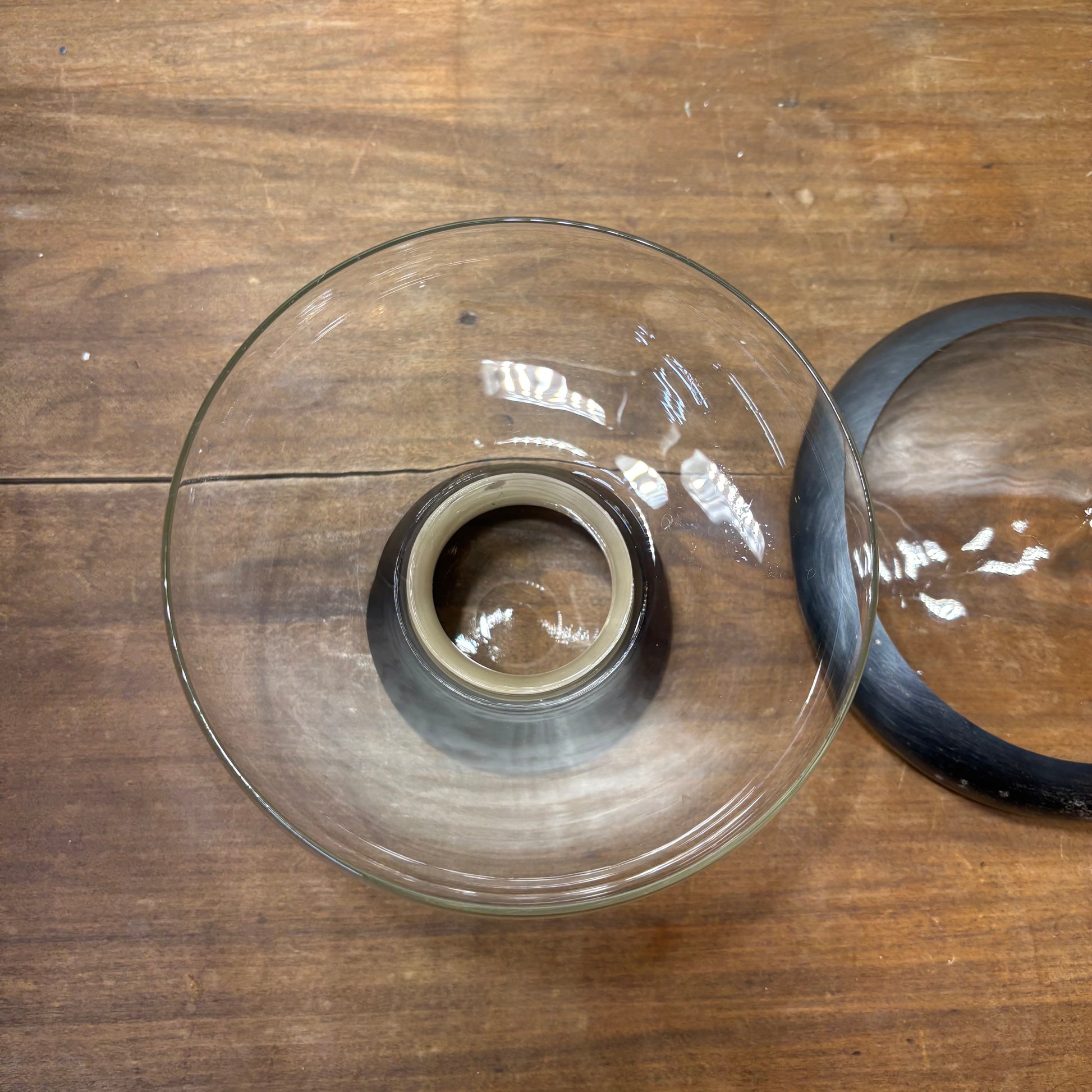 Mid century covered candy dish made by Dorthy Thorpe, has a silver band on the lid and bottom, one side has some ware due to old age can be seen in photos, 6.5” tall with lid, 5.5” diameter
