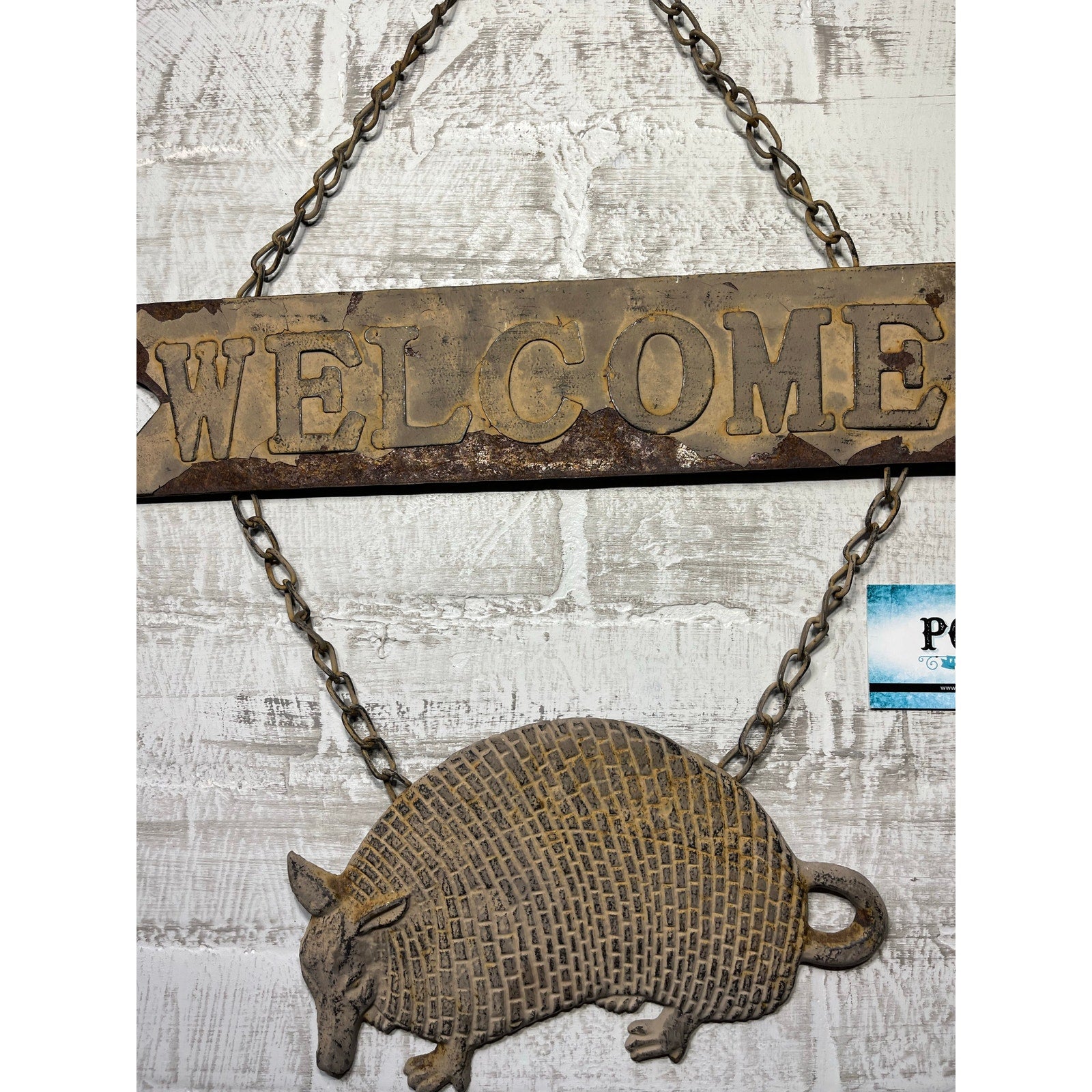 a metal sign with the word "WELCOME" and a hanging armadillo figure below, both suspended by metal chain, it does have some chipping due to it being outside, it is 21” long, 15.5” wide