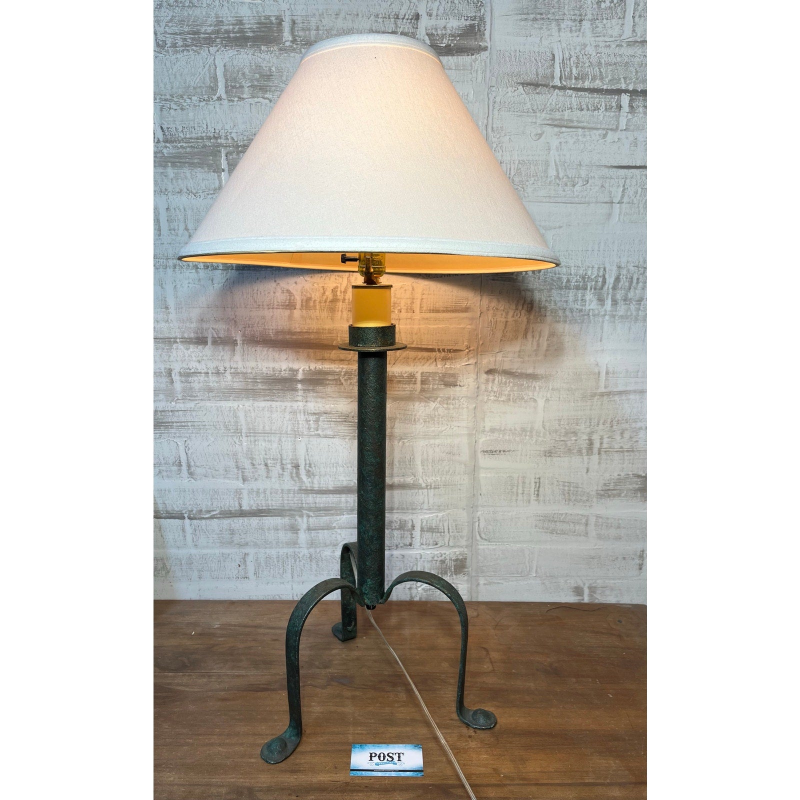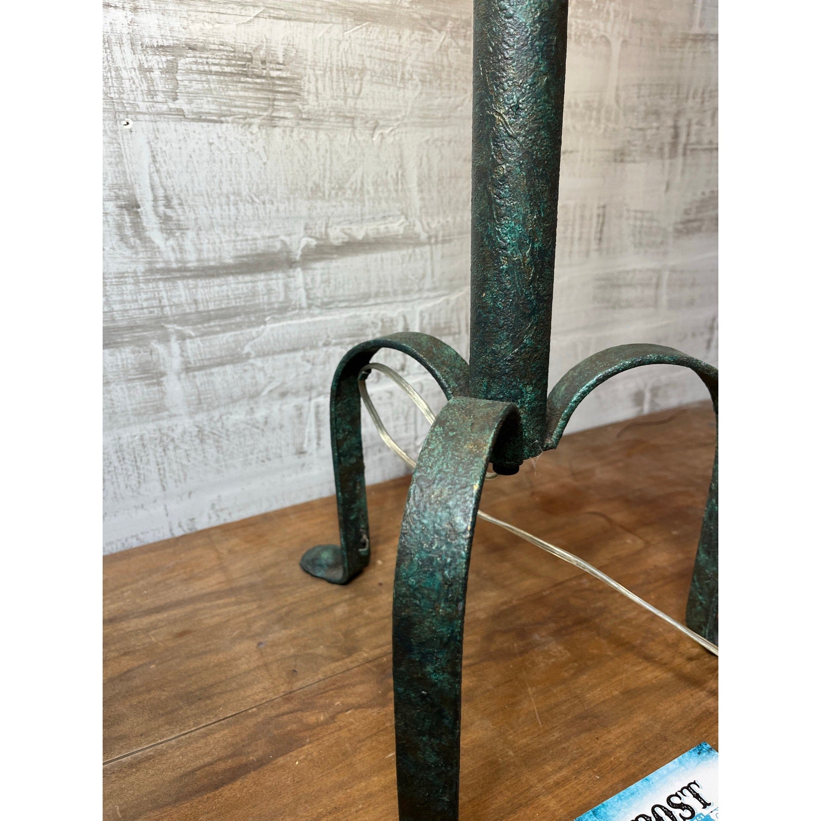 Made out of solid metal, dark green turquoise patina color, three footed table lamp