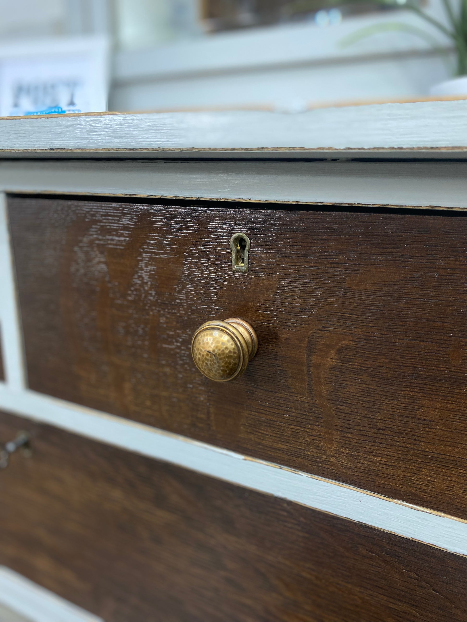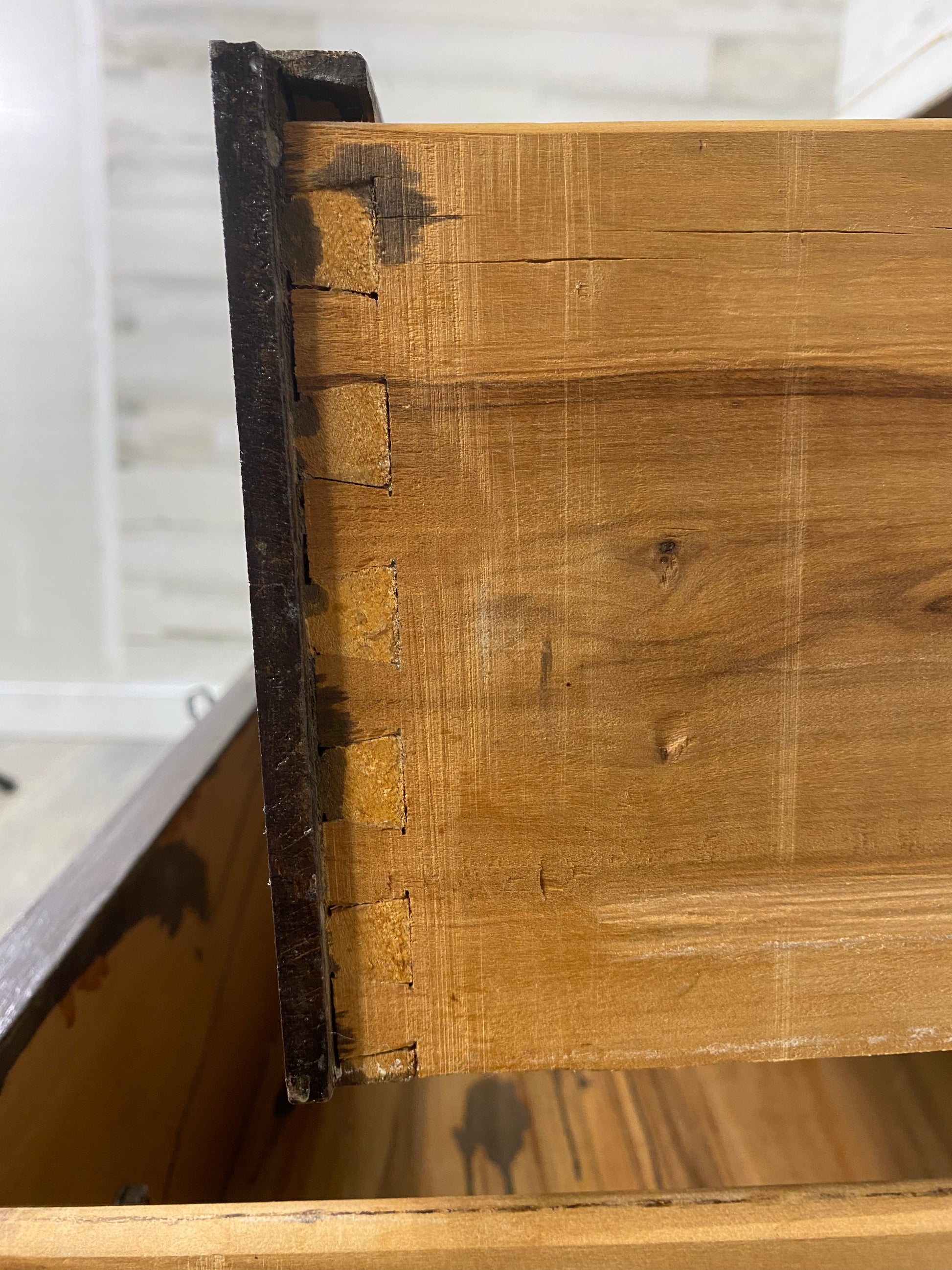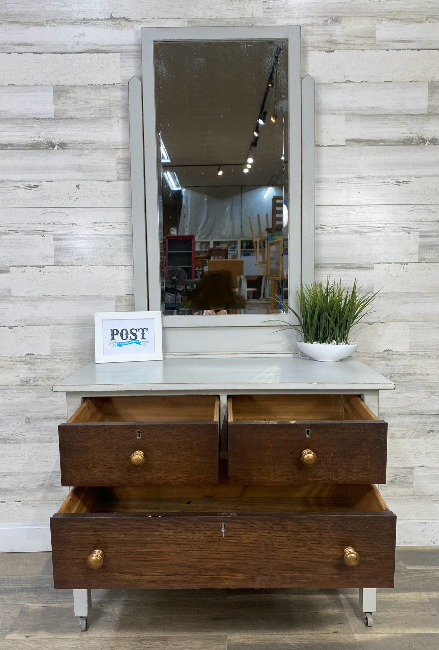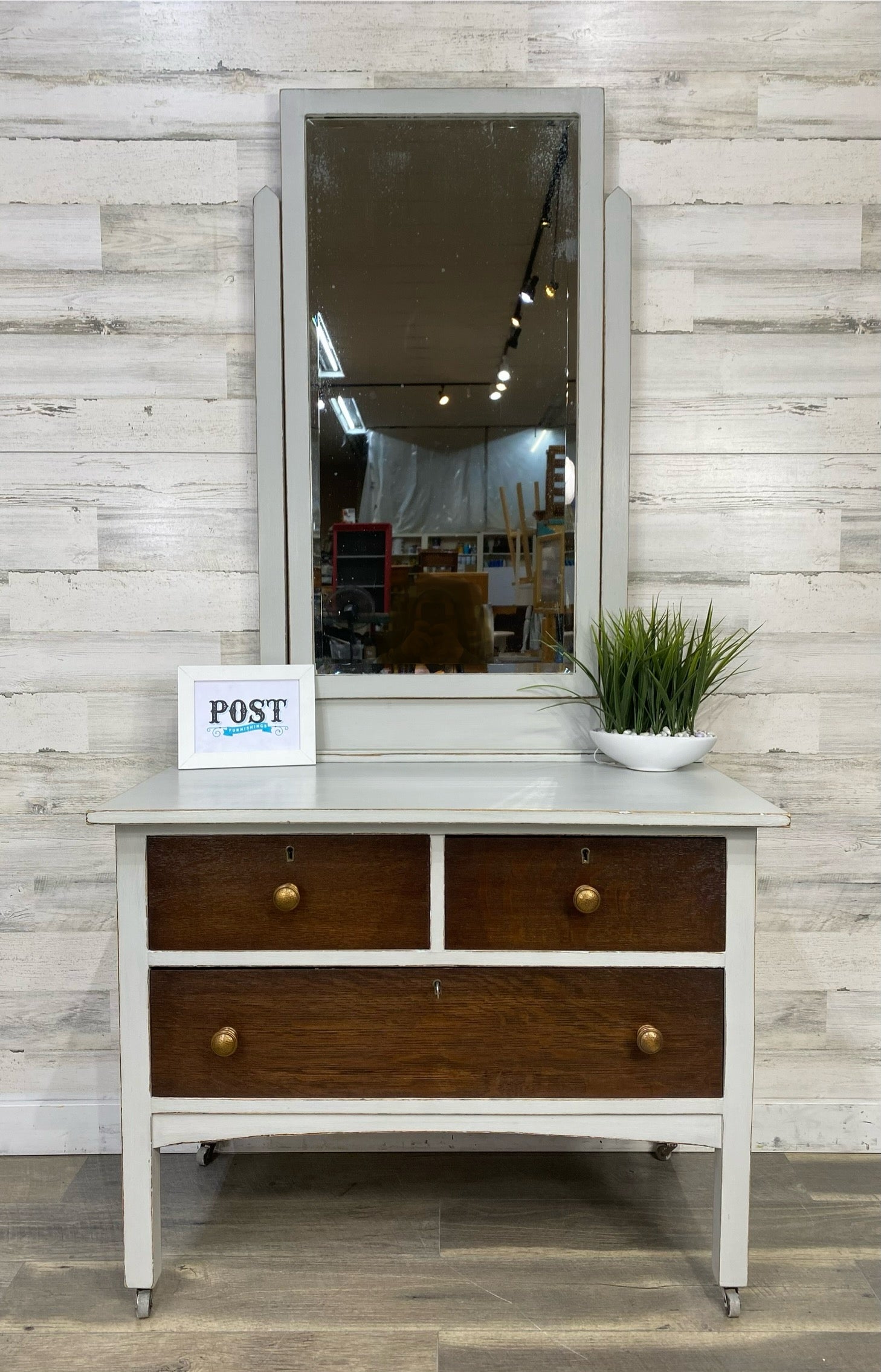 Refinished solid wood vanity dresser. Beautiful natural wood grain with accent gray for a farmhouse style. Drawers are dovetailed and have been treated with Glideator wood lubricant to slide properly.