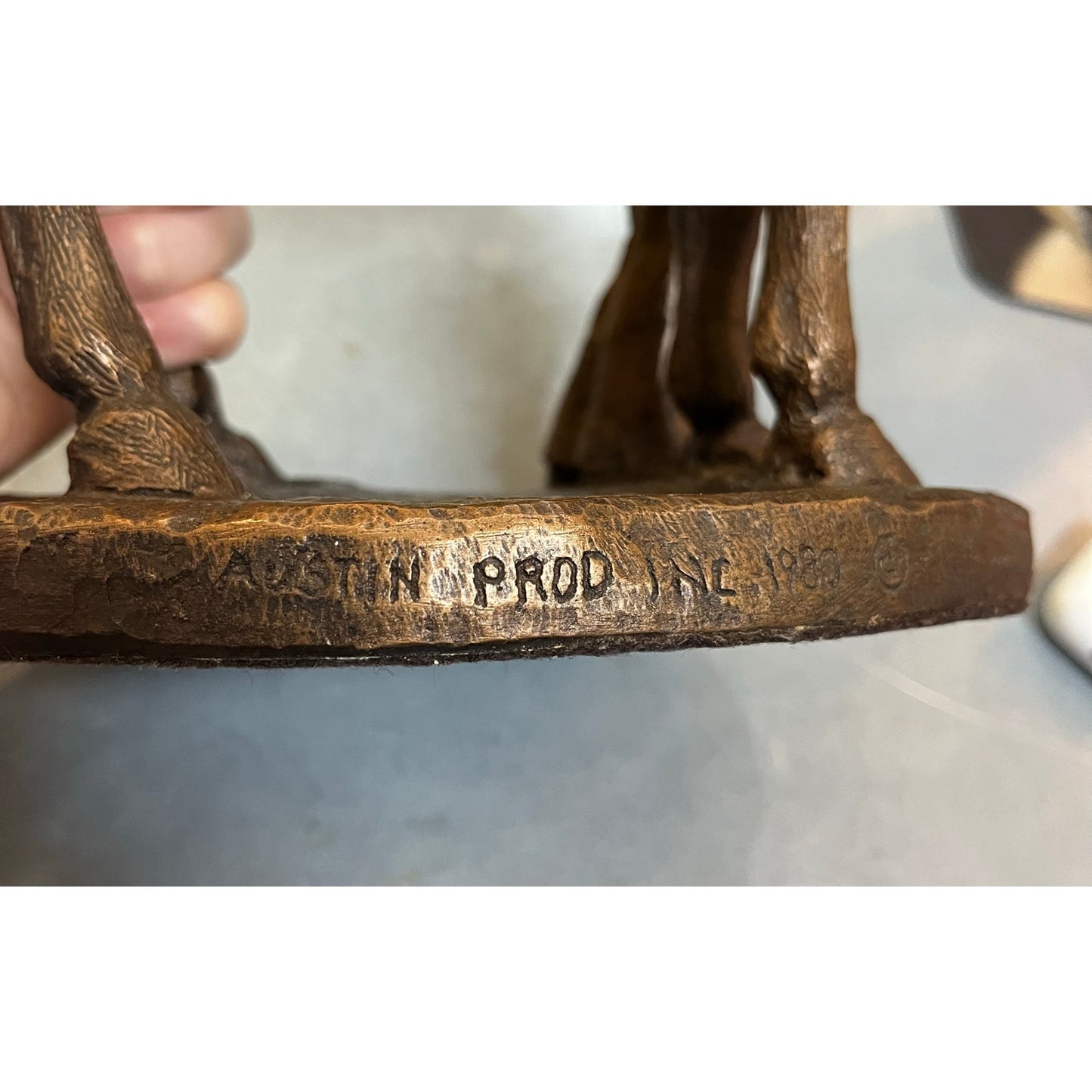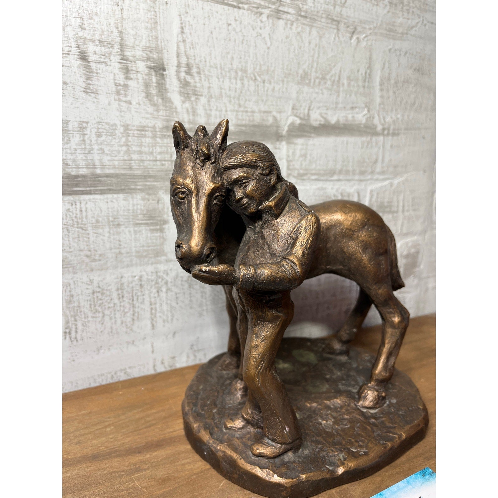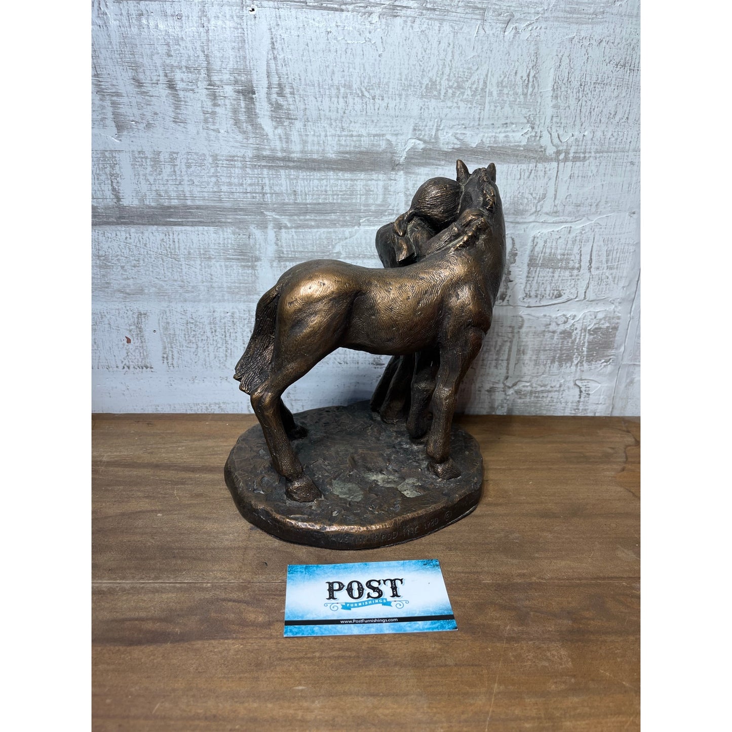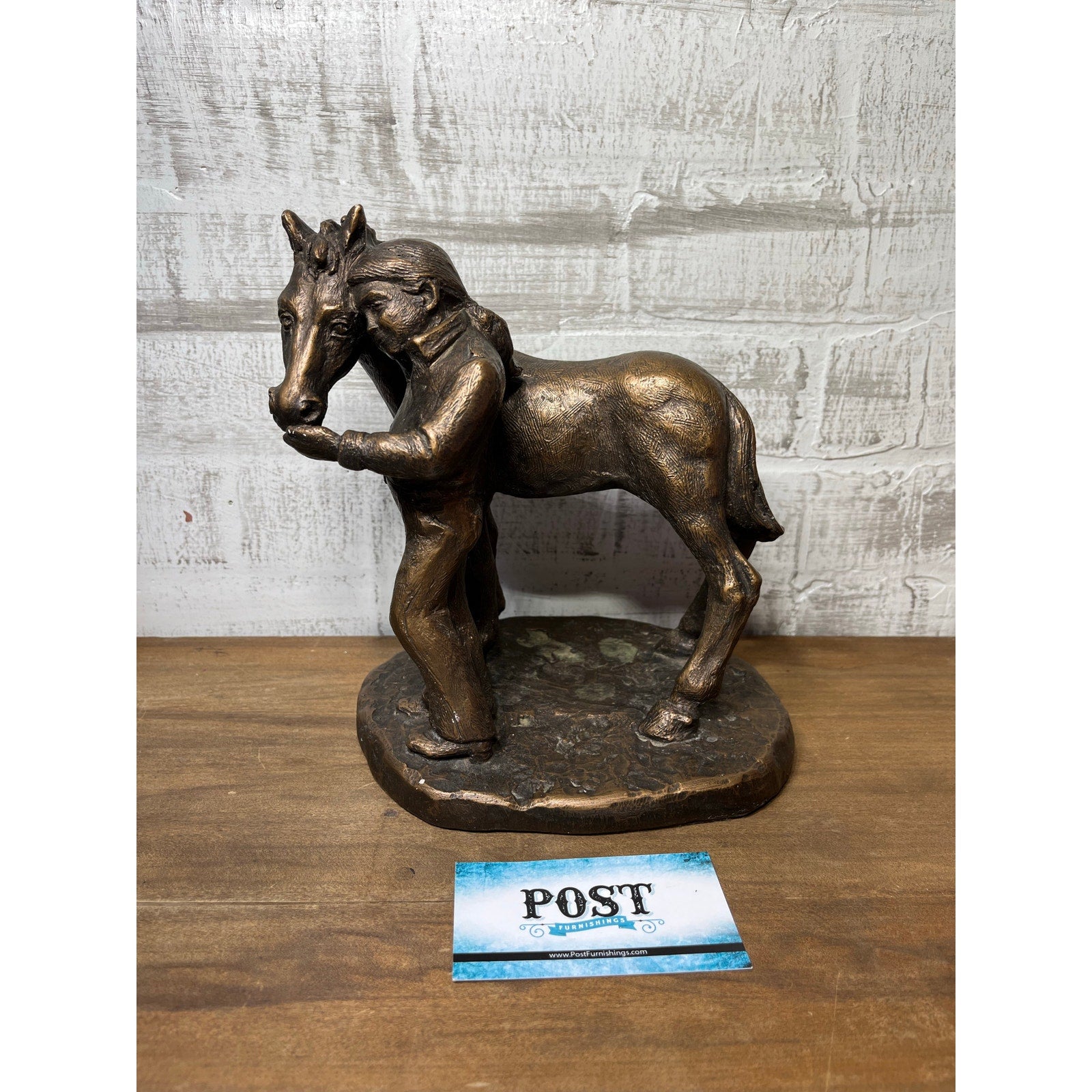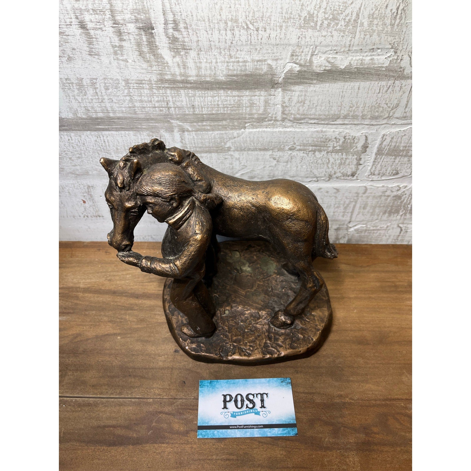 Brass statue, girl feeding a horse sculpture, made by the brand Austin Productions Inc circa 1980, it is 9” tall, 7” wide, 6” wide