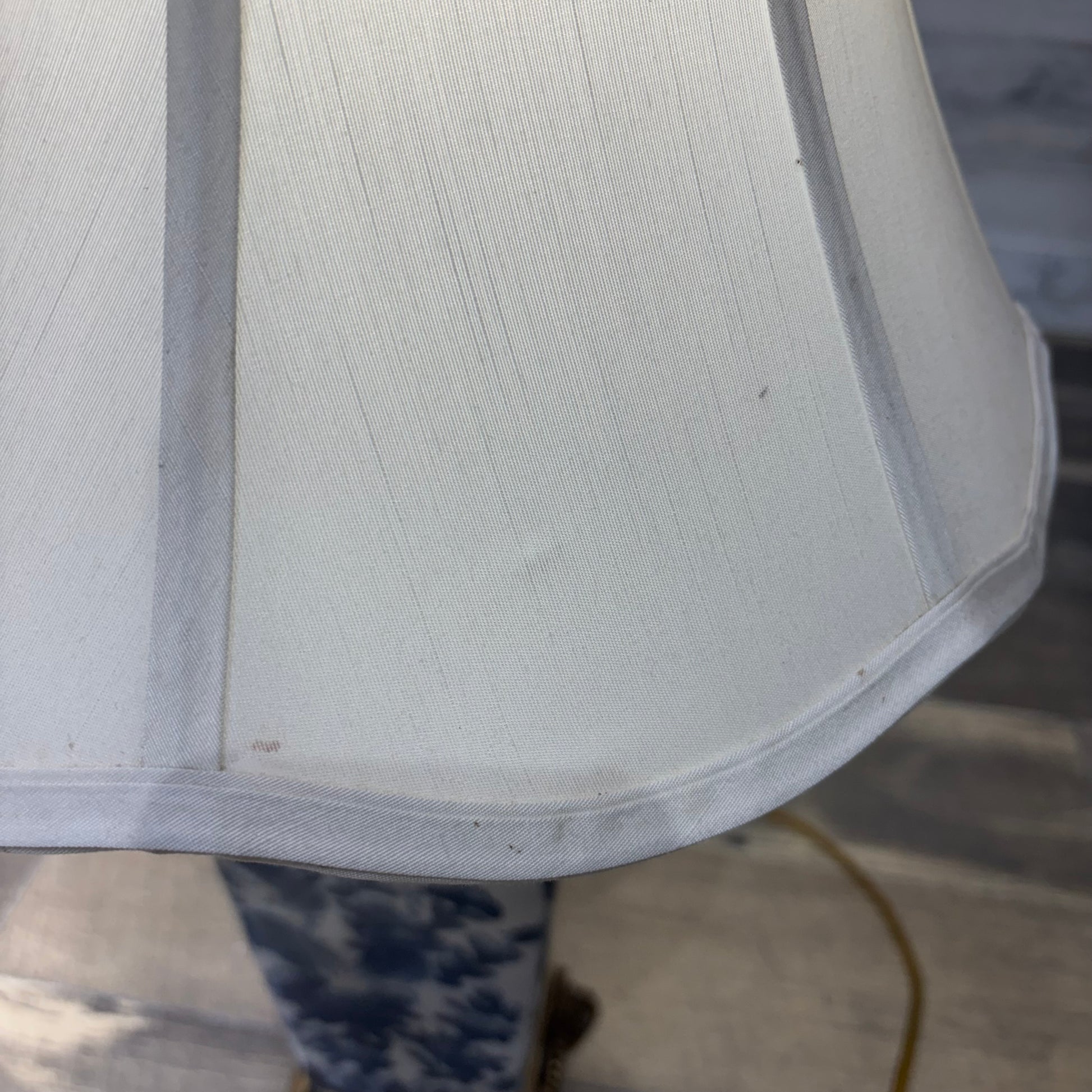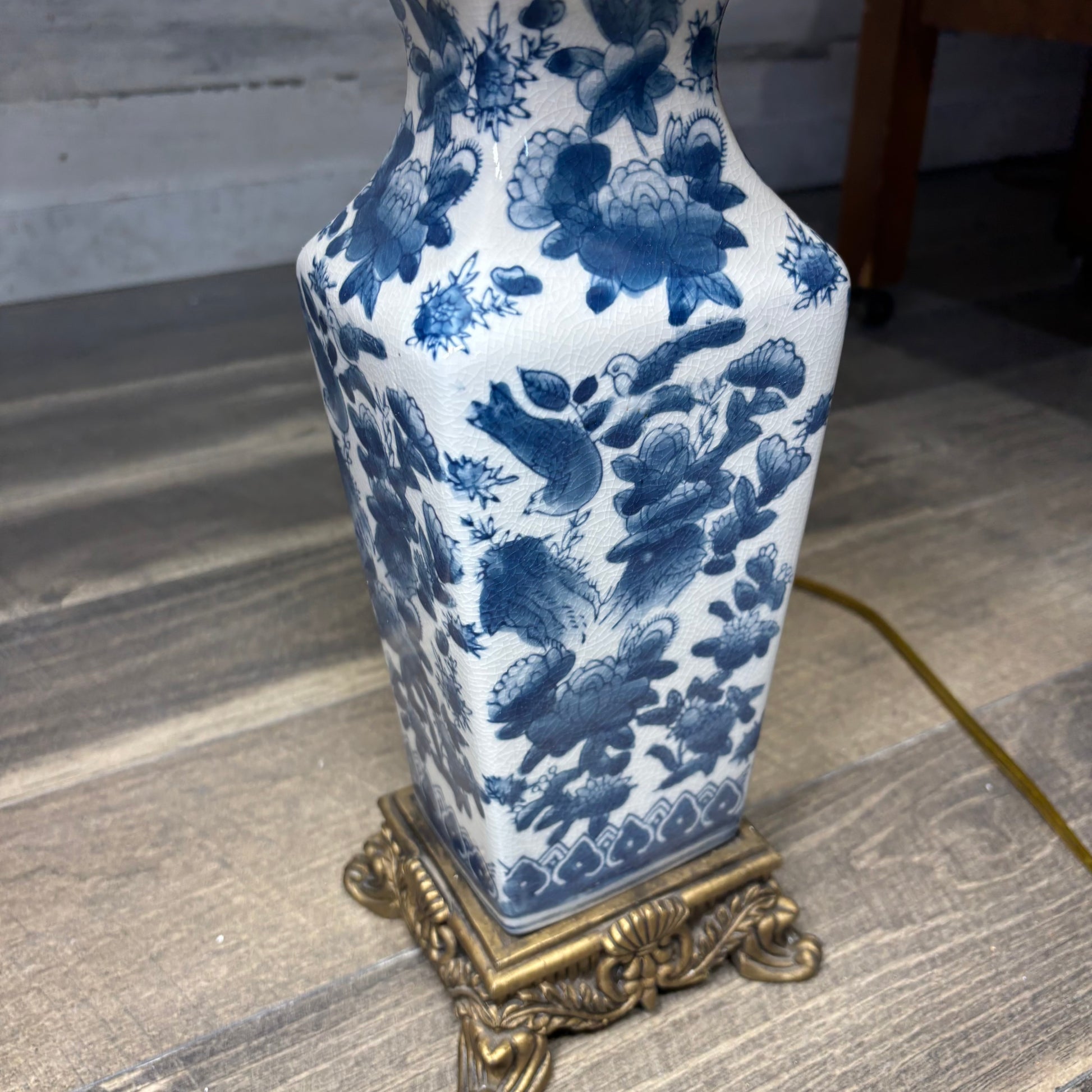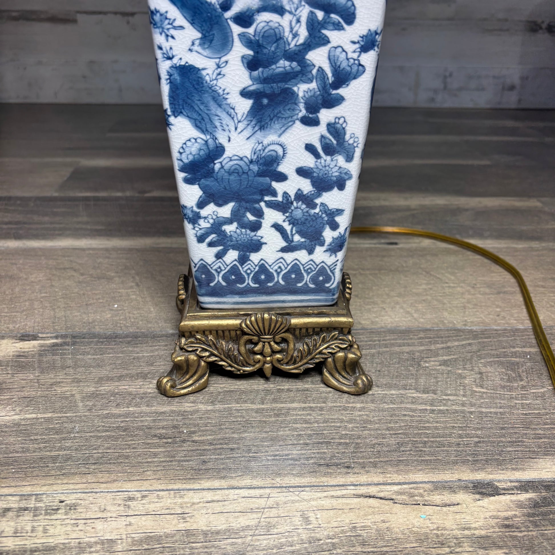 White and blue floral pattern porcelain brass square bottom table lamp, white lamp shade, it has some spots can be seen in photos, 26” tall with lamp shade, 14” wide shade, 5.5” by 5.5” base