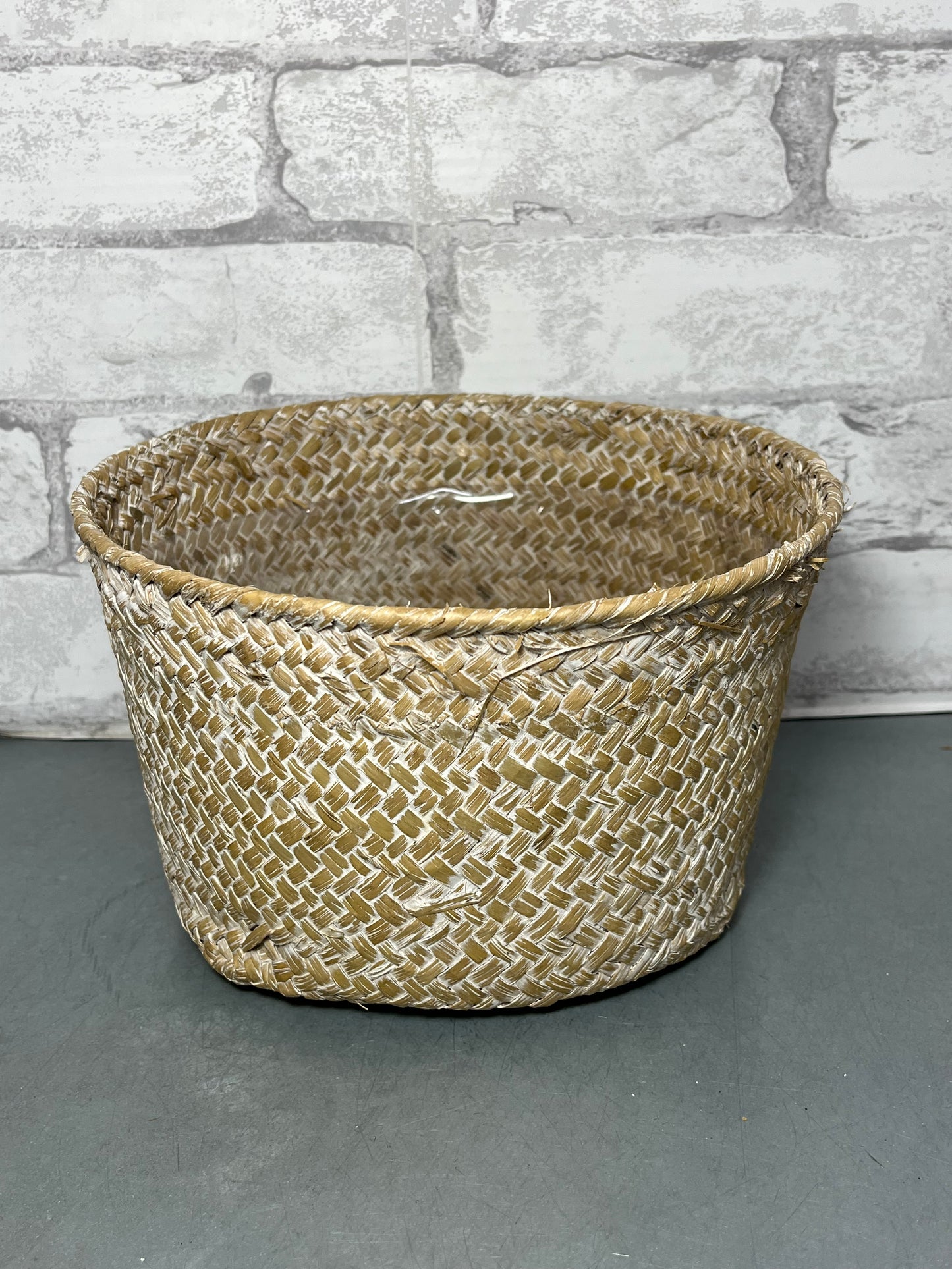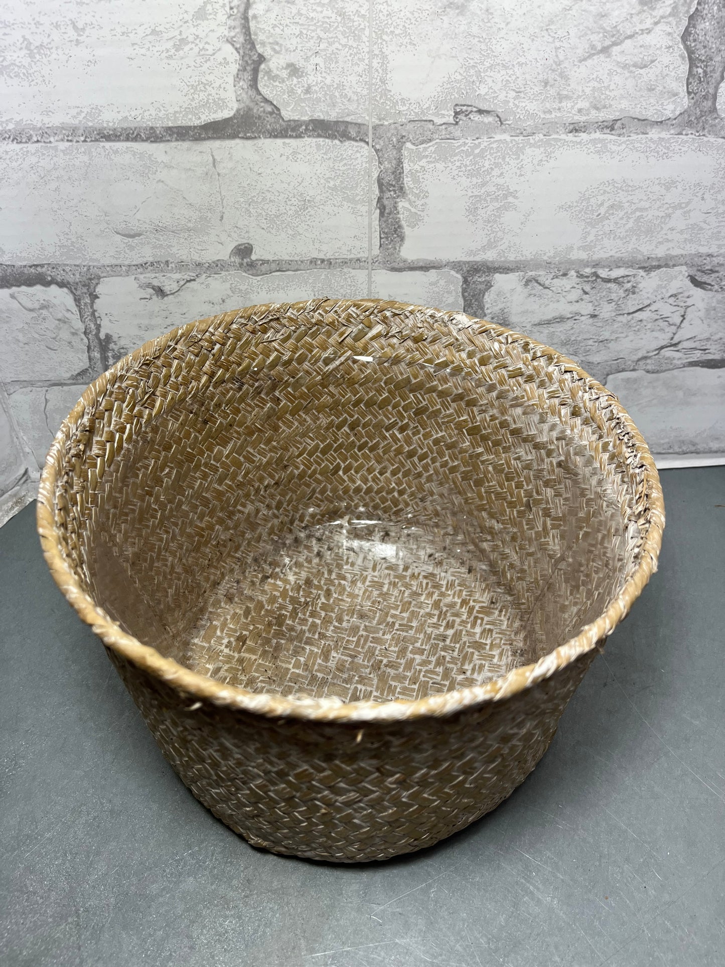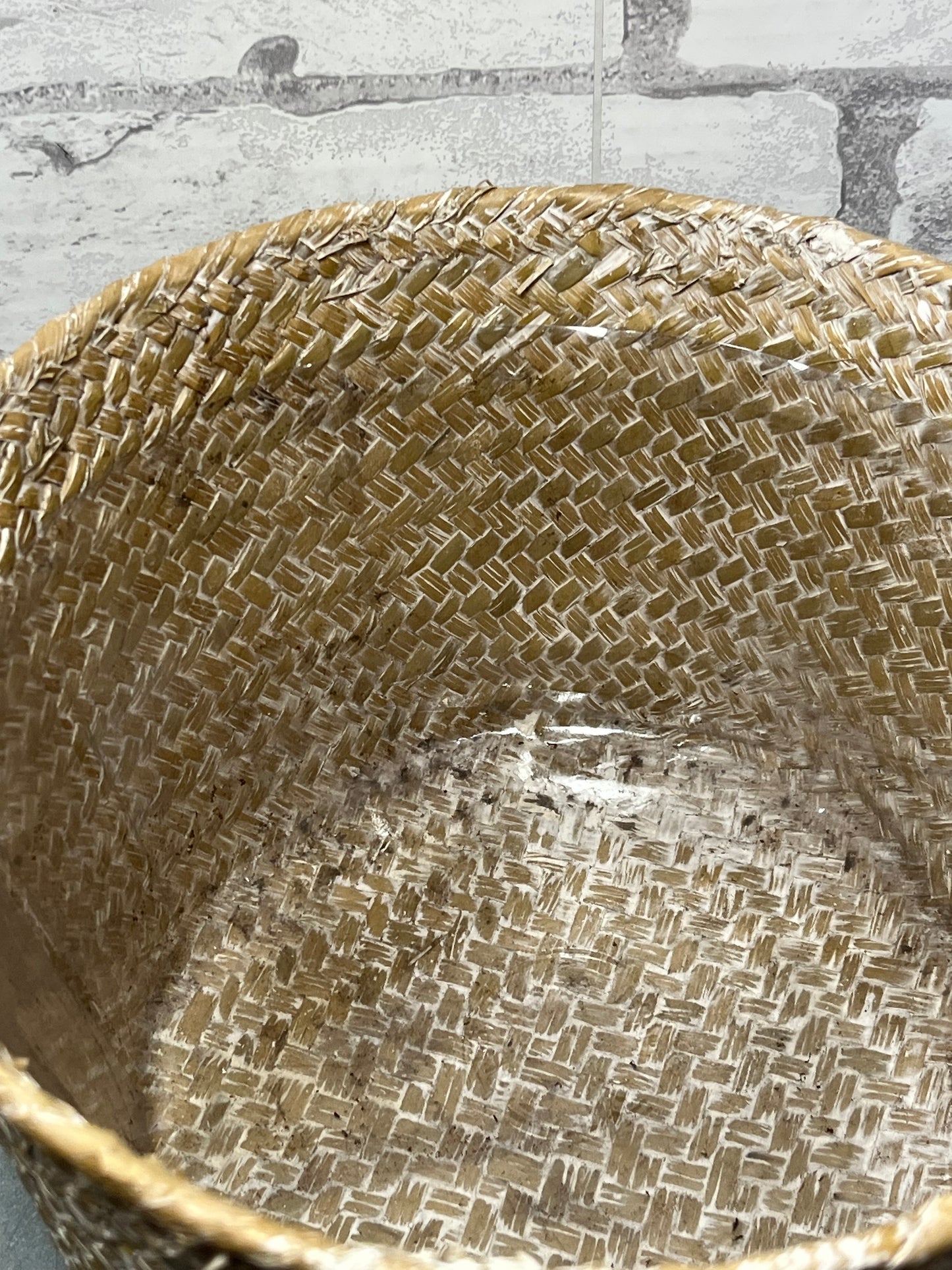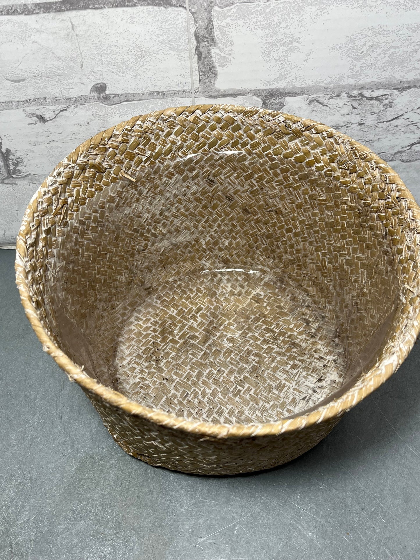 Bamboo basket has a plastic lining, great for plants and storing items, it is 9” wide, 6” deep