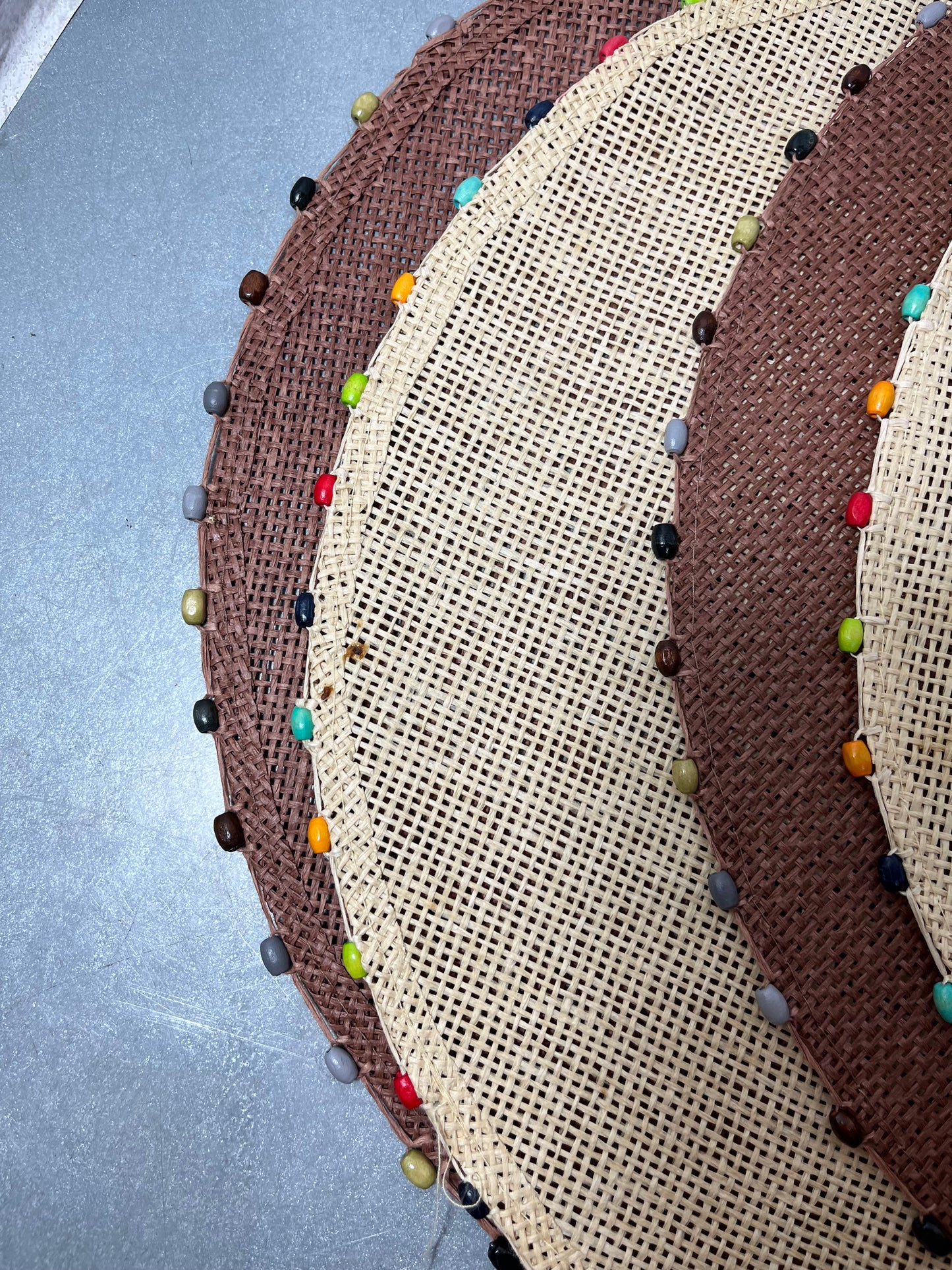 Set of 4, some stains can be seen in the photos, multiple color bead detailing around the ends, two tan colors and two brown, it is 15.5” diameter