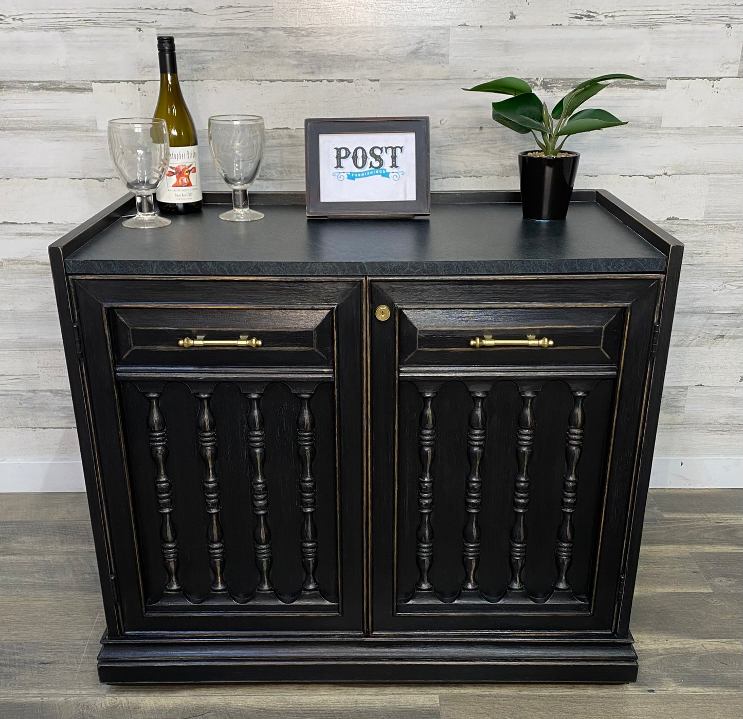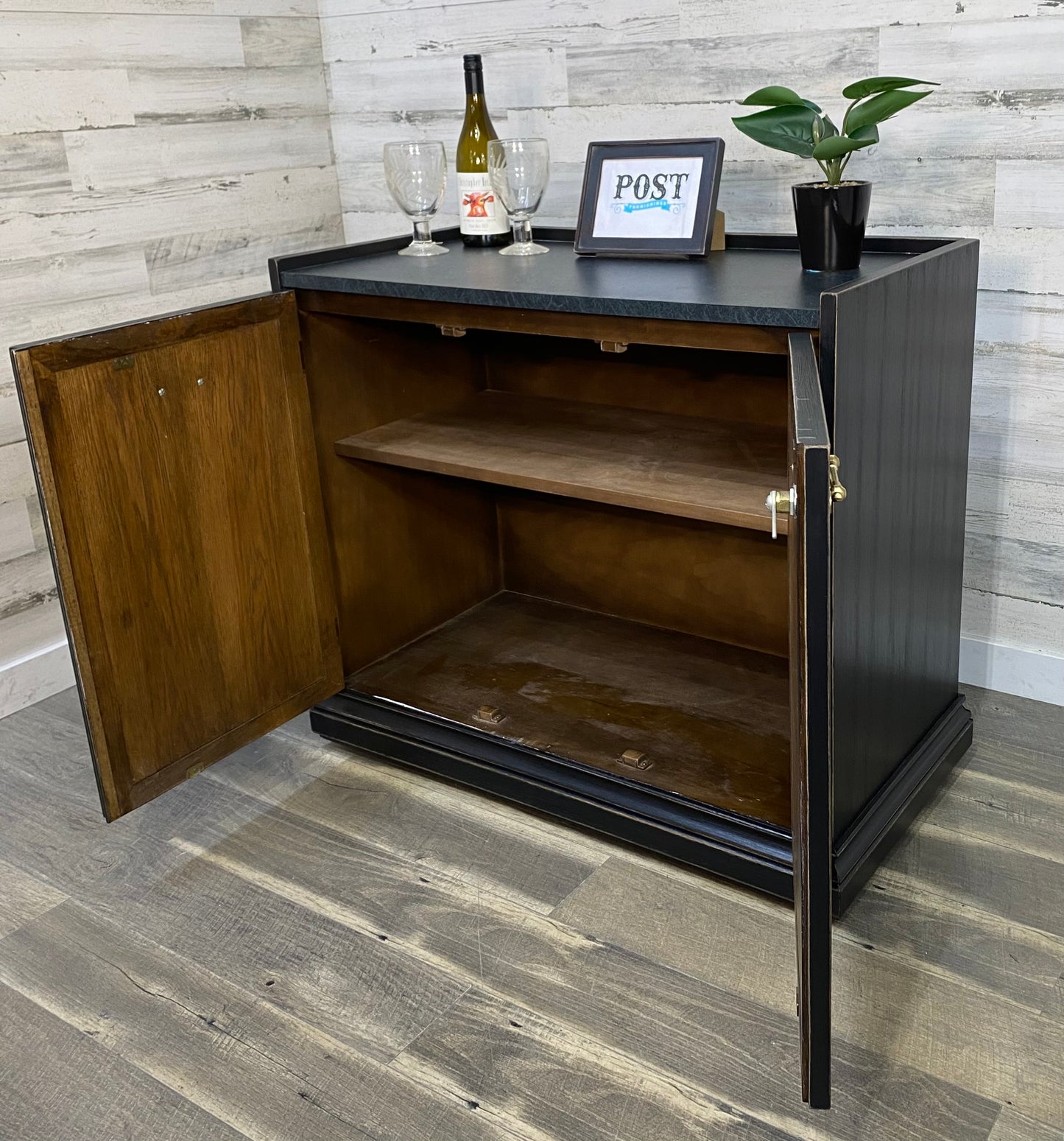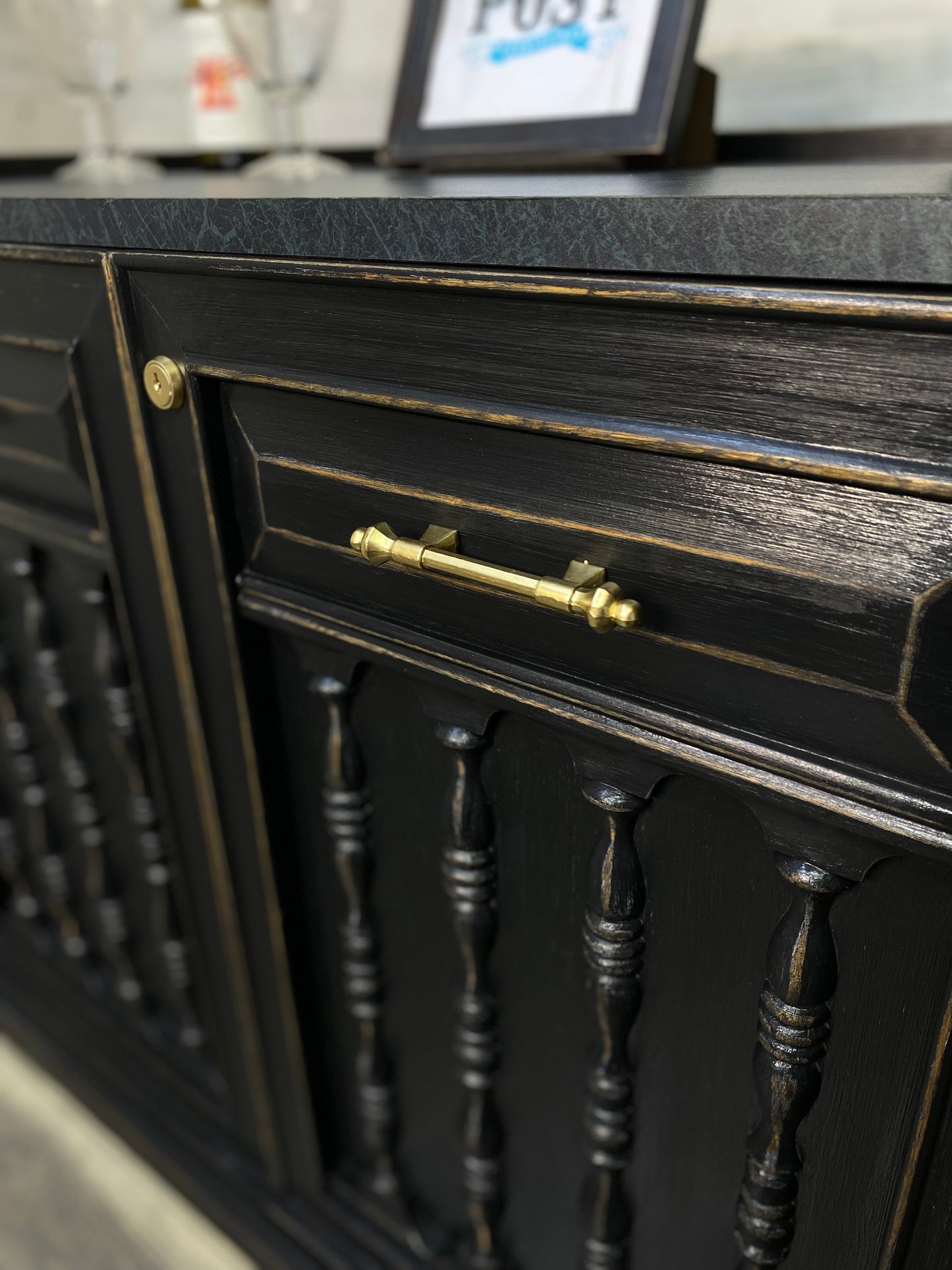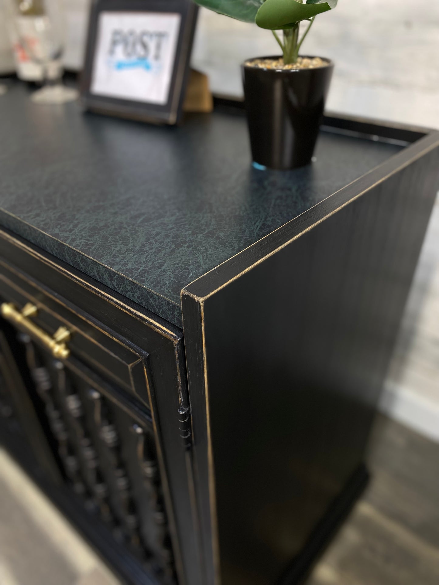 Refinished vintage buffet server. Black with light distressed. Very sleek, on wheels and durable top surface. Has a lock but it is not functional.