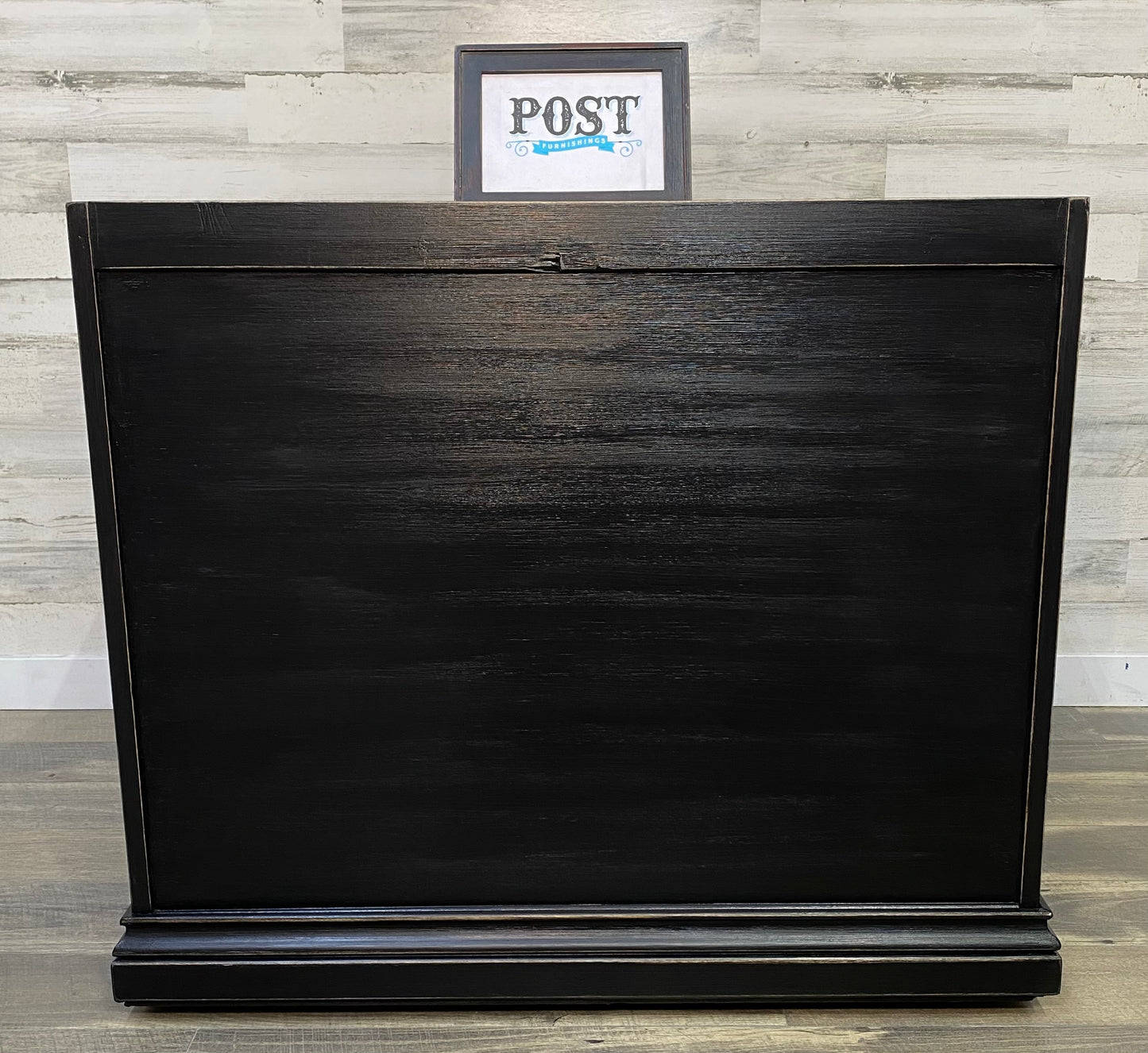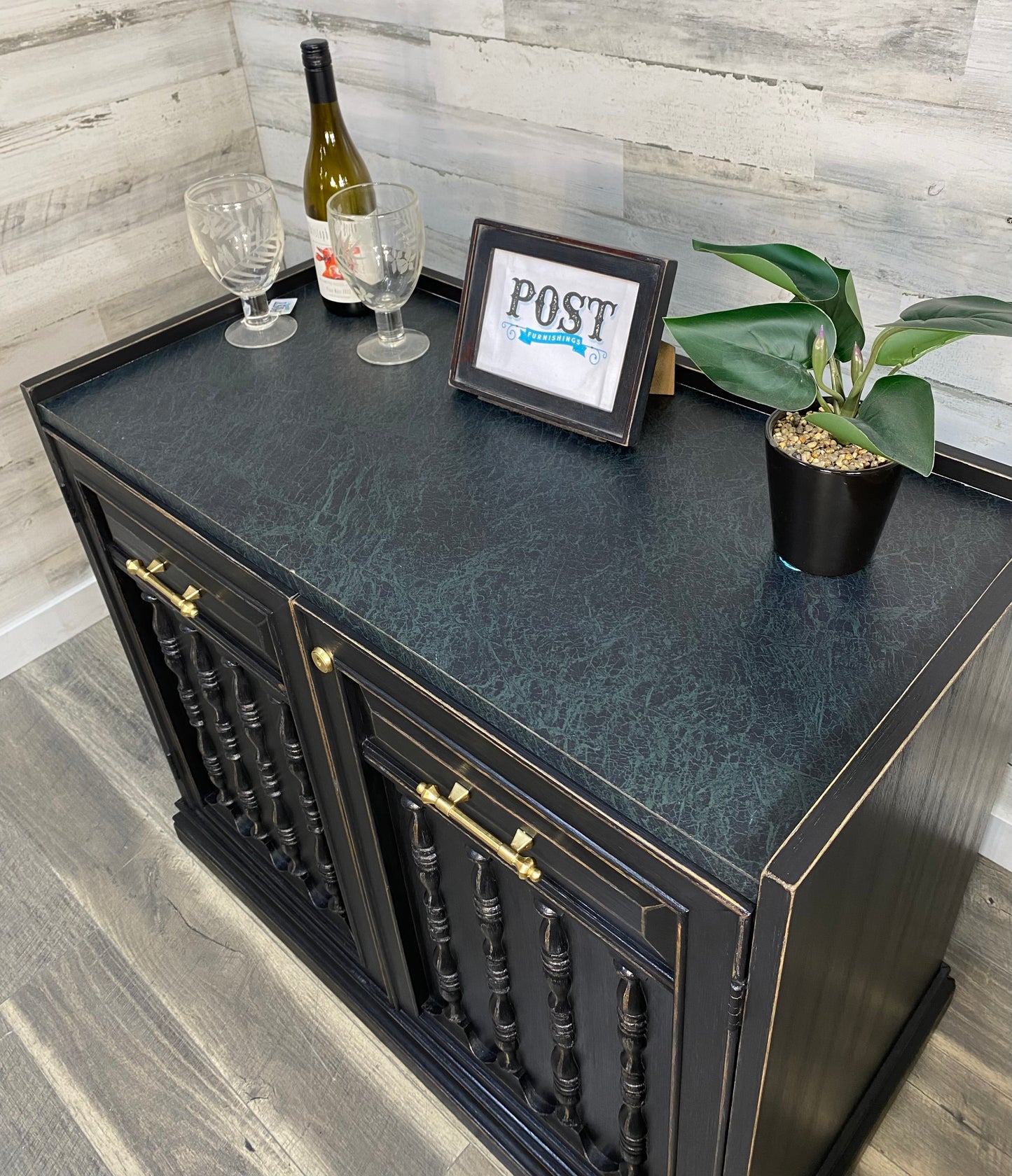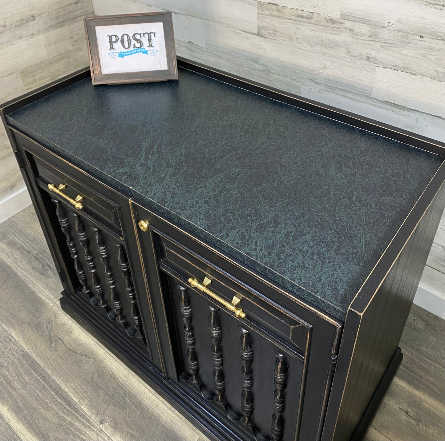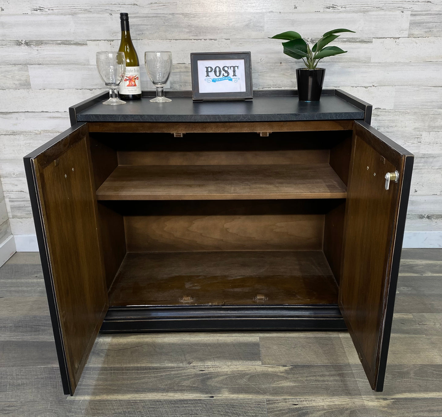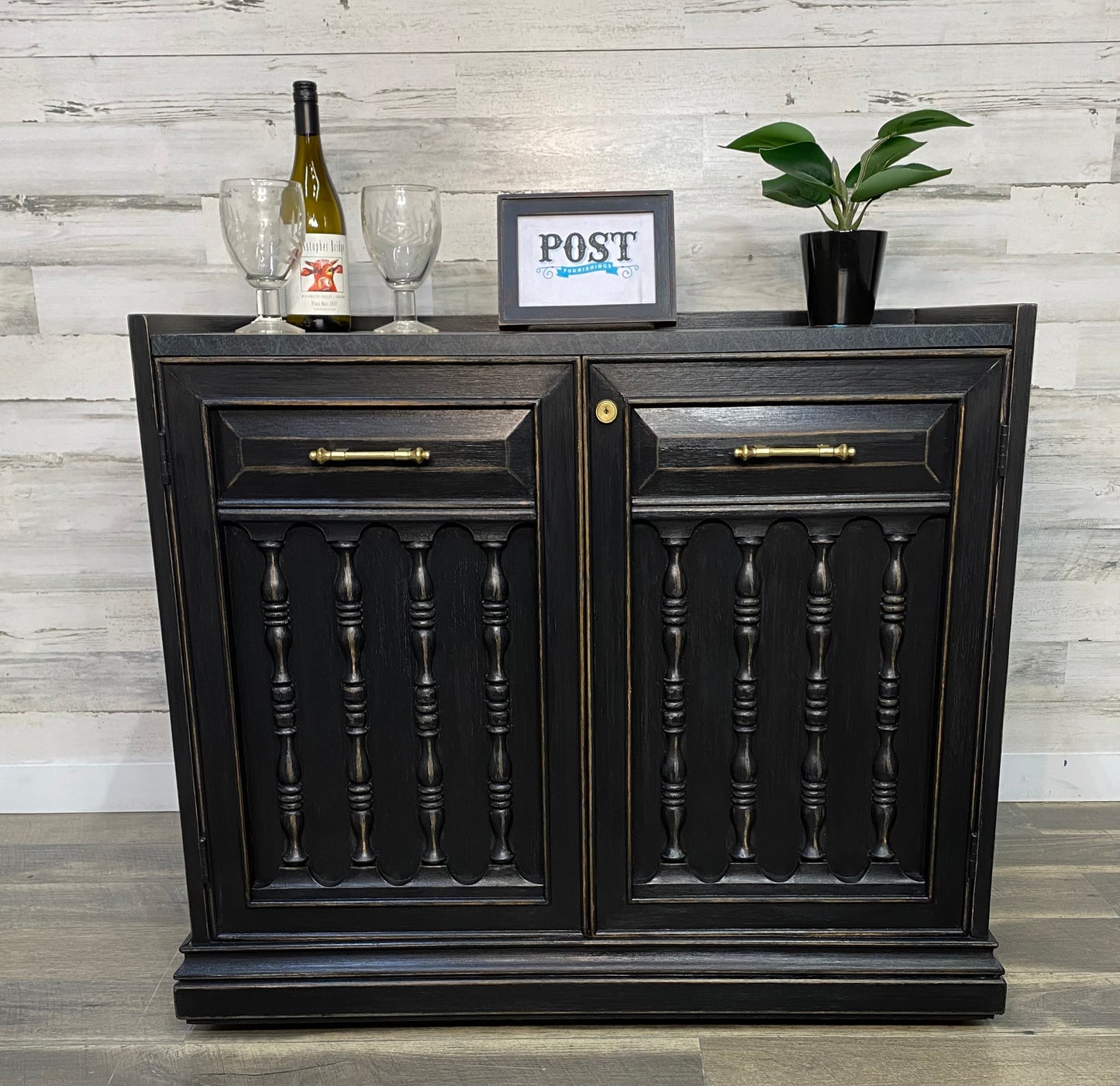 Refinished vintage buffet server. Black with light distressed. Very sleek, on wheels and durable top surface. Has a lock but it is not functional.
