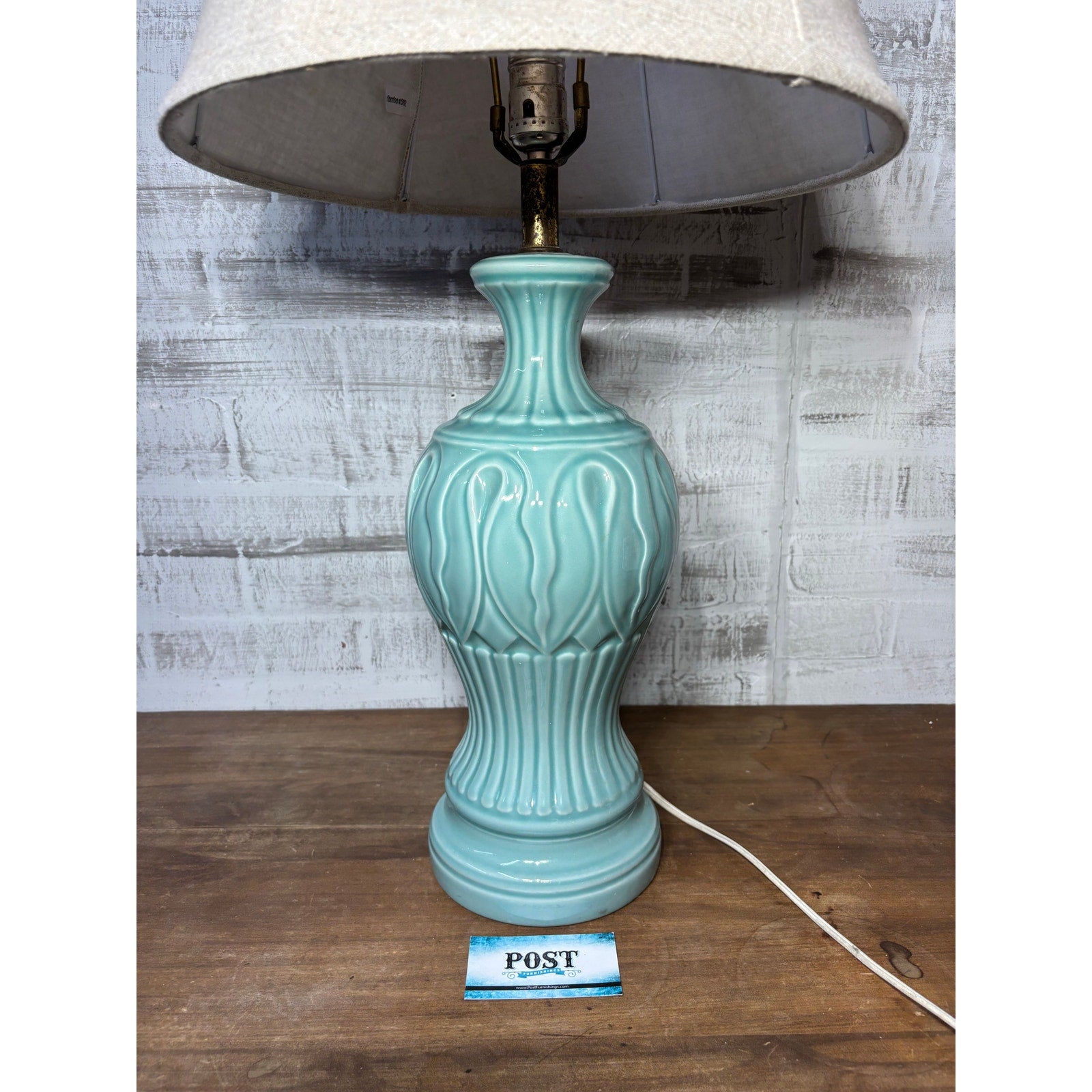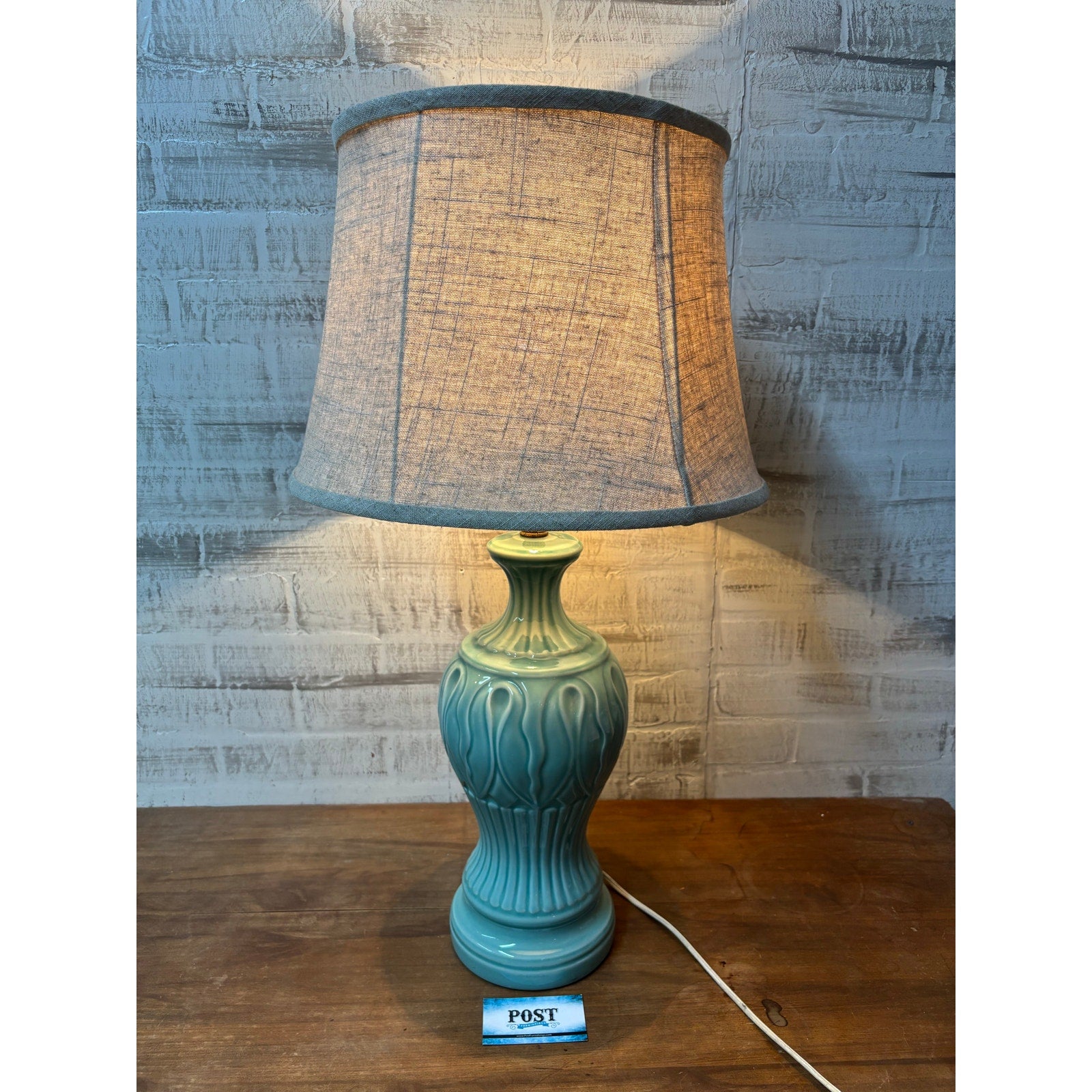 Light Blue textured table lamp, made of porcelain with a tan lamp shade, it is 29” tall, shade is 16” wide