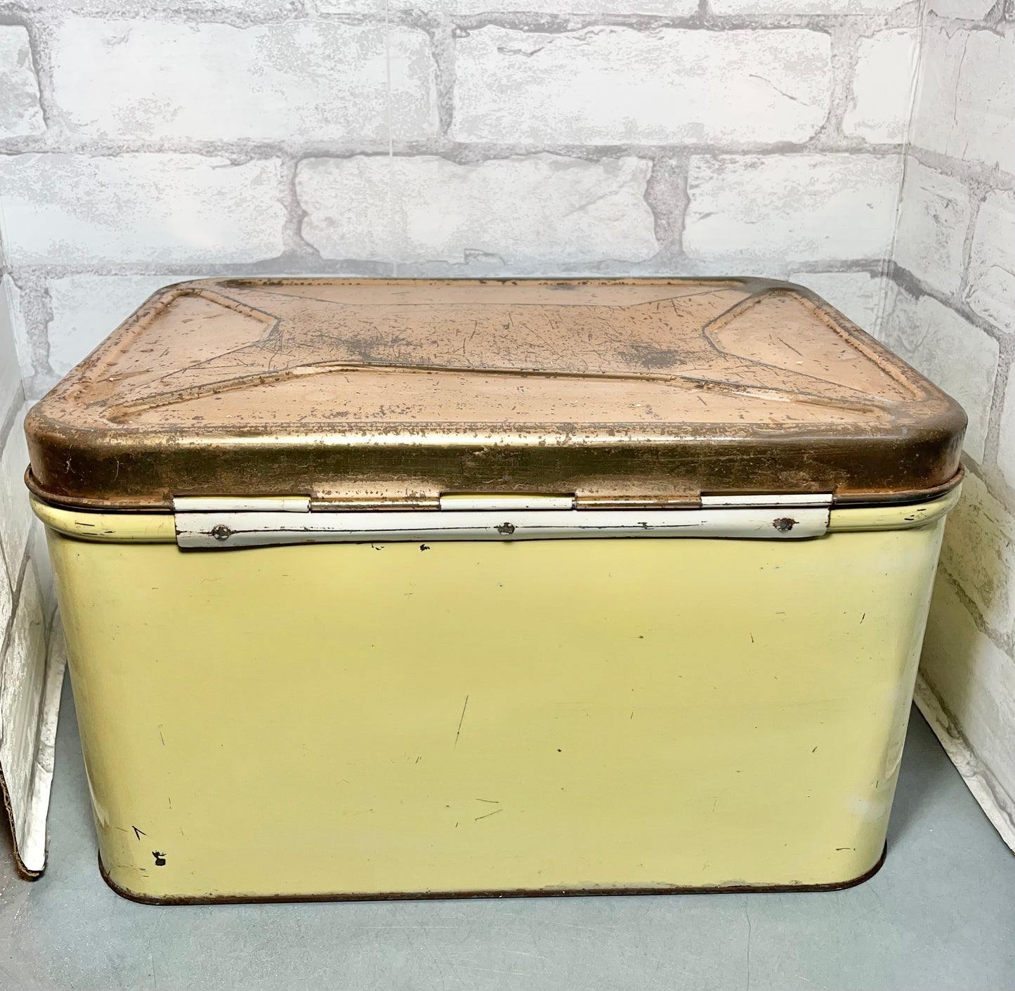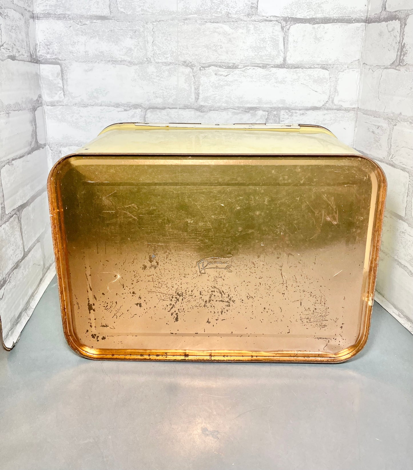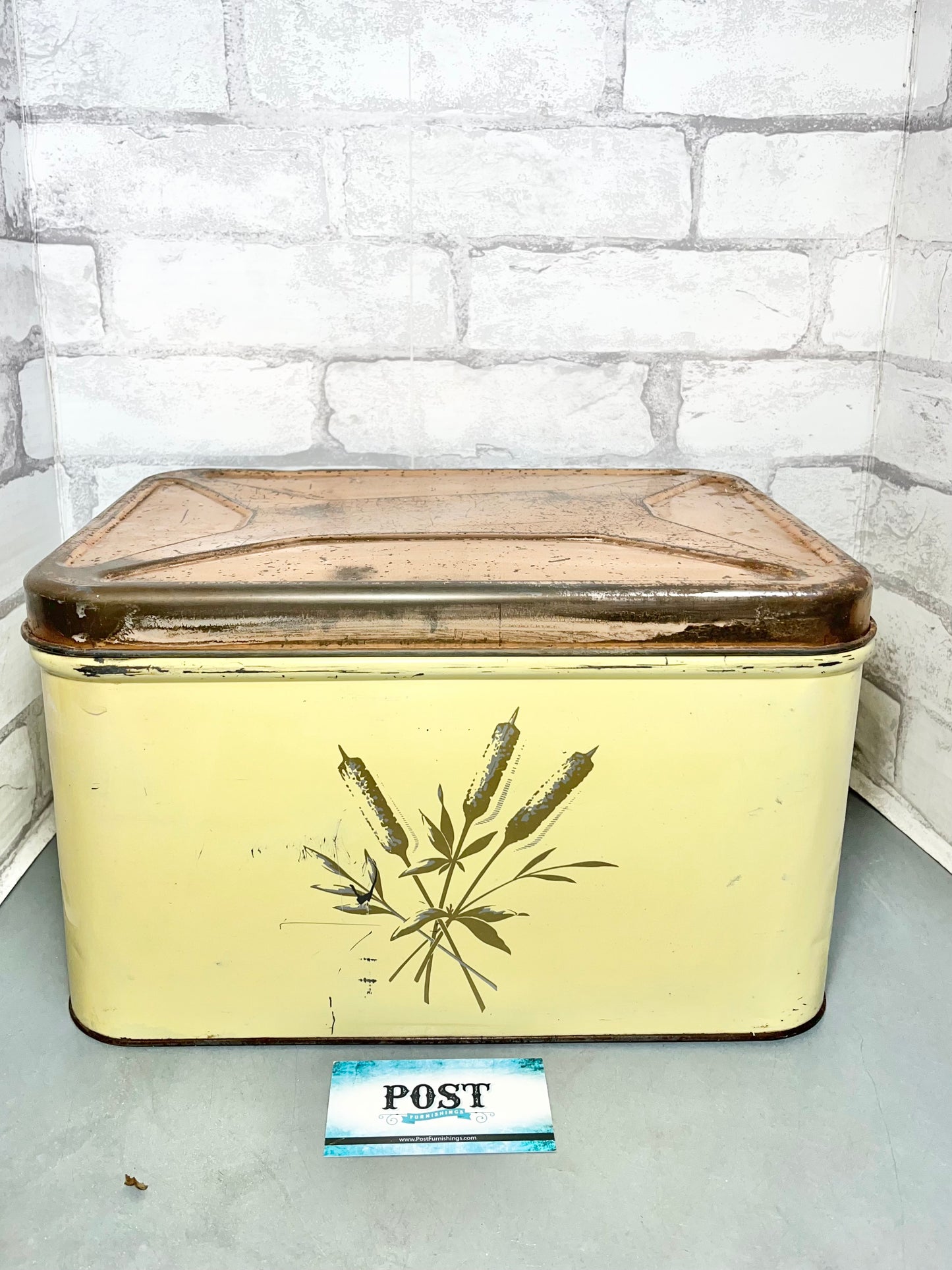 This is a Decoware Metal Bread Box, made of metal, has some ware and rust due to old age. Used for bread but can be use as decor, storing items, etc. 8” tall, 14” long, 9” wide.