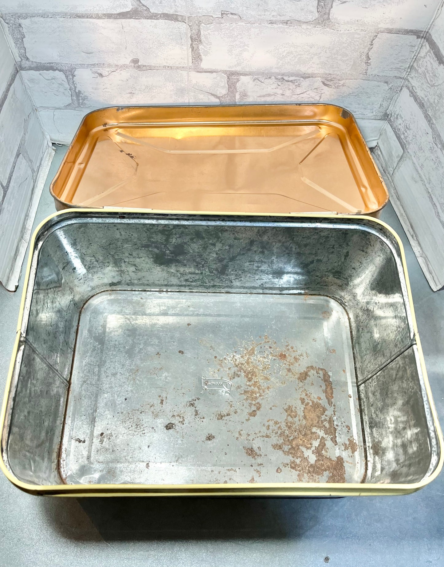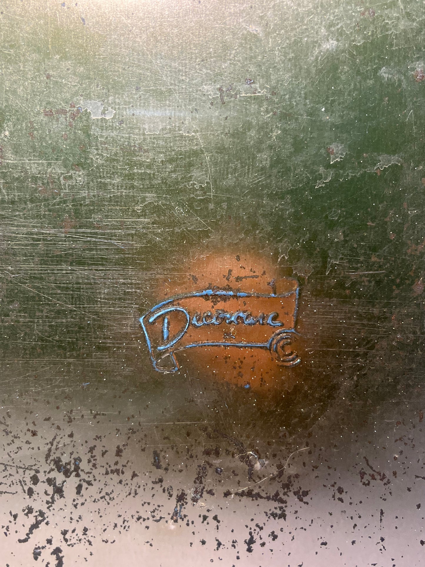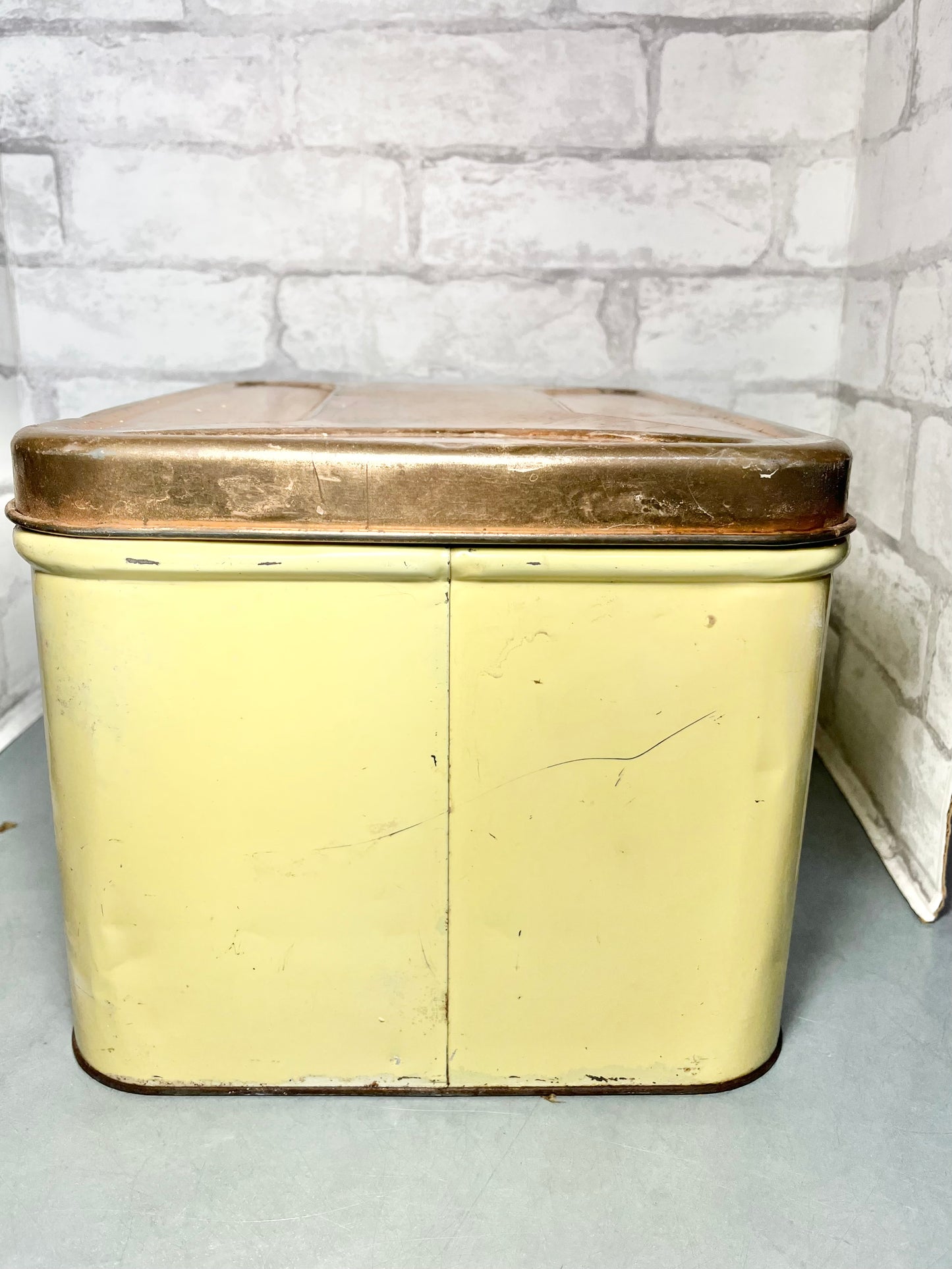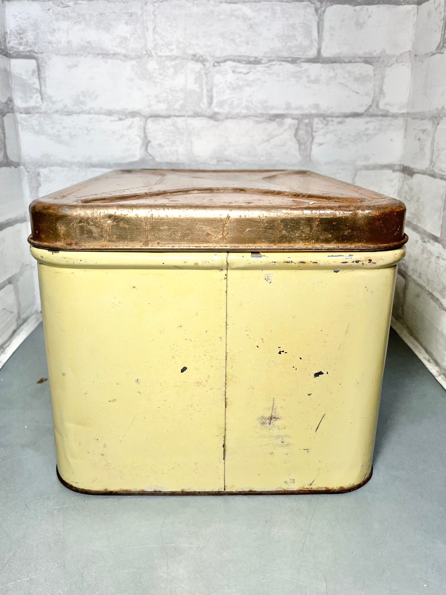 This is a Decoware Metal Bread Box, made of metal, has some ware and rust due to old age. Used for bread but can be use as decor, storing items, etc. 8” tall, 14” long, 9” wide.
