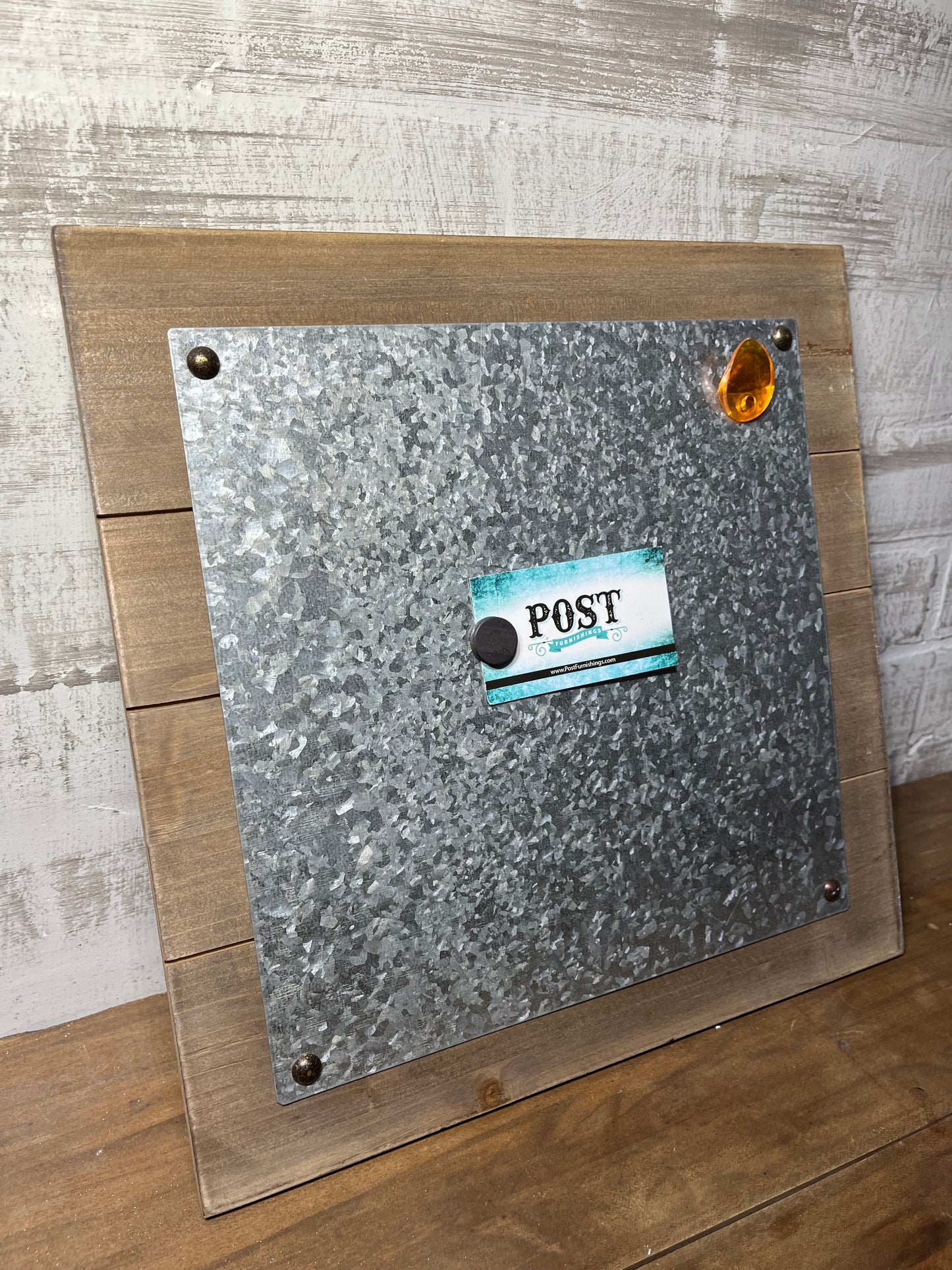 Wooden background with a galvanized metal plate, its magnetic display your favorite pictures or reminders, chalk marker can be used in it as well, hang it on the wall, it is 13.5” x 13.5”