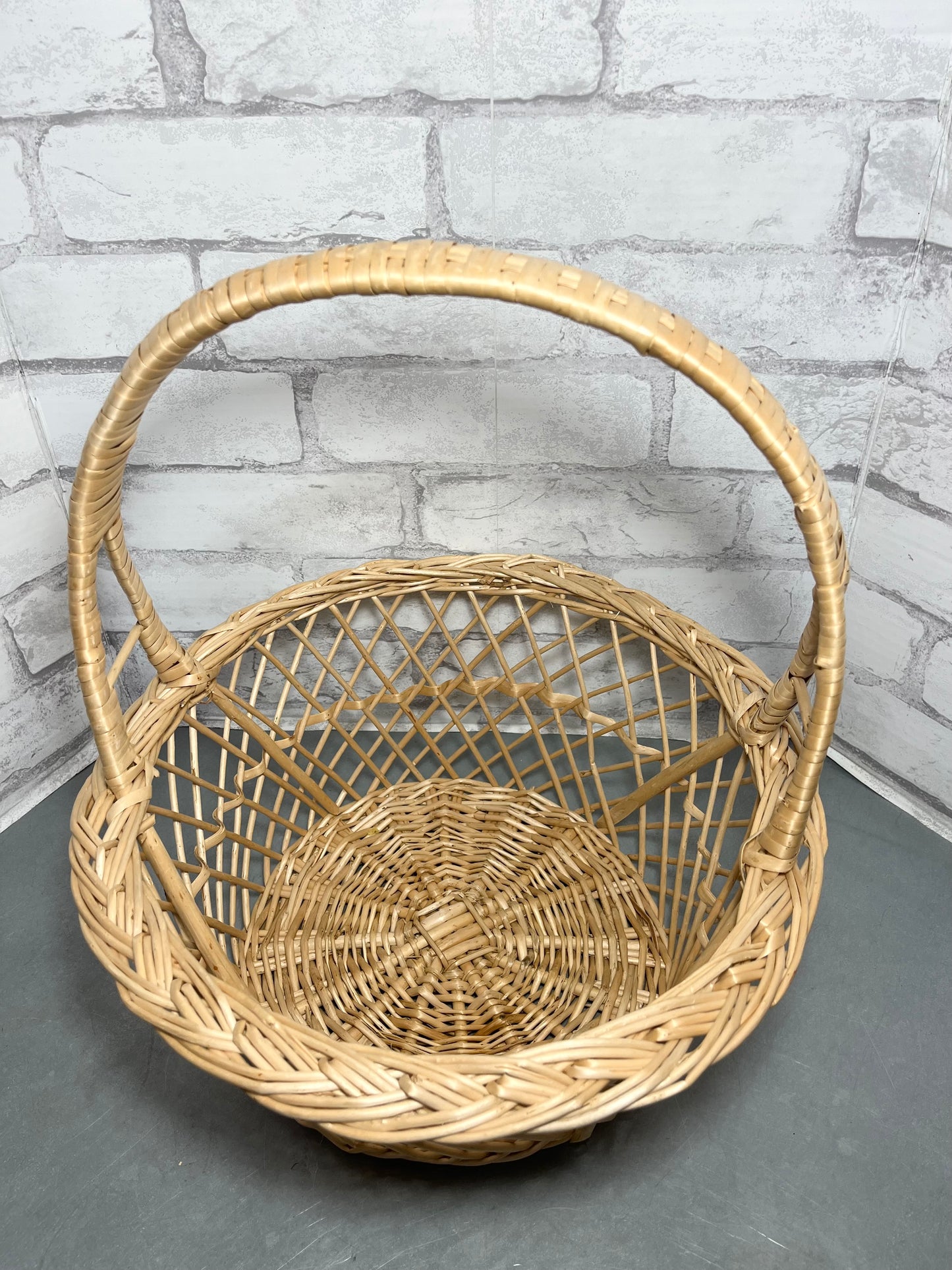 Great for collecting veggies from the garden, this wicker basket is perfect just about anything, it’s tan coloring and beautiful design give a mid century style. It’s 15” wide, 7” deep, 15” tall W/ handle