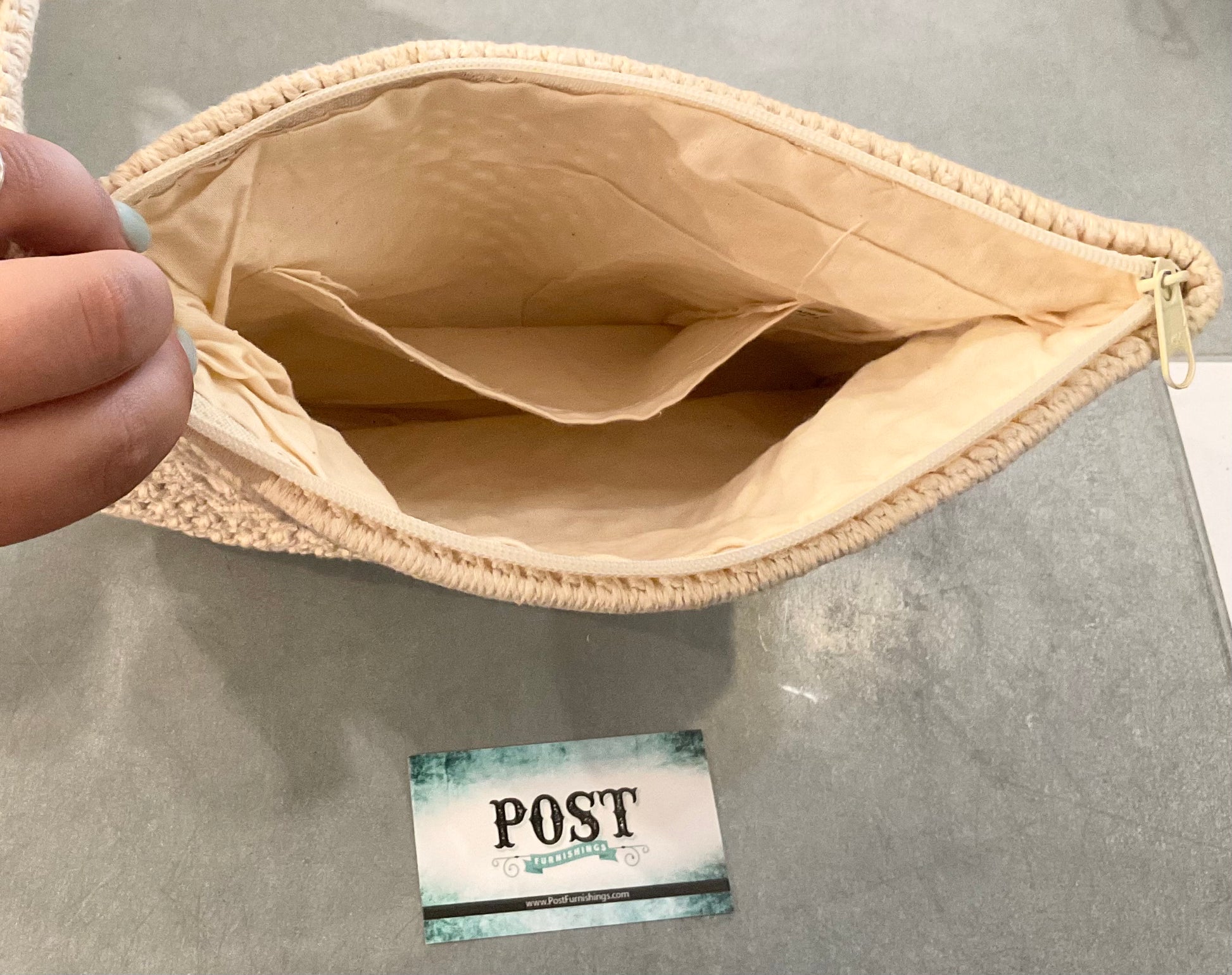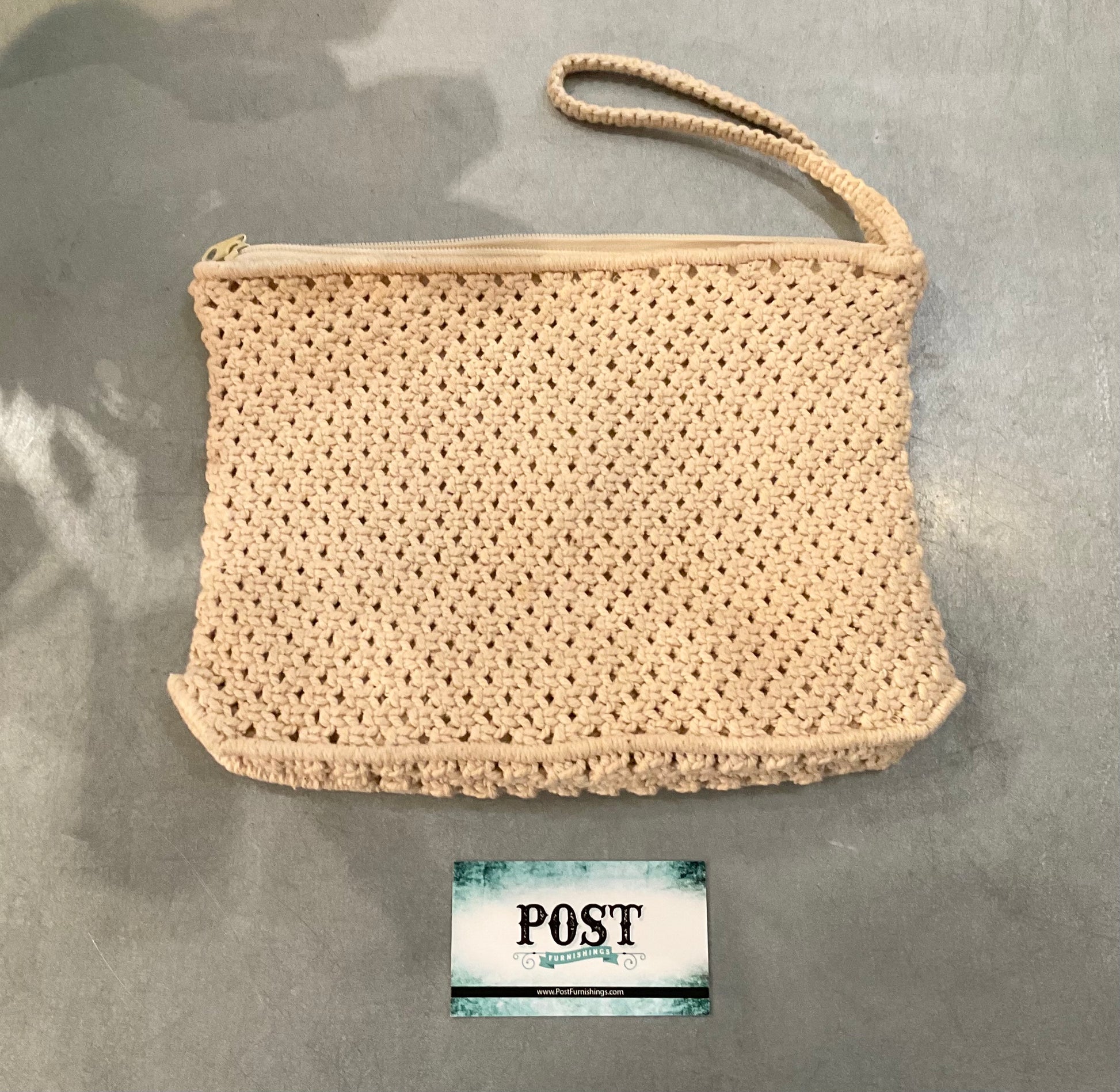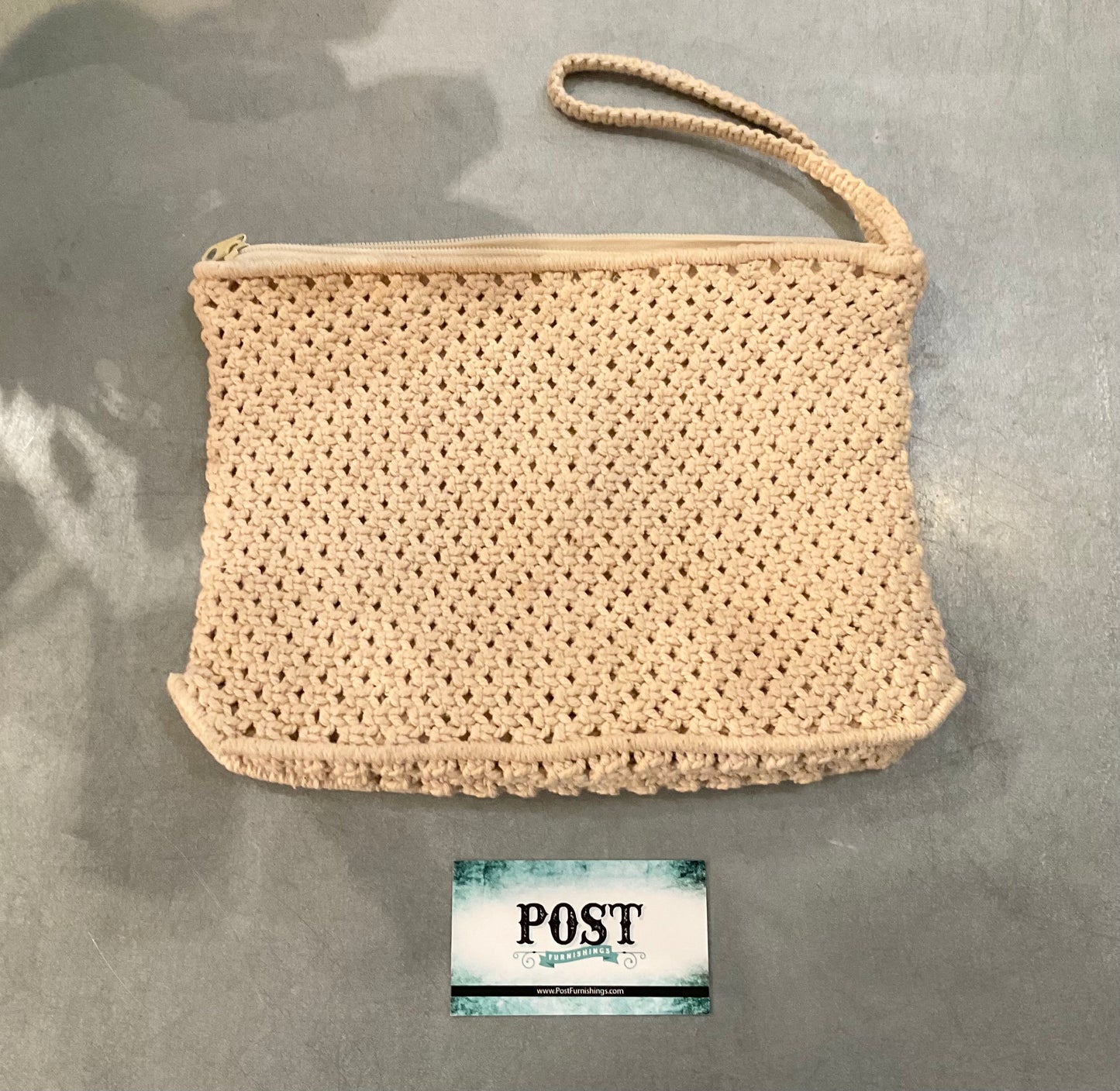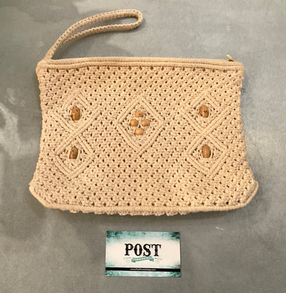 Macrame clutch. Wood bead detailing on the front. Great condition. Has a zipper closure at the top. One pocket on the inside. And a wrist strap. 11” x 8”.