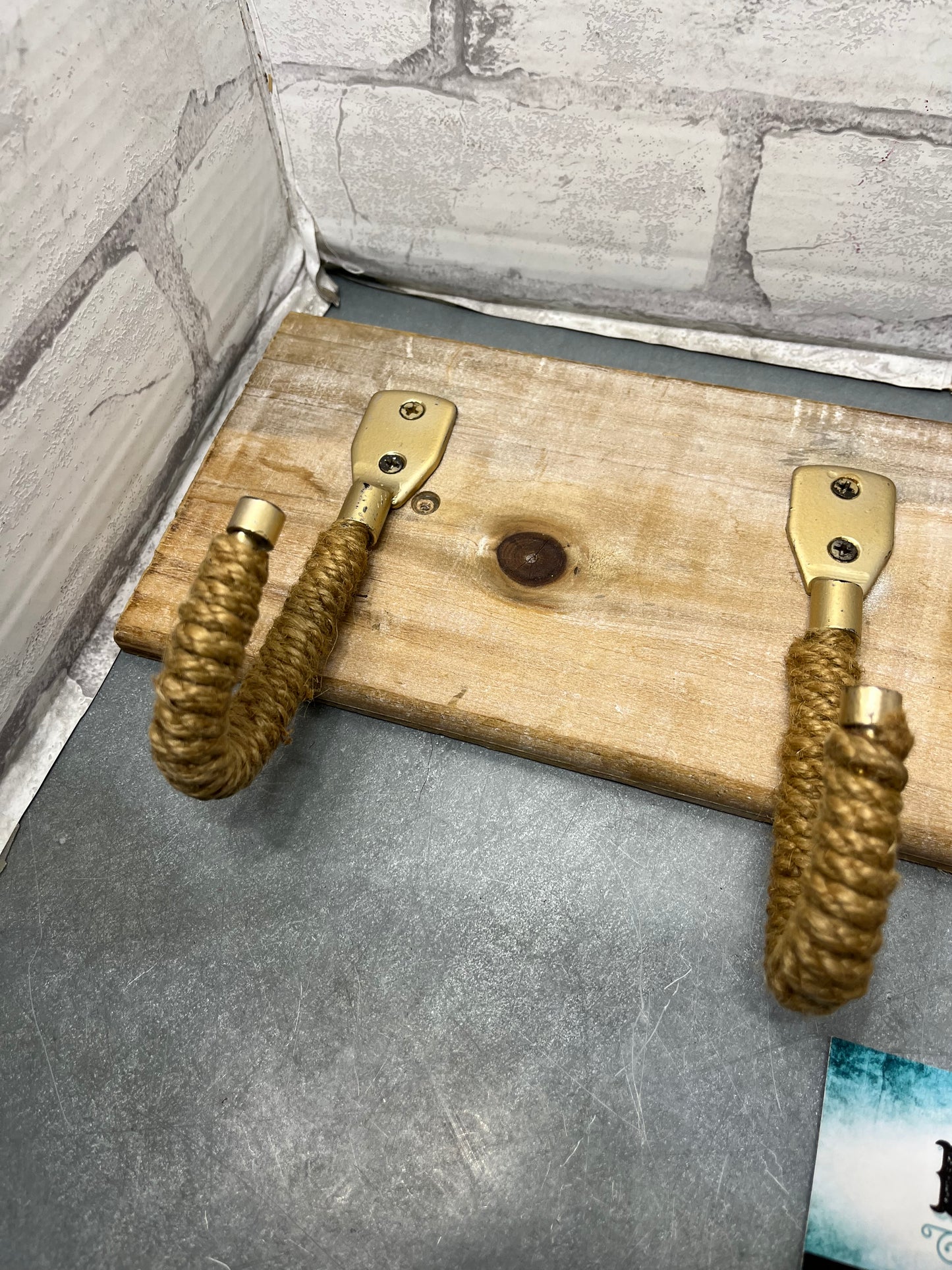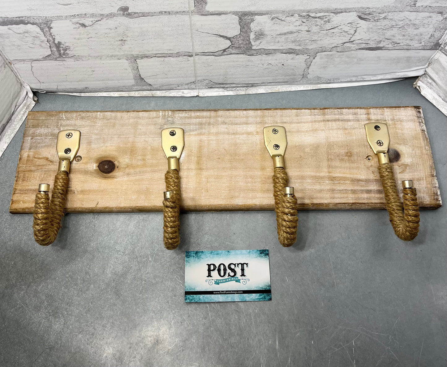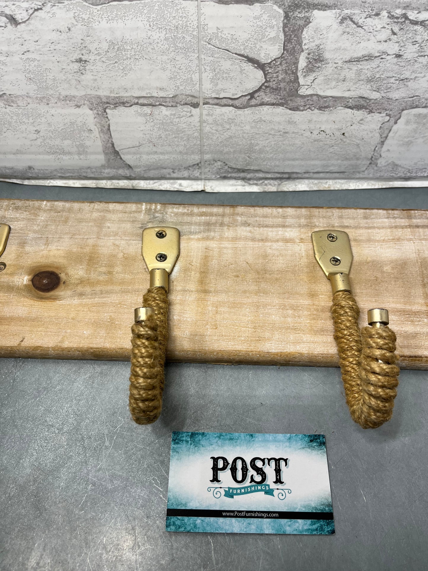 Made on a wooden backing, gold hooks wrapped with rope, four hooks, great for a lake or beach house decor, great for hanging coats, hats, leashes etc., it is 19” long, 5” wide, 4” spacing in between hooks