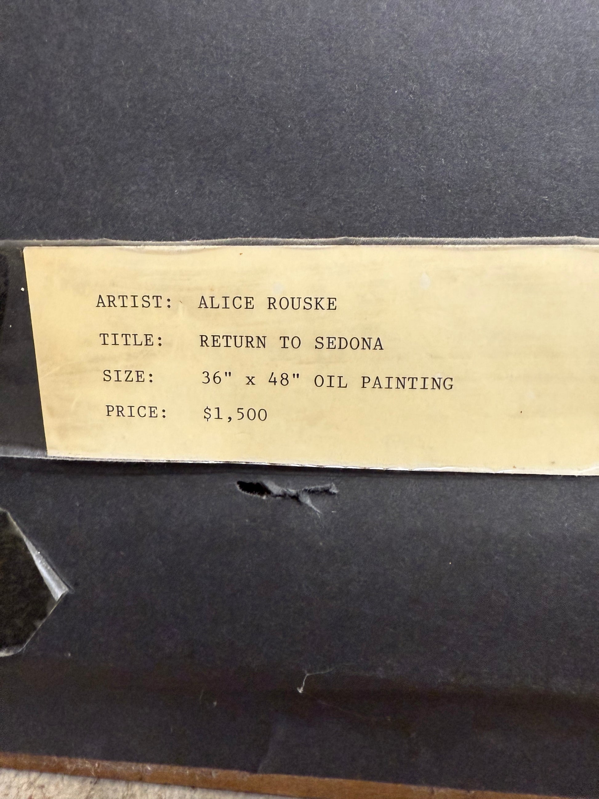 Original framed oil painting called “Return to Sedona” by Alice Rouske. 36x48” professionally framed by The Great Frame Up in Santa Fe, NM. Has a thick wire on the back for hanging on the wall.