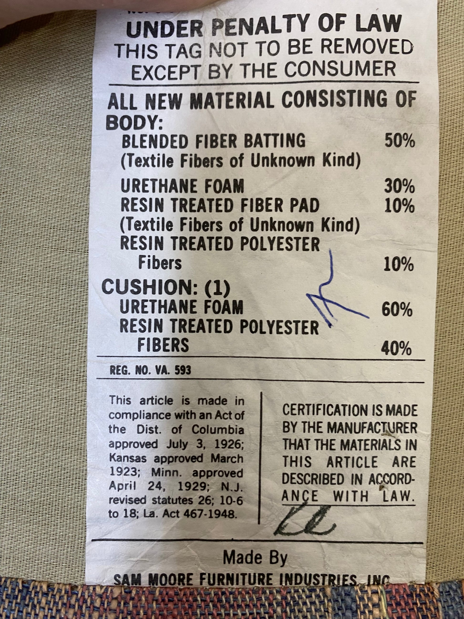 Darling vintage rocking chair. Sam Moore furniture brand name. Pink & blue plaid upholstery and cushion. This chair is SOO comfortable. Sits low to the ground and hugs you as you rock. Freshly steam cleaned but does show some fabric stretch marks on arms.